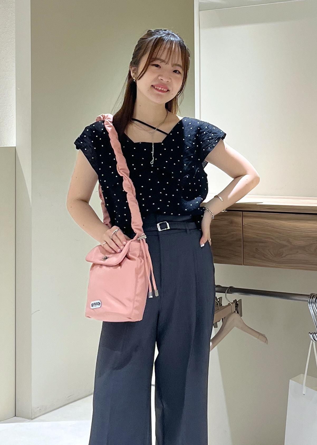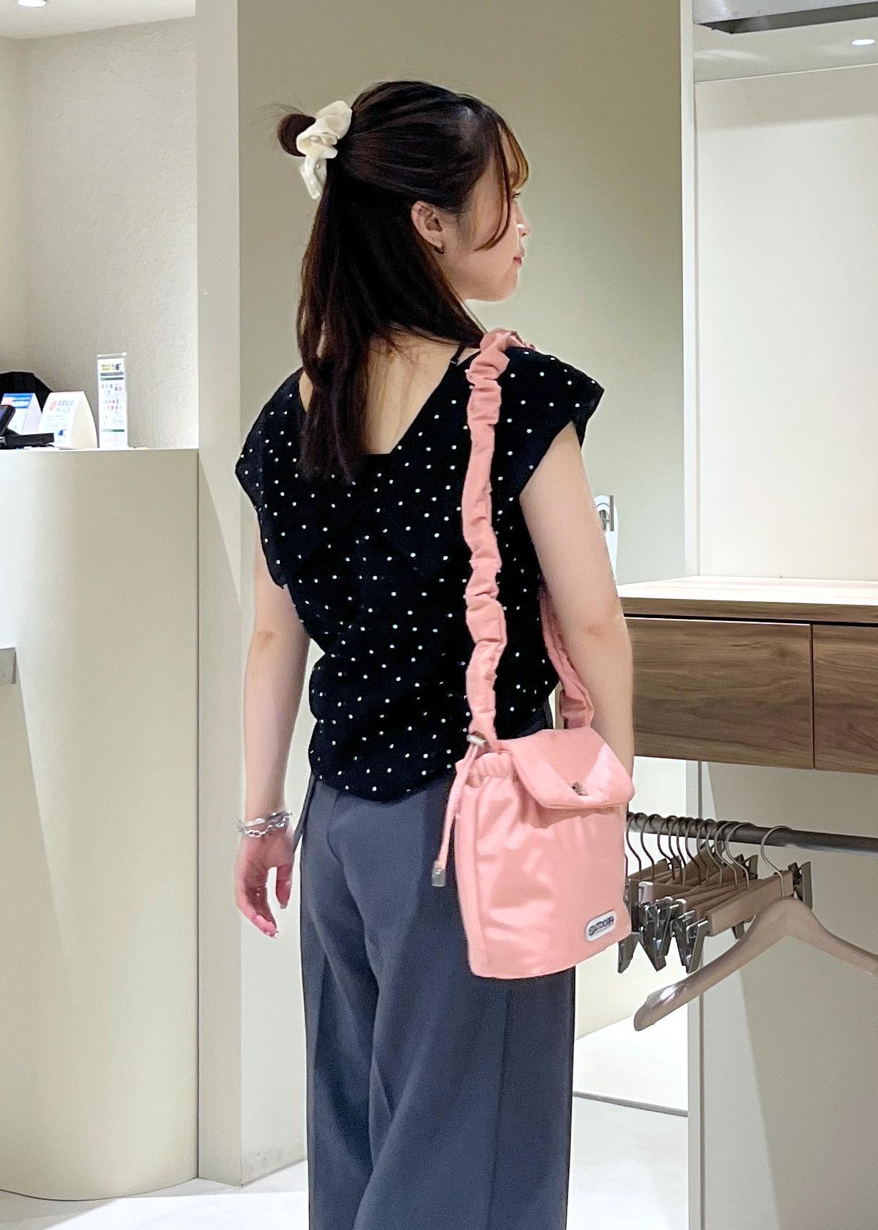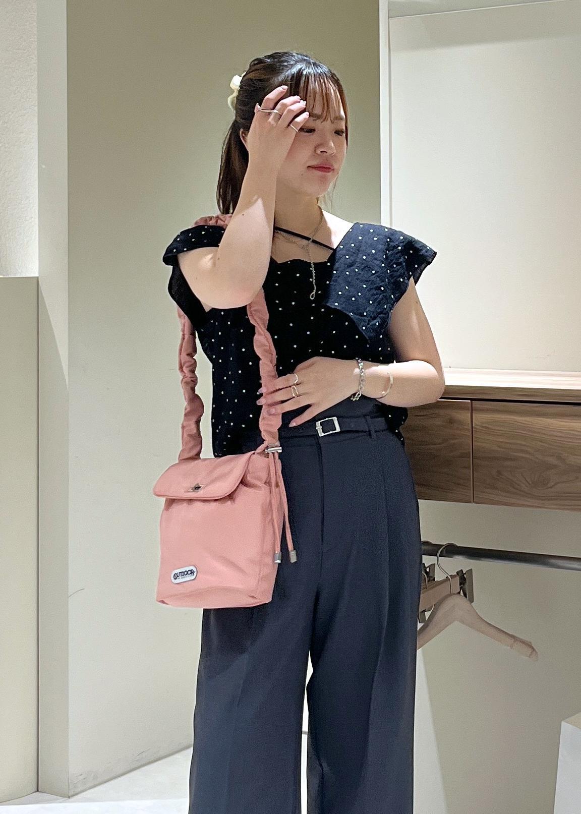 紐部分がアシンメトリーなデザインになるので、デコルテ周りがあいているトップスを着ても可愛いなと思いました☺︎ -