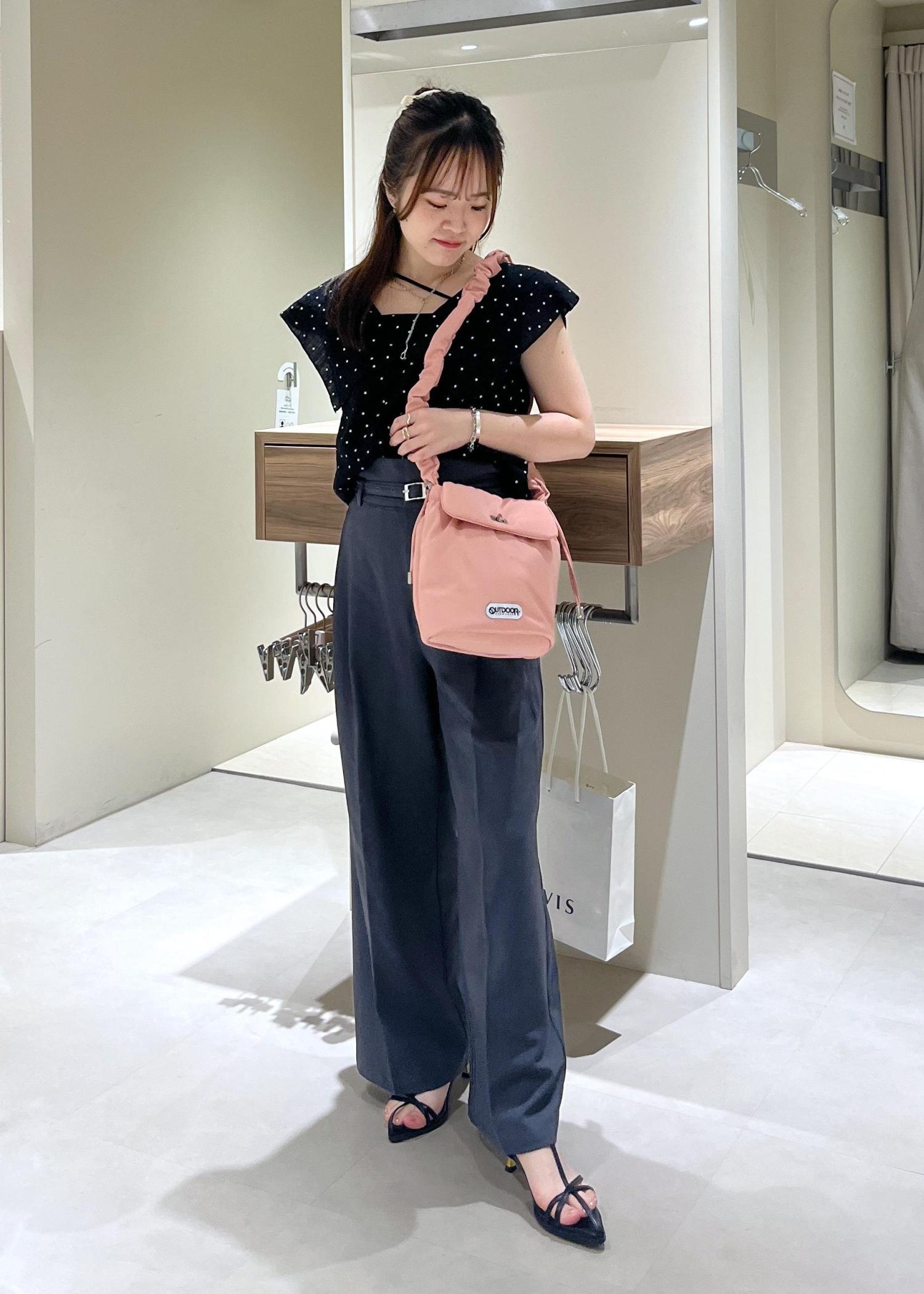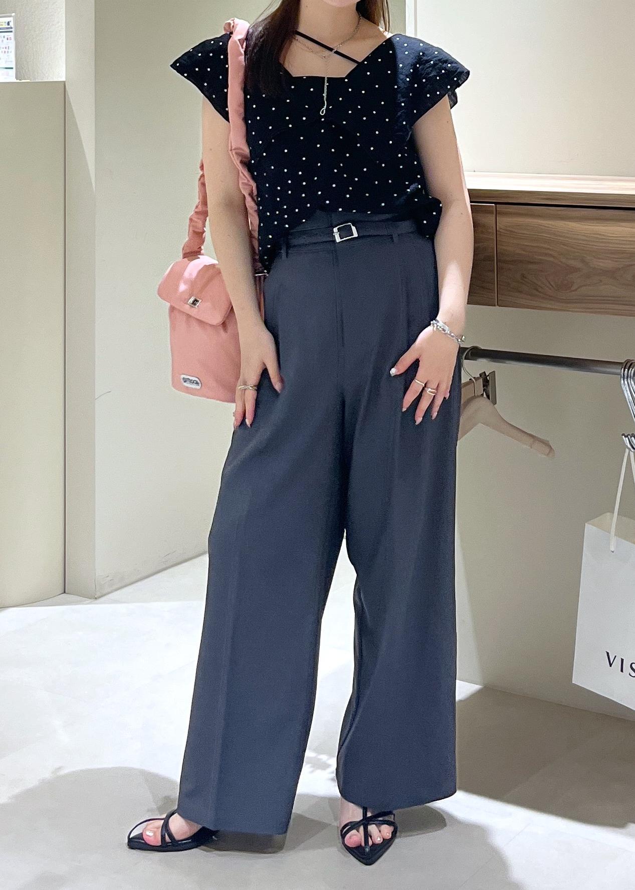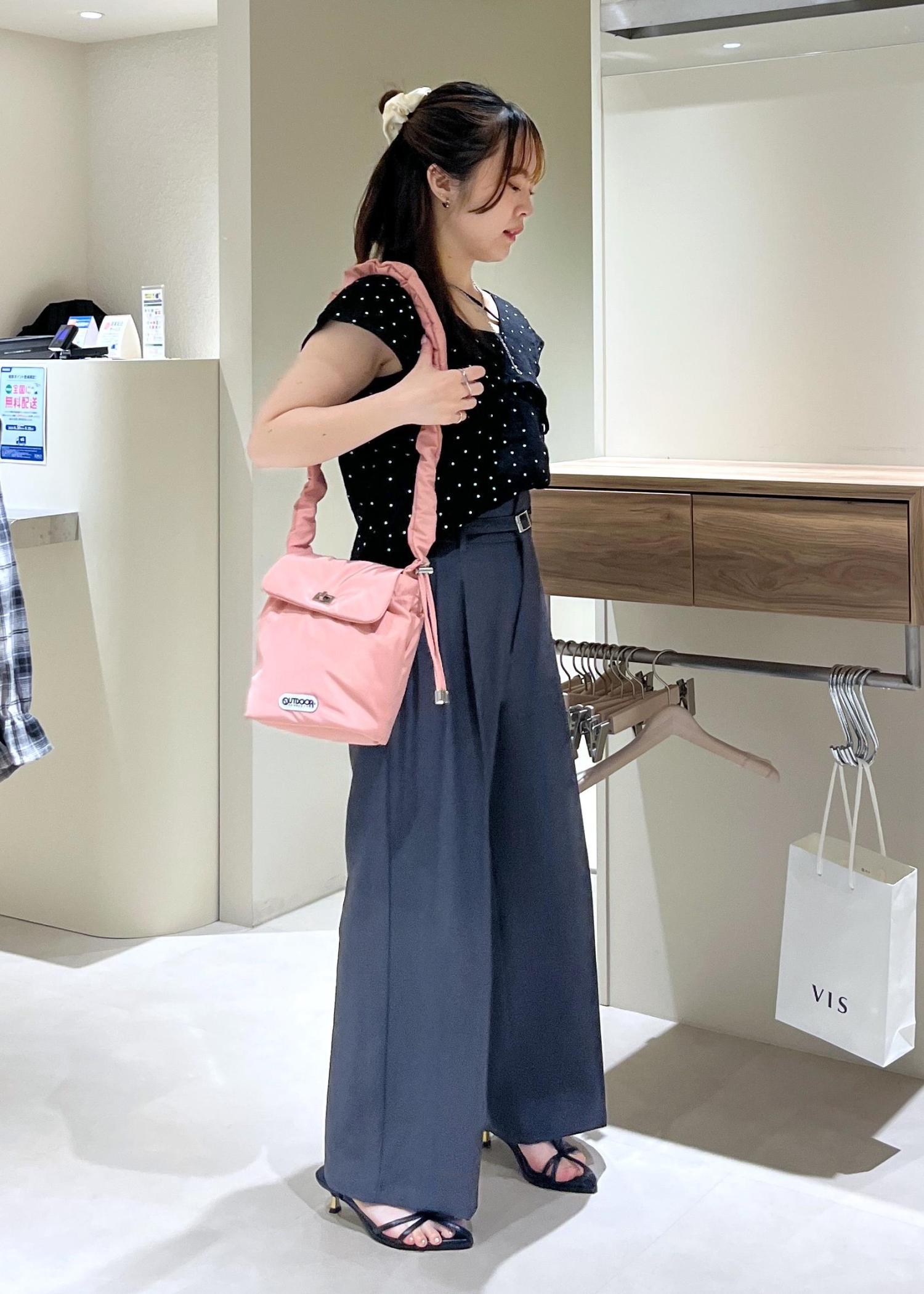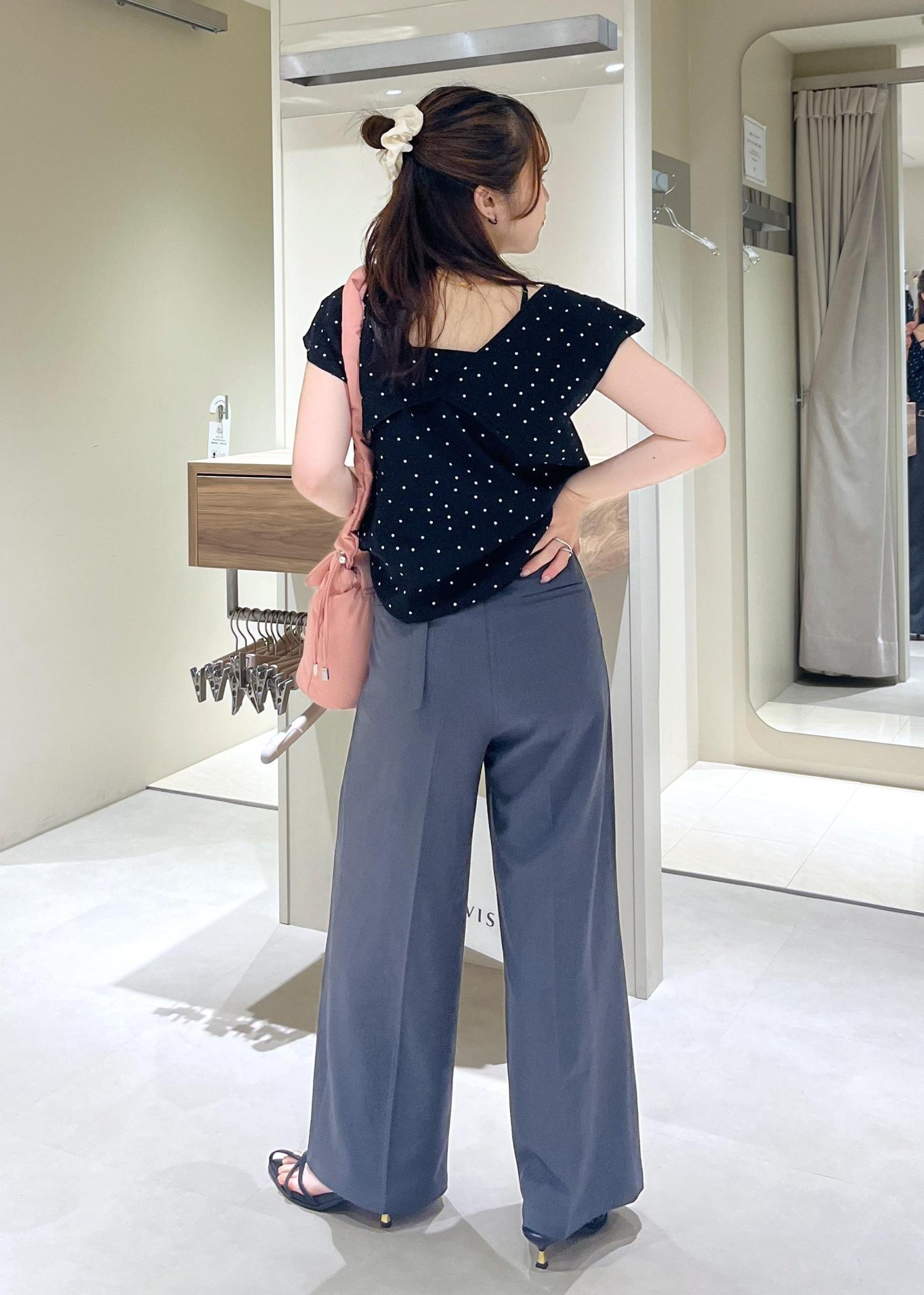 紐部分がアシンメトリーなデザインになるので、デコルテ周りがあいているトップスを着ても可愛いなと思いました☺︎ -