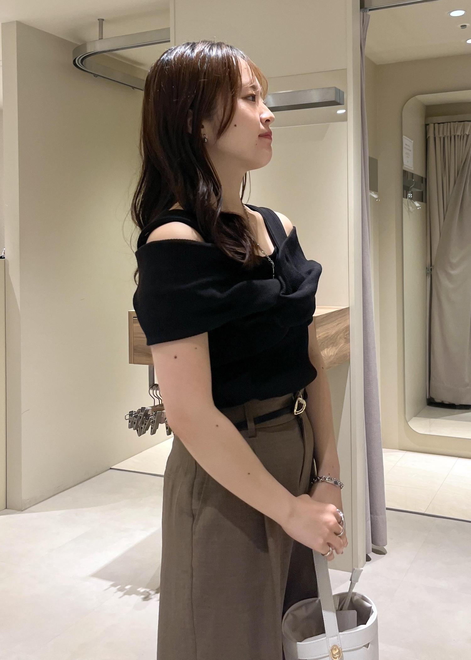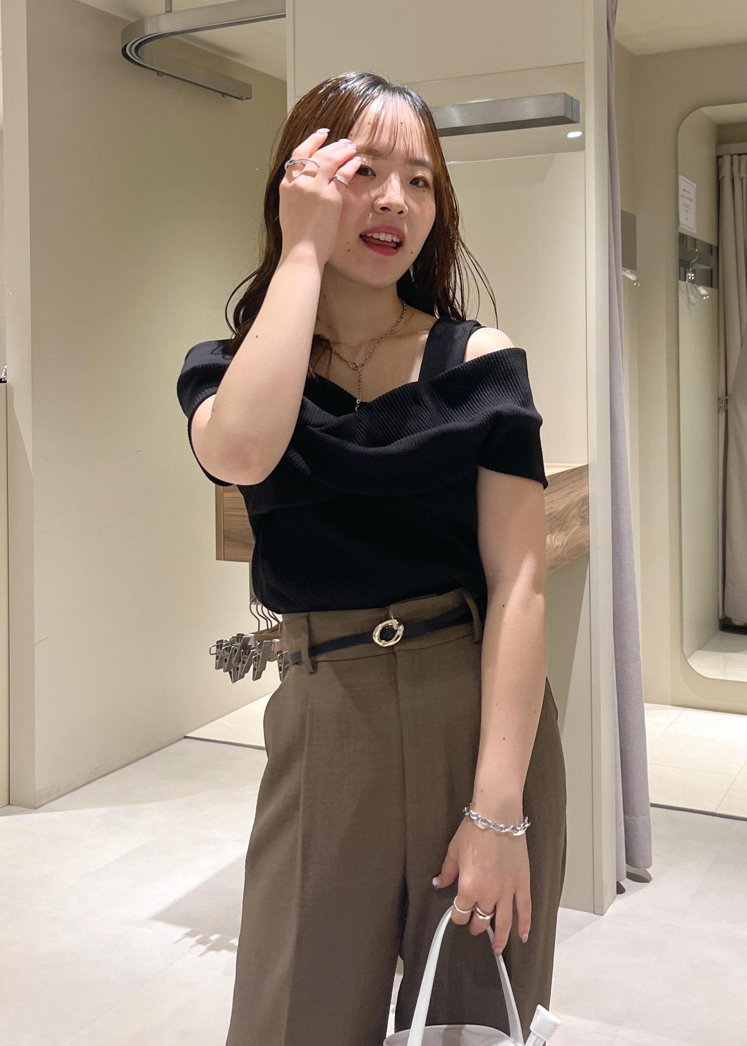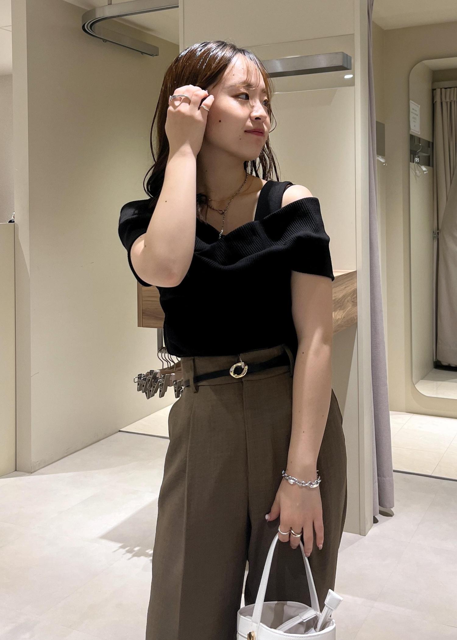 紐部分がアシンメトリーなデザインになるので、デコルテ周りがあいているトップスを着ても可愛いなと思いました☺︎ -