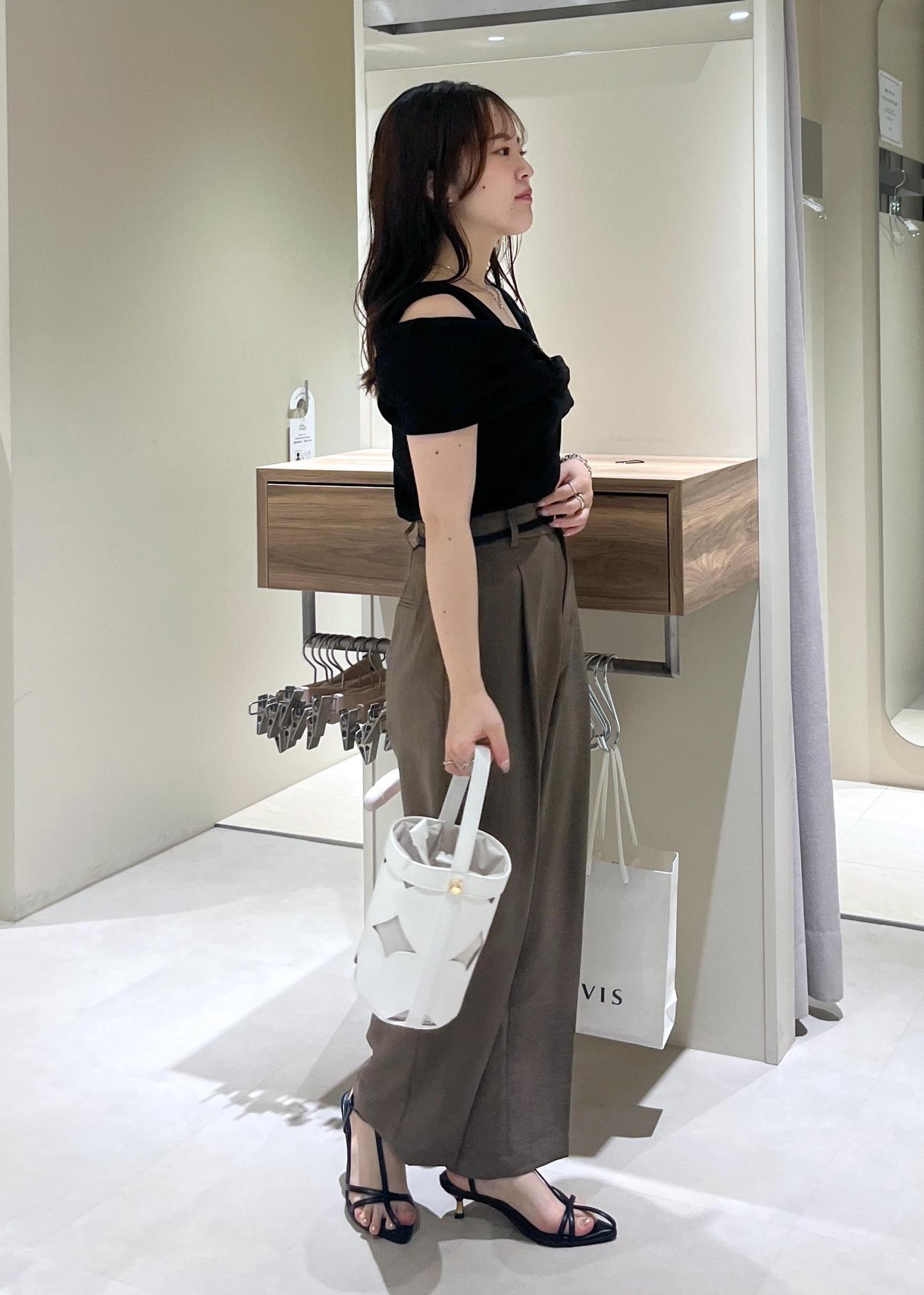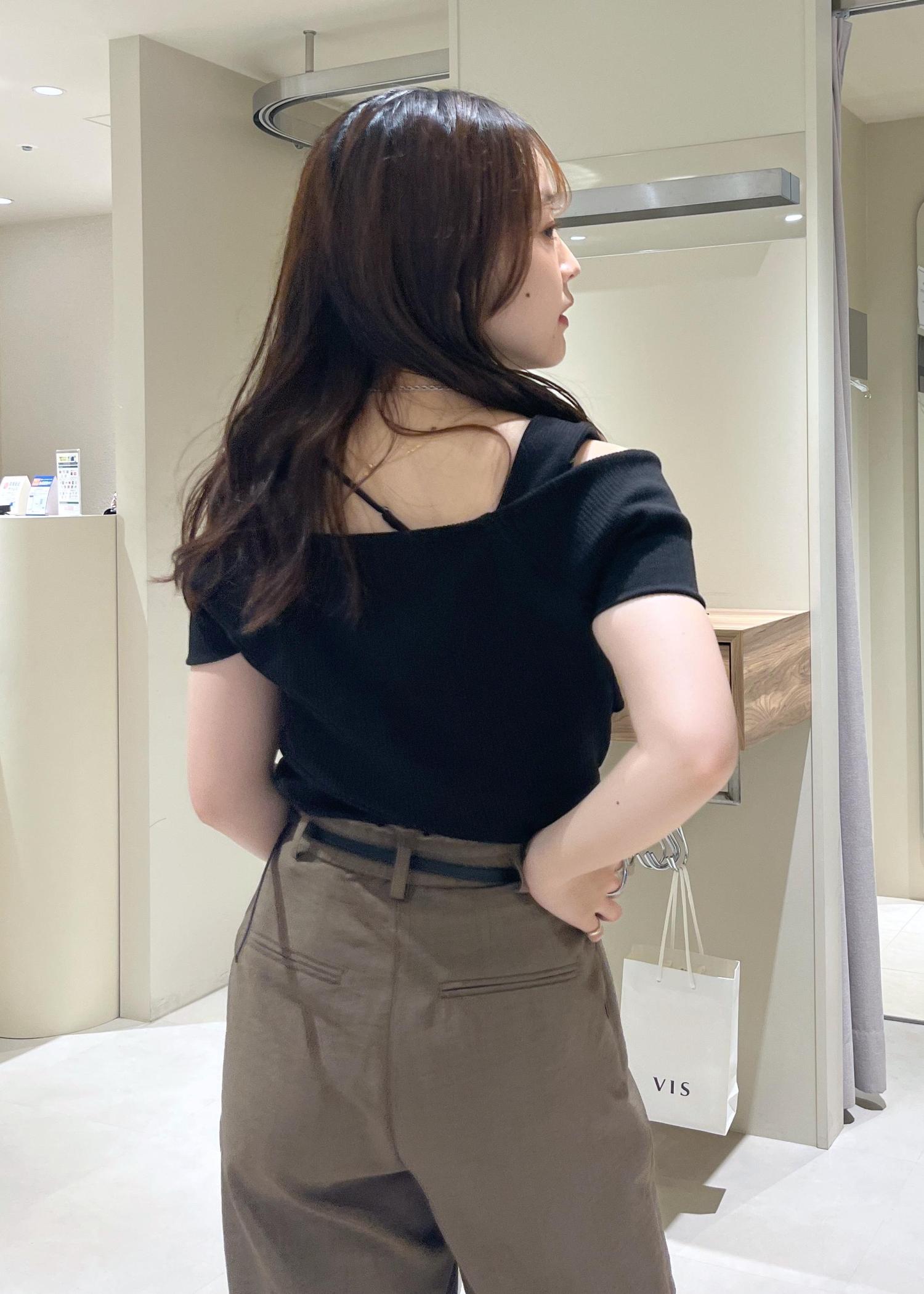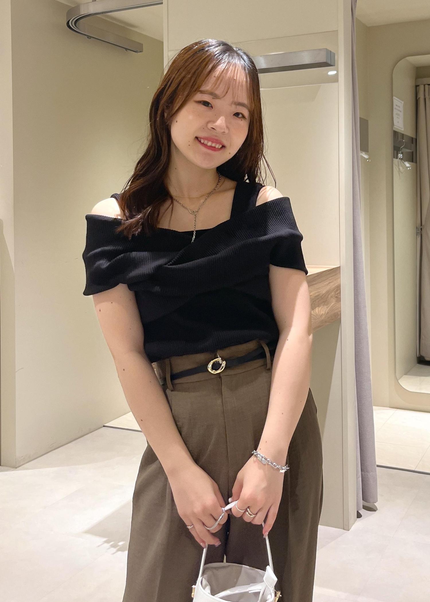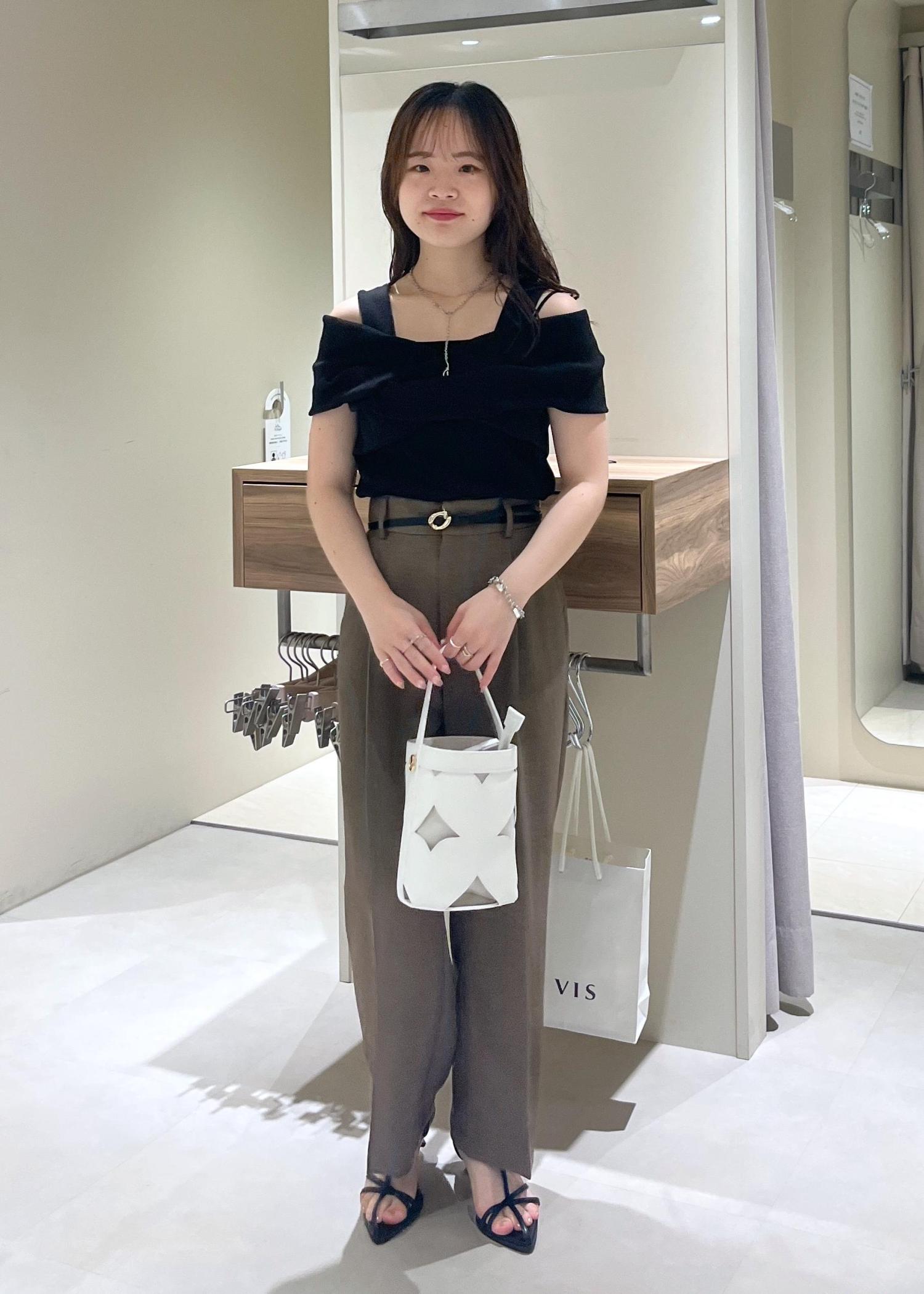 紐部分がアシンメトリーなデザインになるので、デコルテ周りがあいているトップスを着ても可愛いなと思いました☺︎ -