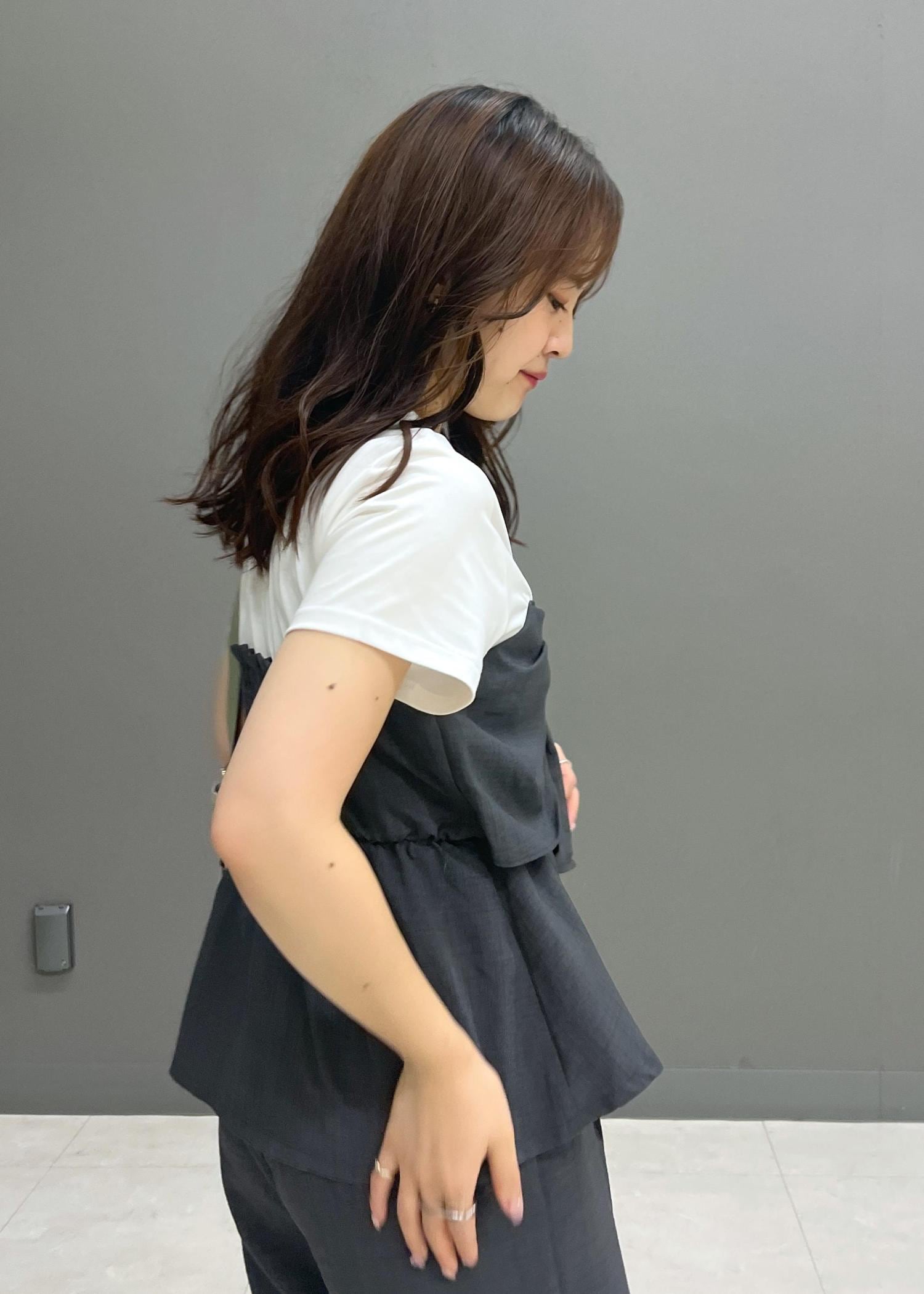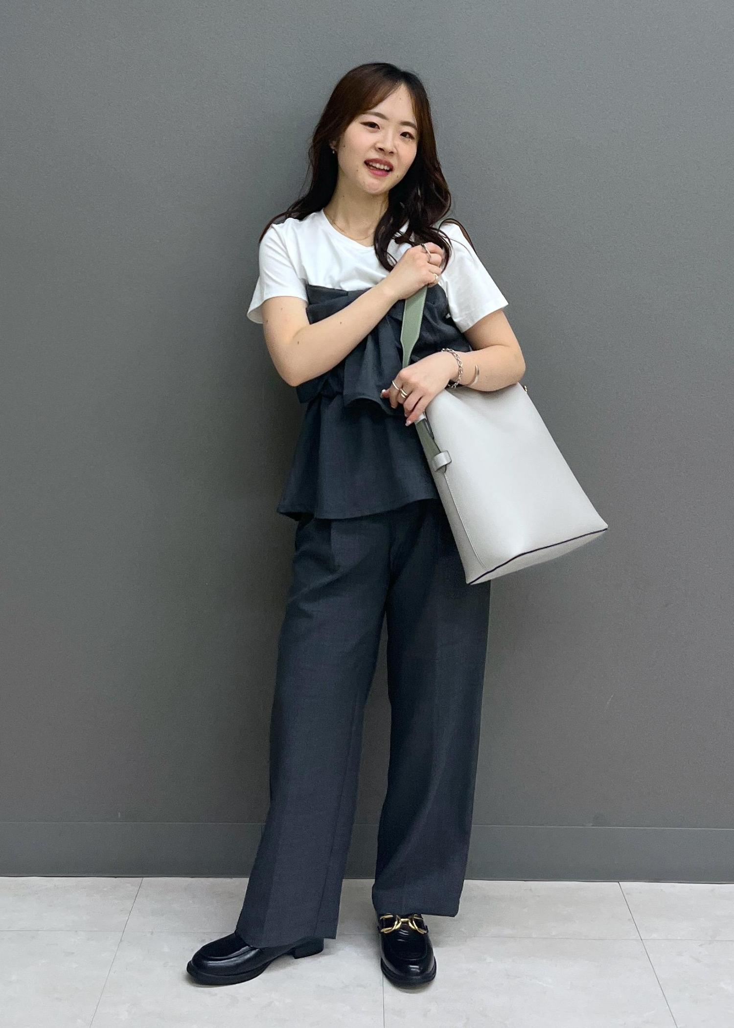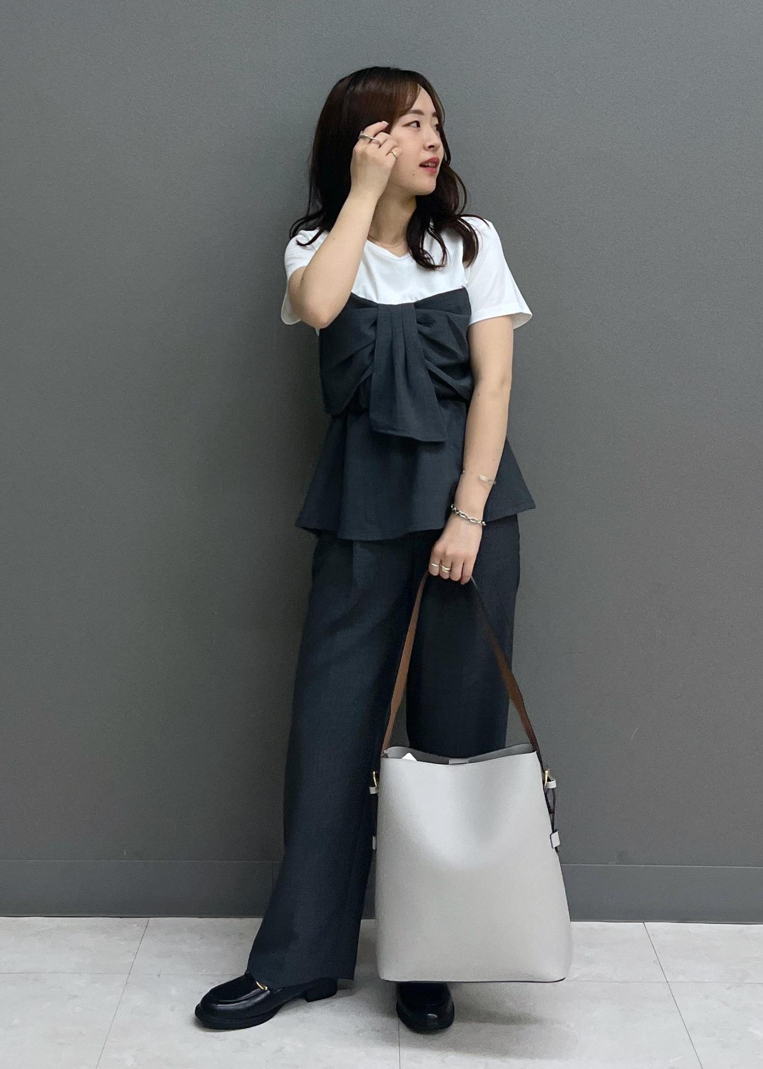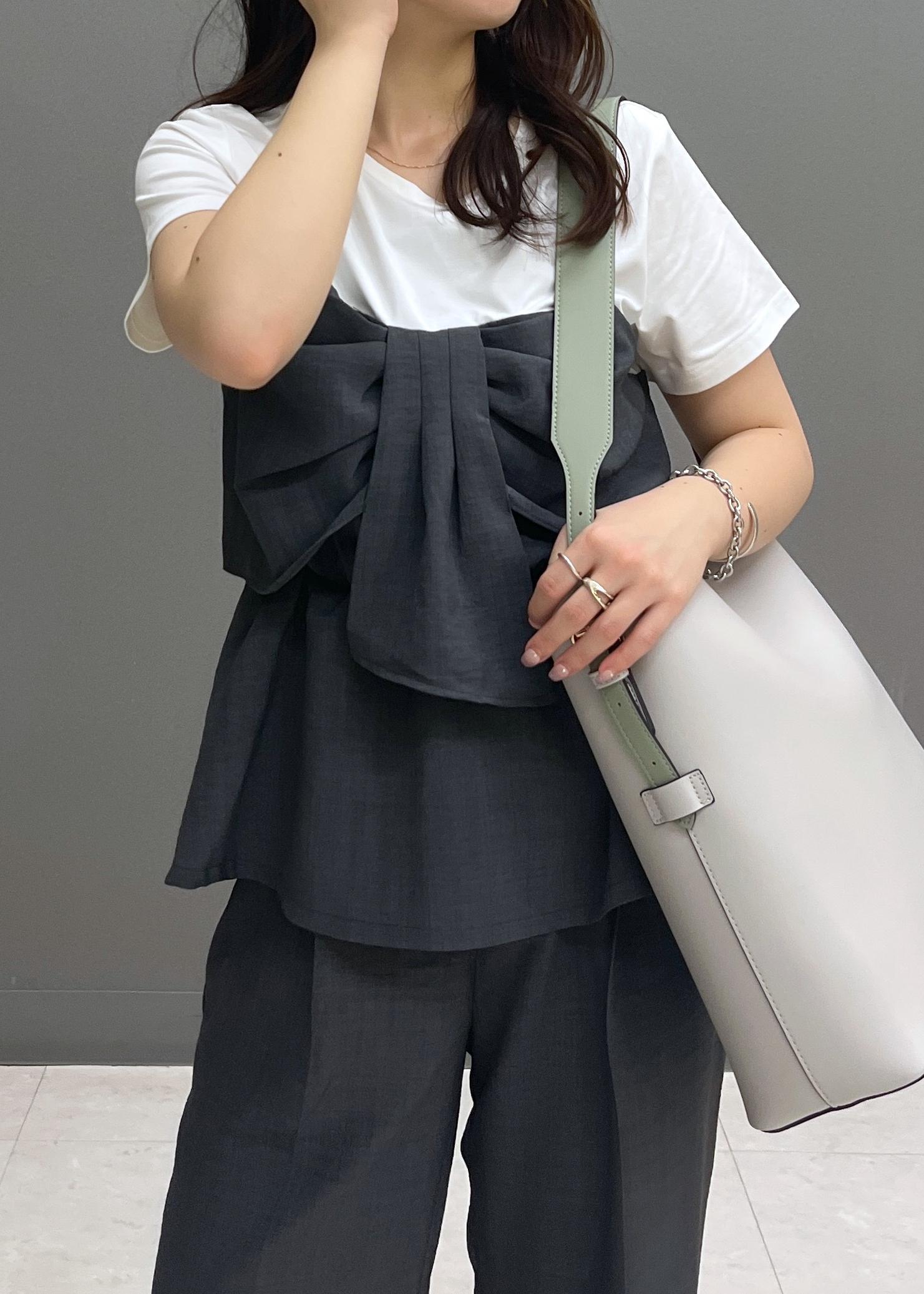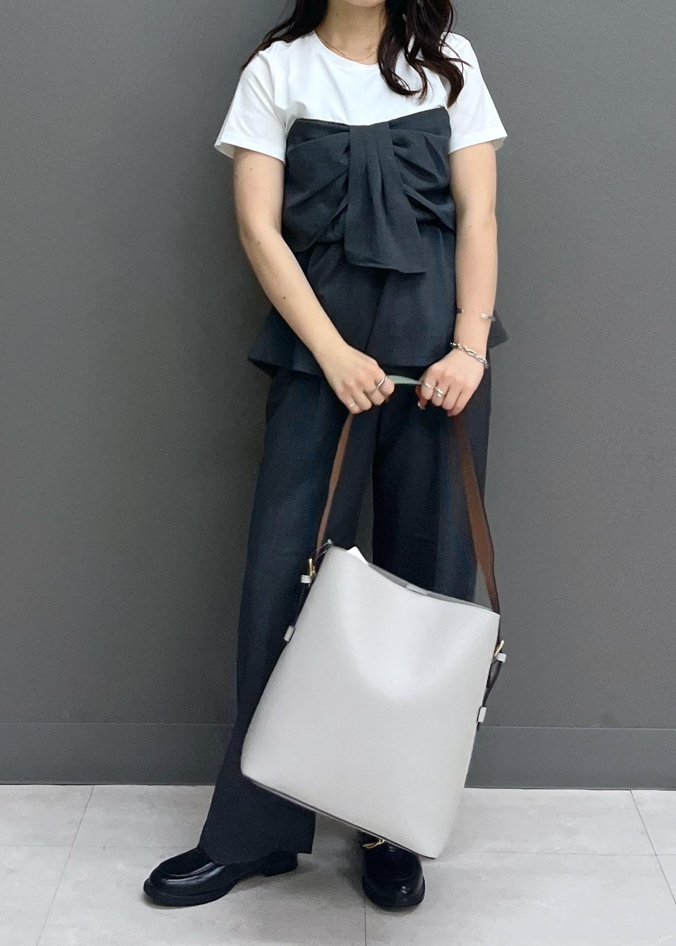 紐部分がアシンメトリーなデザインになるので、デコルテ周りがあいているトップスを着ても可愛いなと思いました☺︎
