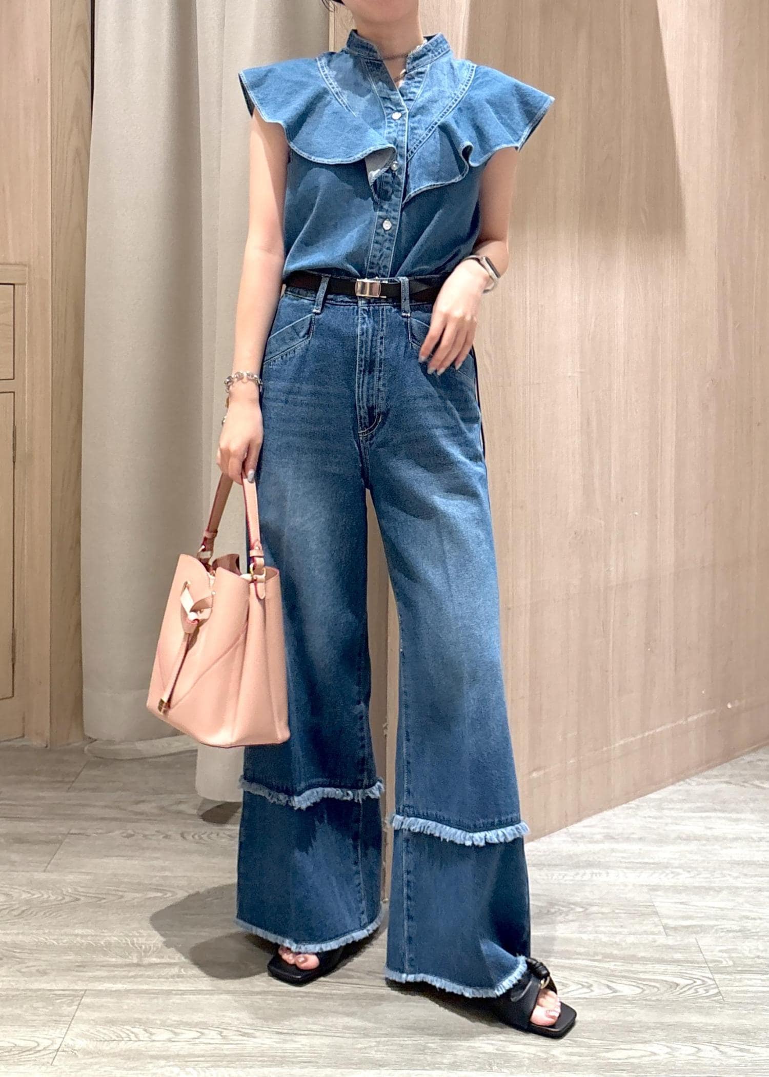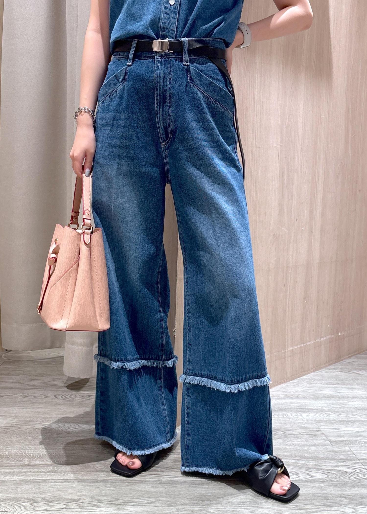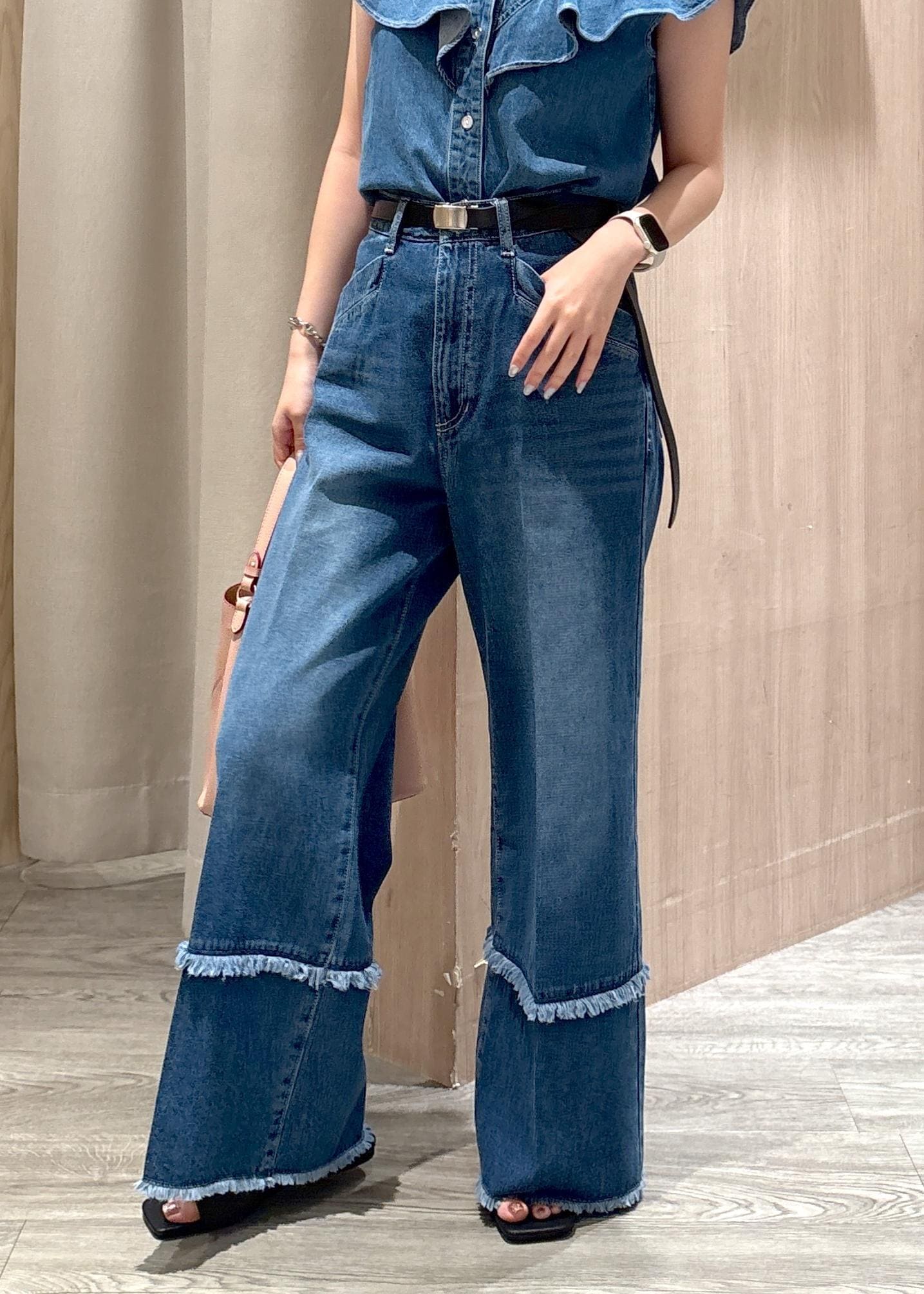 VISフリンジフレアデニムブルー系 / S¥4,395レビューSサイズで靴無しでも下にギリギリ付かない丈の長さです。綺麗なワイドタイプで、体のラインも拾わず、とてもスタイル良く見せてくれます◎