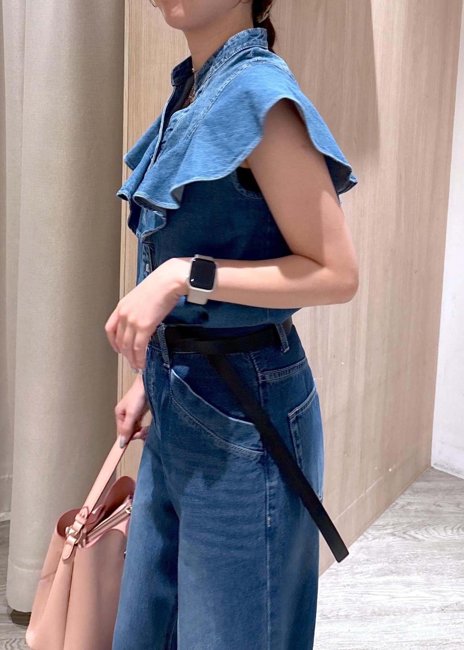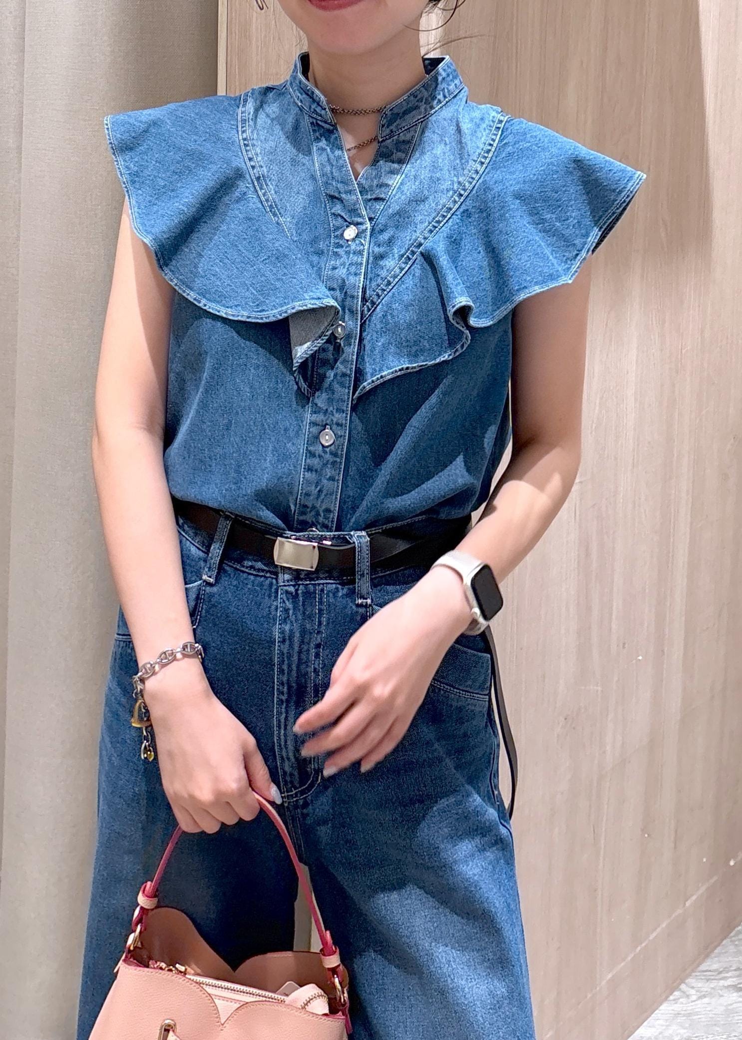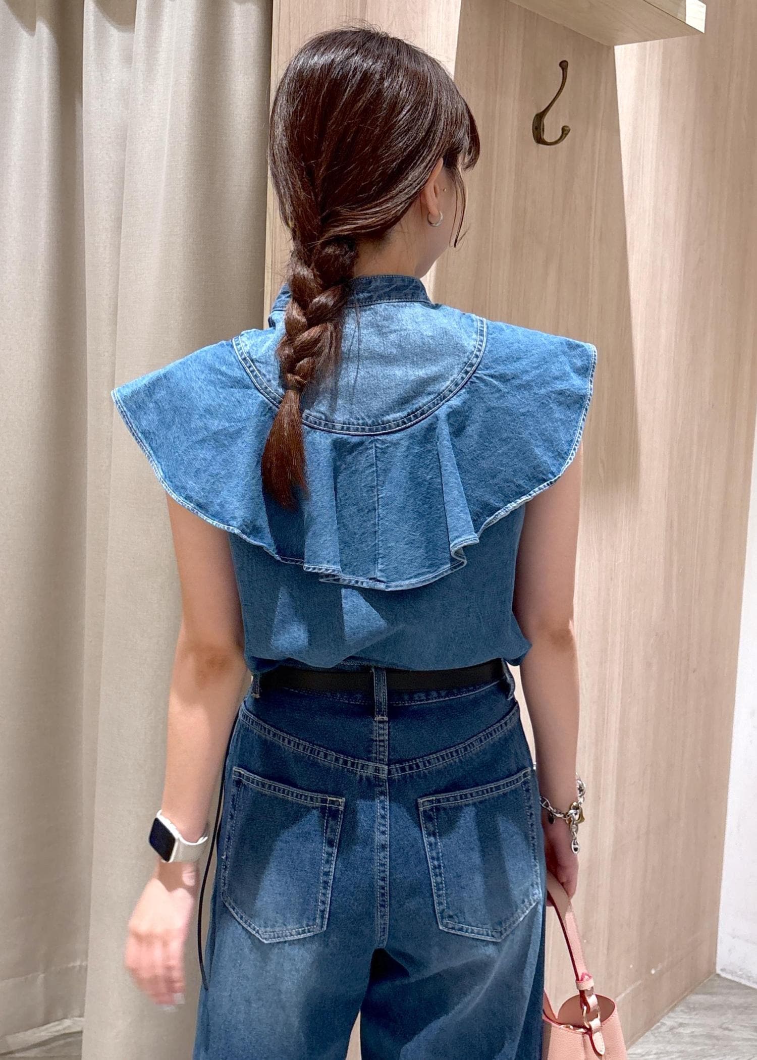 VIS【UVケア/洗える】ラッフルデザインデニムブラウスブルー系 / F¥3,953レビュー胸元にボリュームのあるデザインですが、首元が大きく空いているので、そこまで気になりません◎