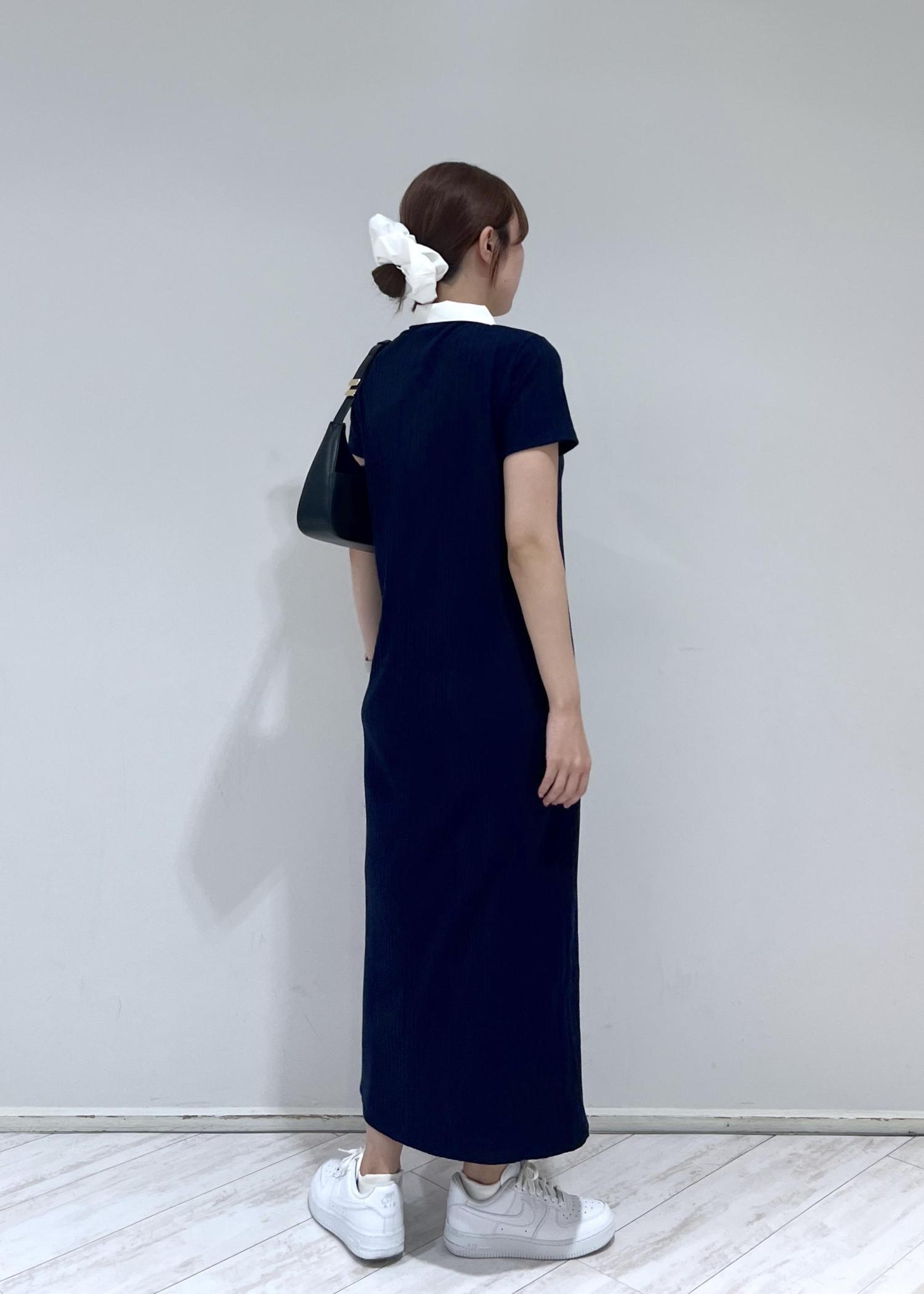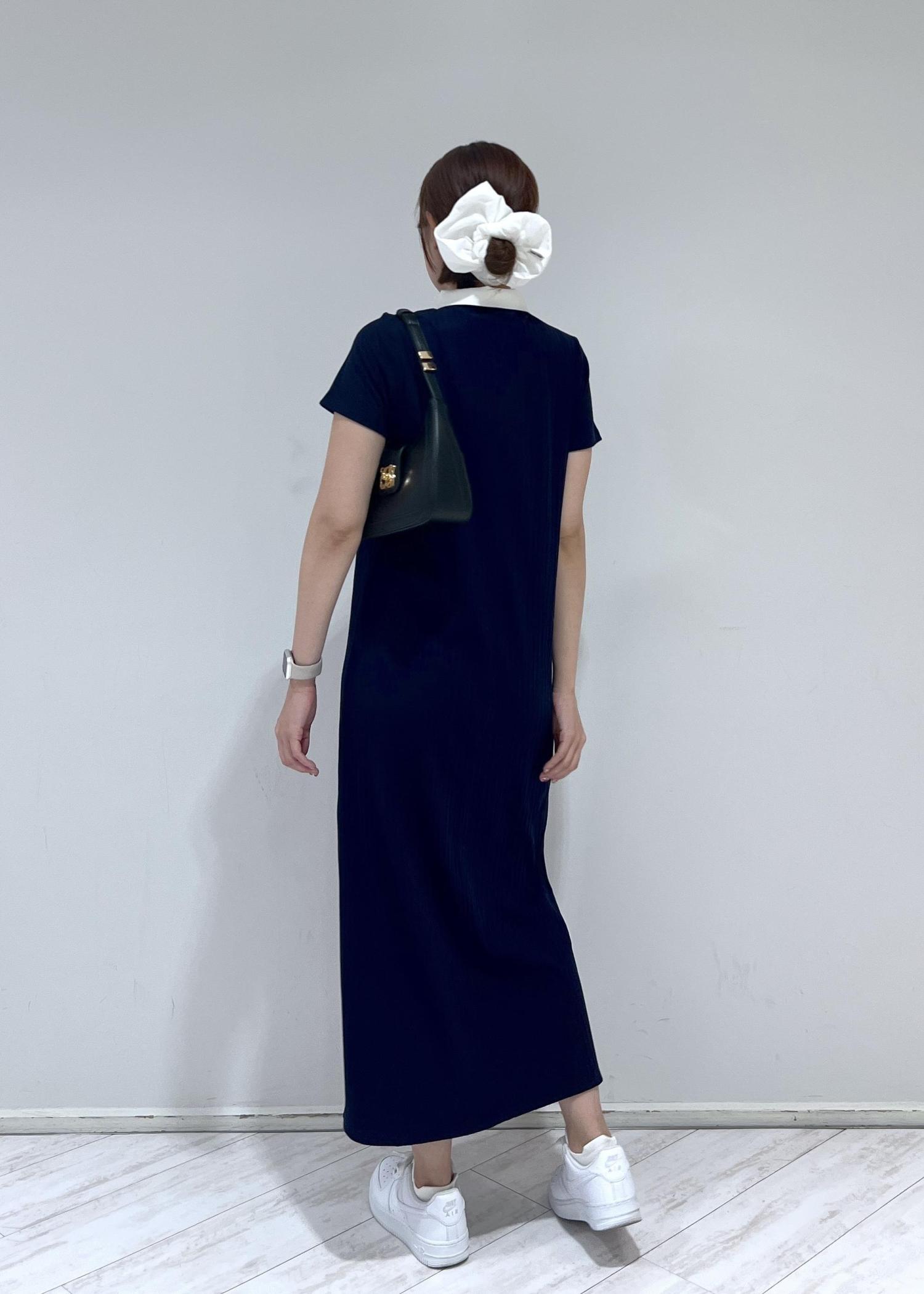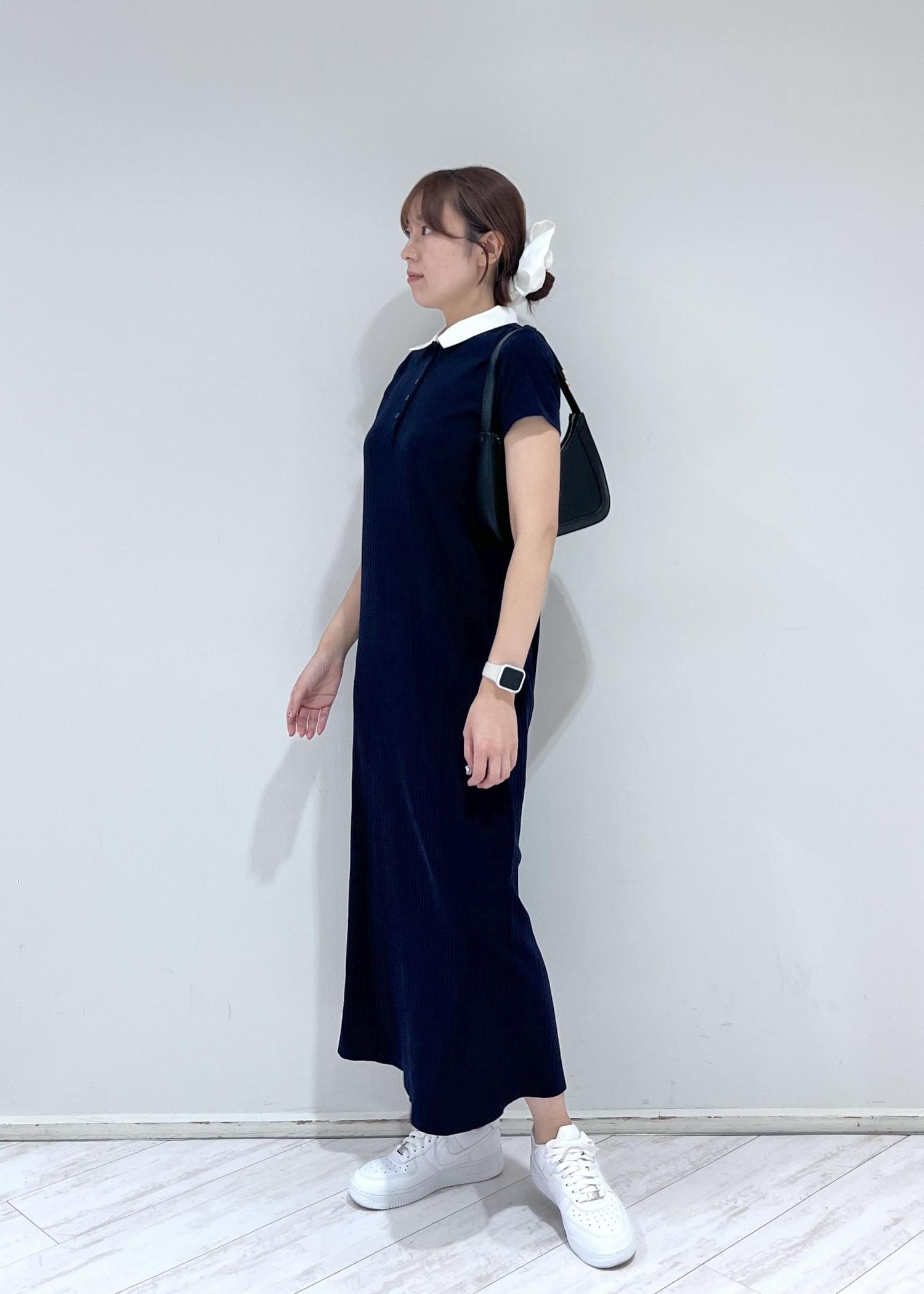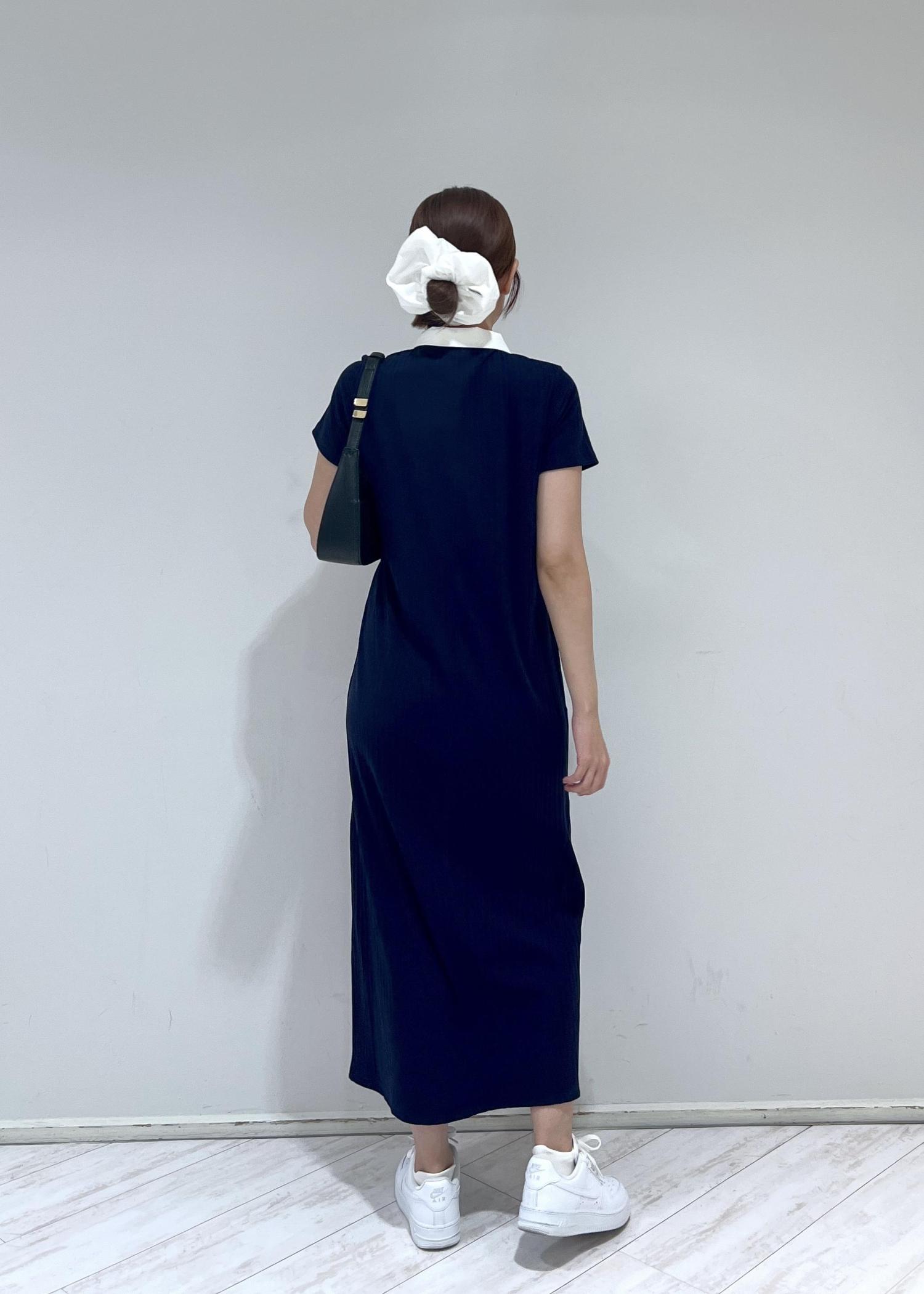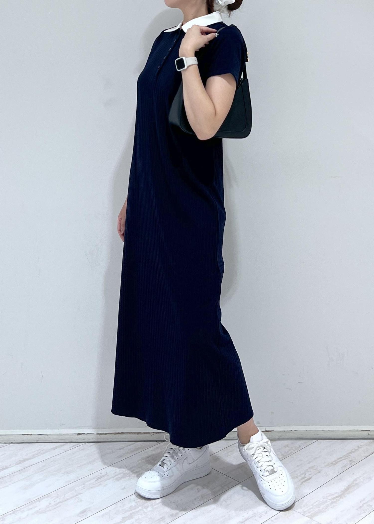 VISポロ衿ランダムリブワンピースネイビー系 / F¥4,612レビュータイトに見えますが余裕のあるサイズなので、体型カバーしてくれます!身長164cmでくるぶしの約10cmほど上にくる丈でした。