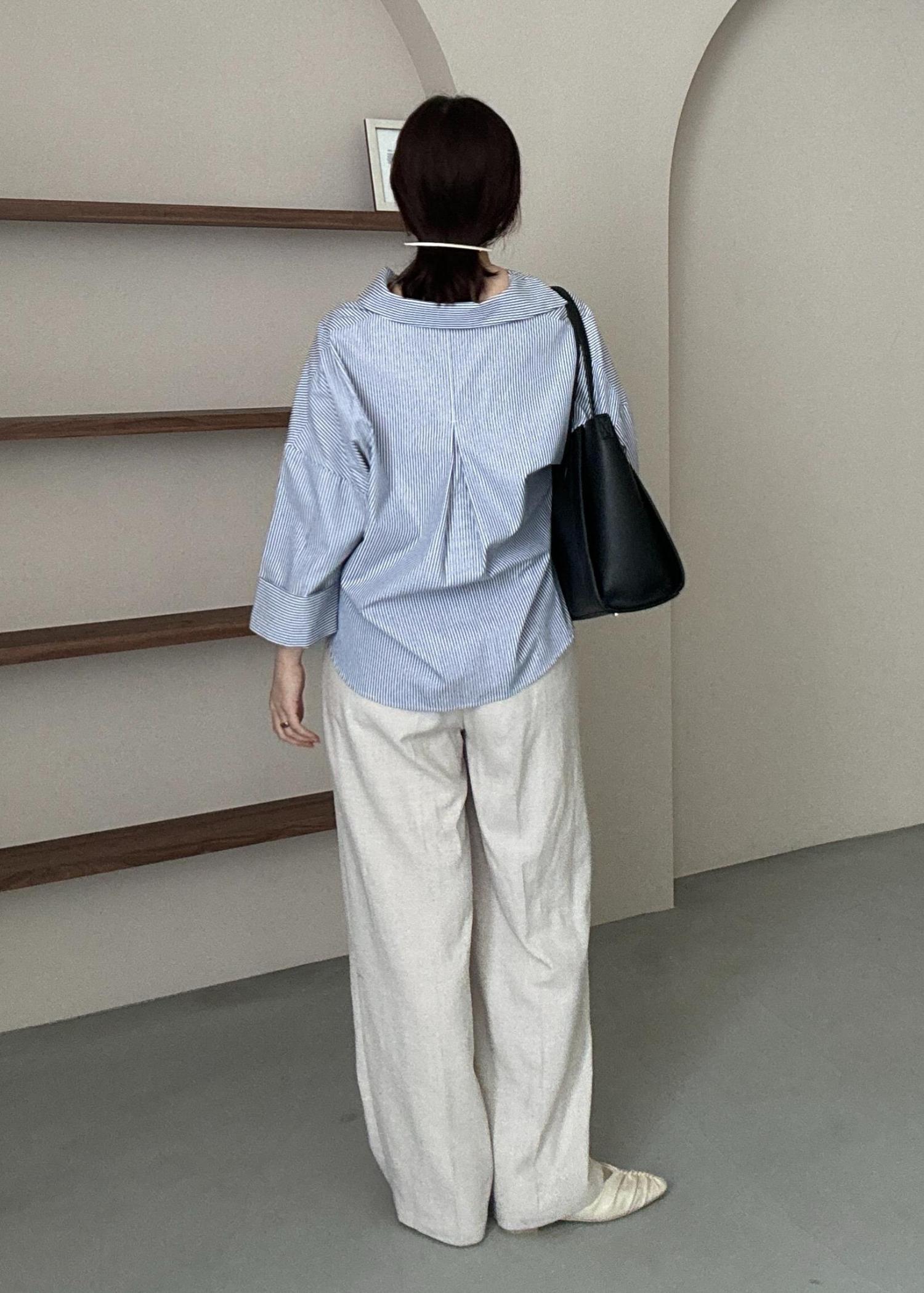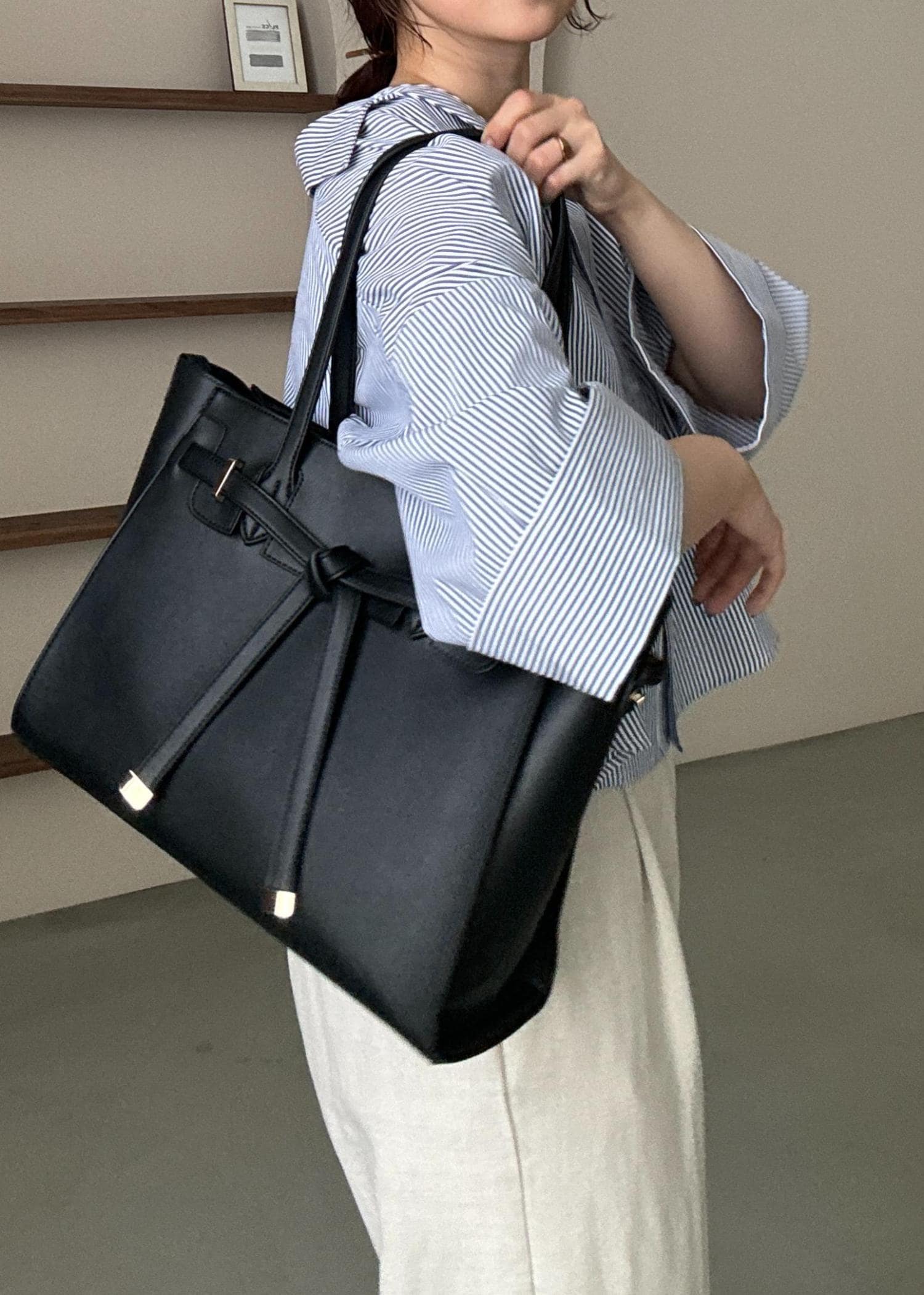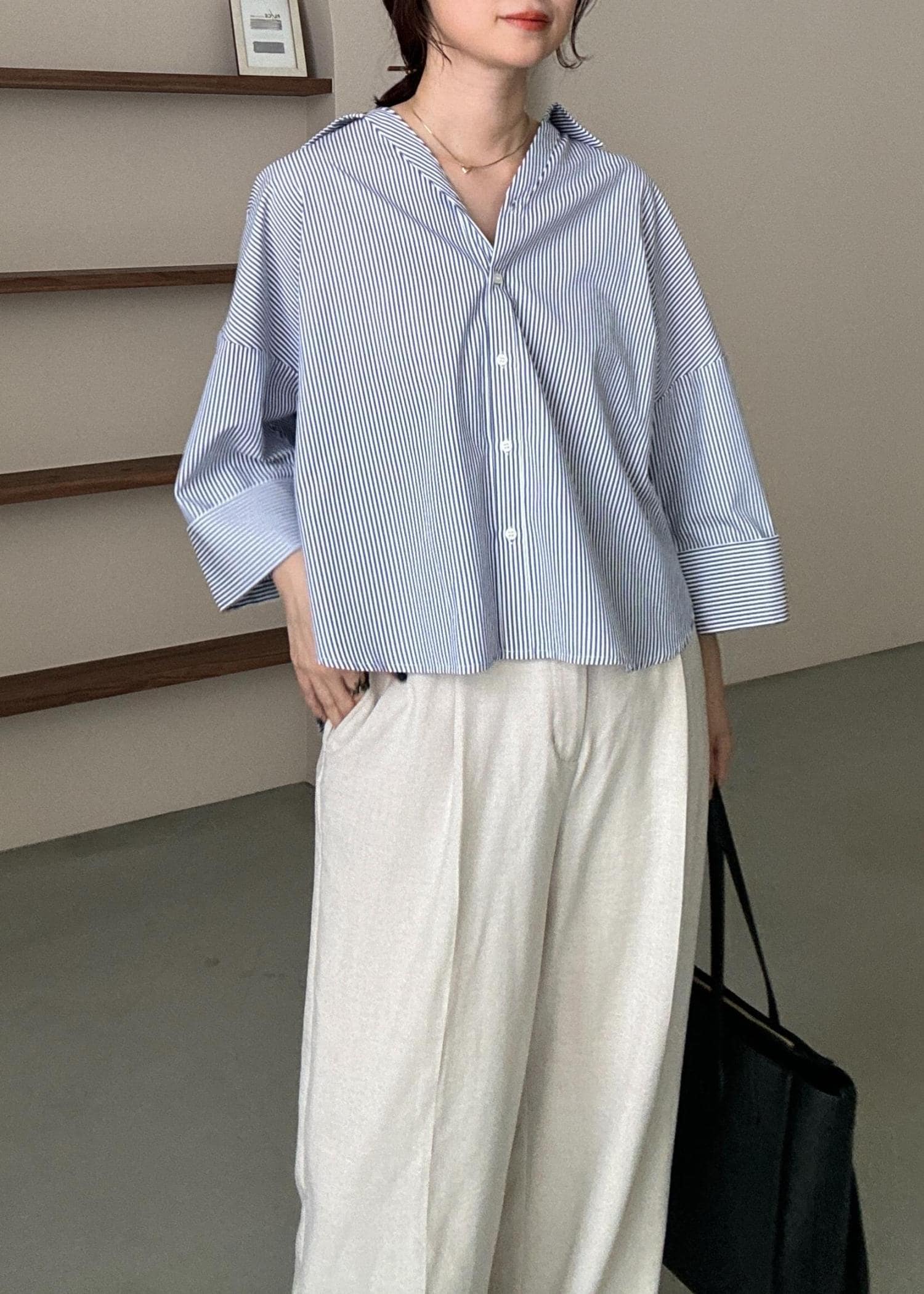ブルーのストライプシャツはオーバーサイズで、ワイドパンツを合わせ、通勤にも使いやすいサイズのバックで、きちんと感もあるきれいめコーデに◎