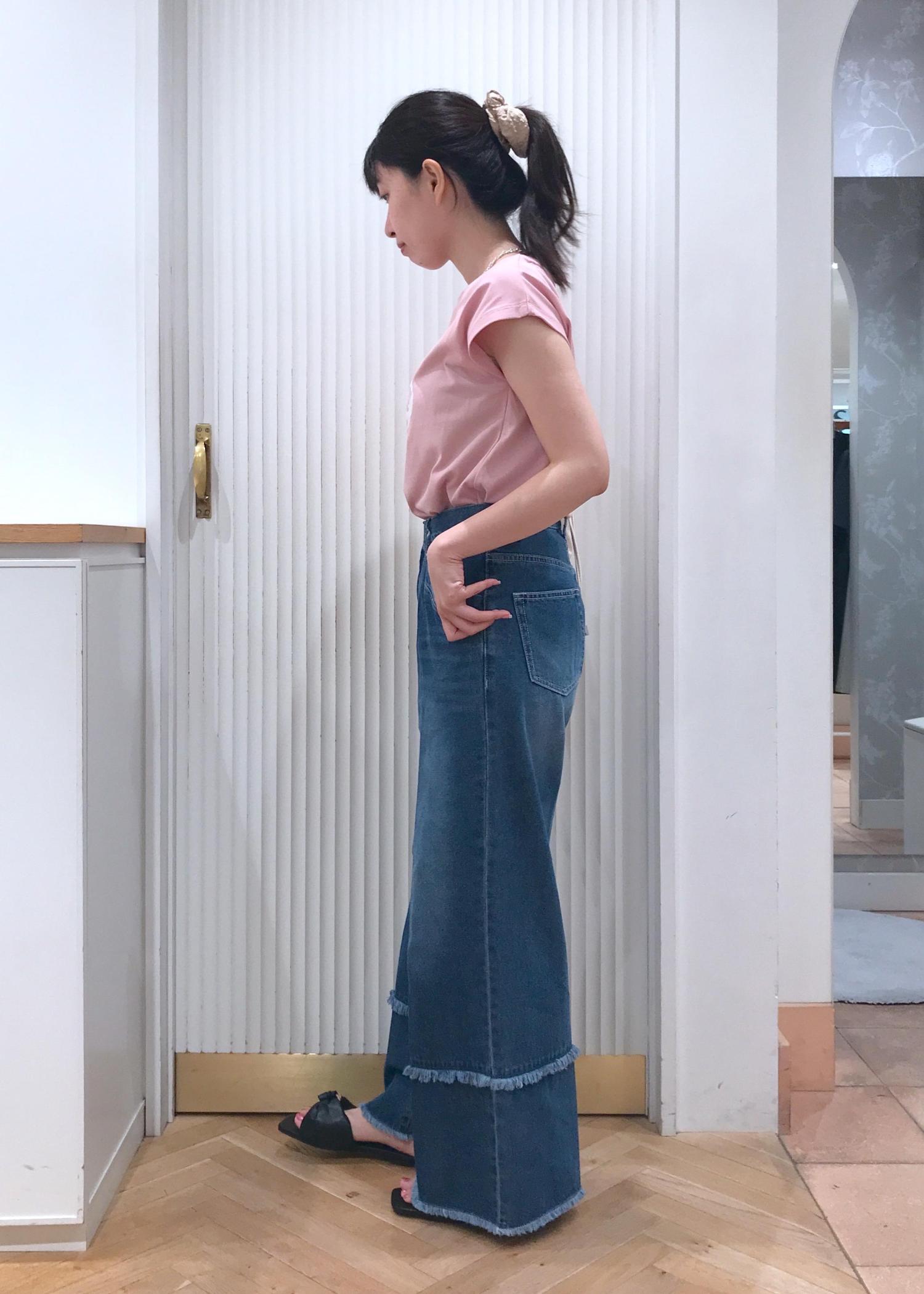 足のラインは出ないフレアパンツですが、柔らかく動きやすいデニムです。 -