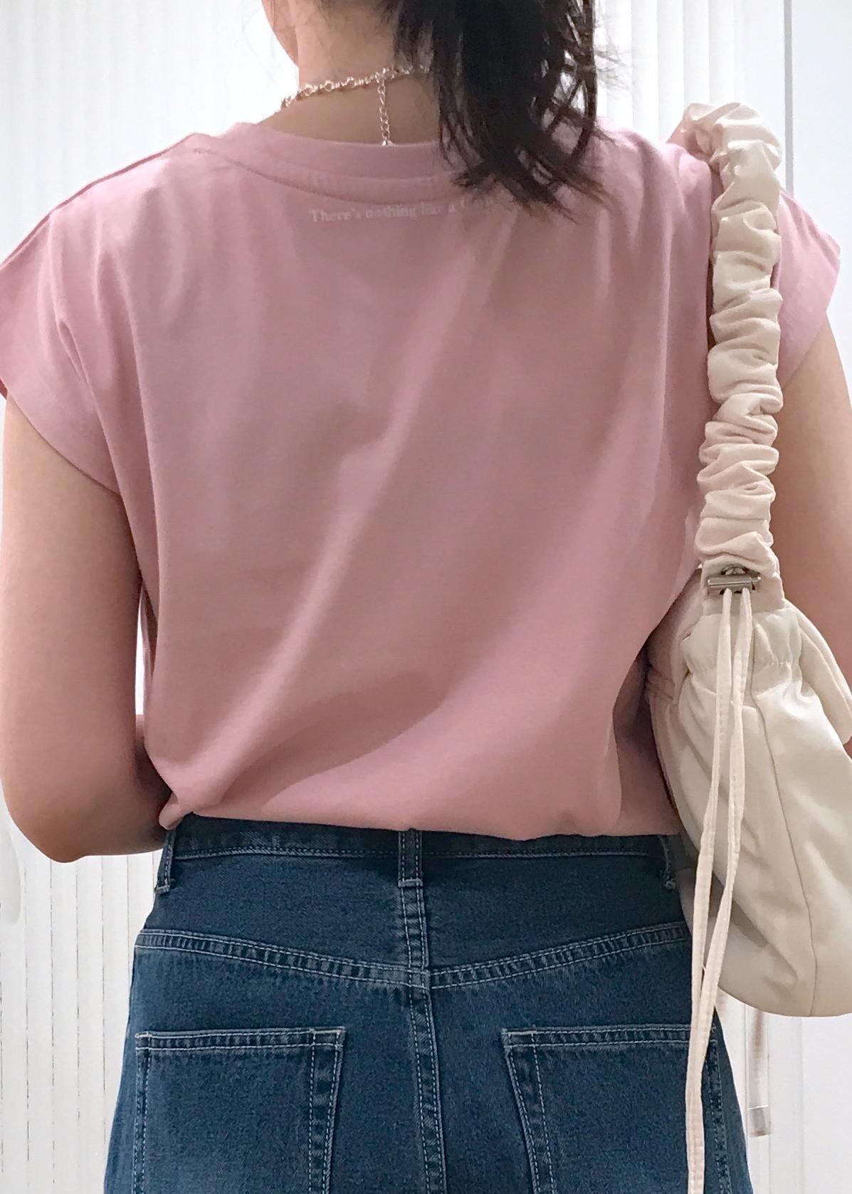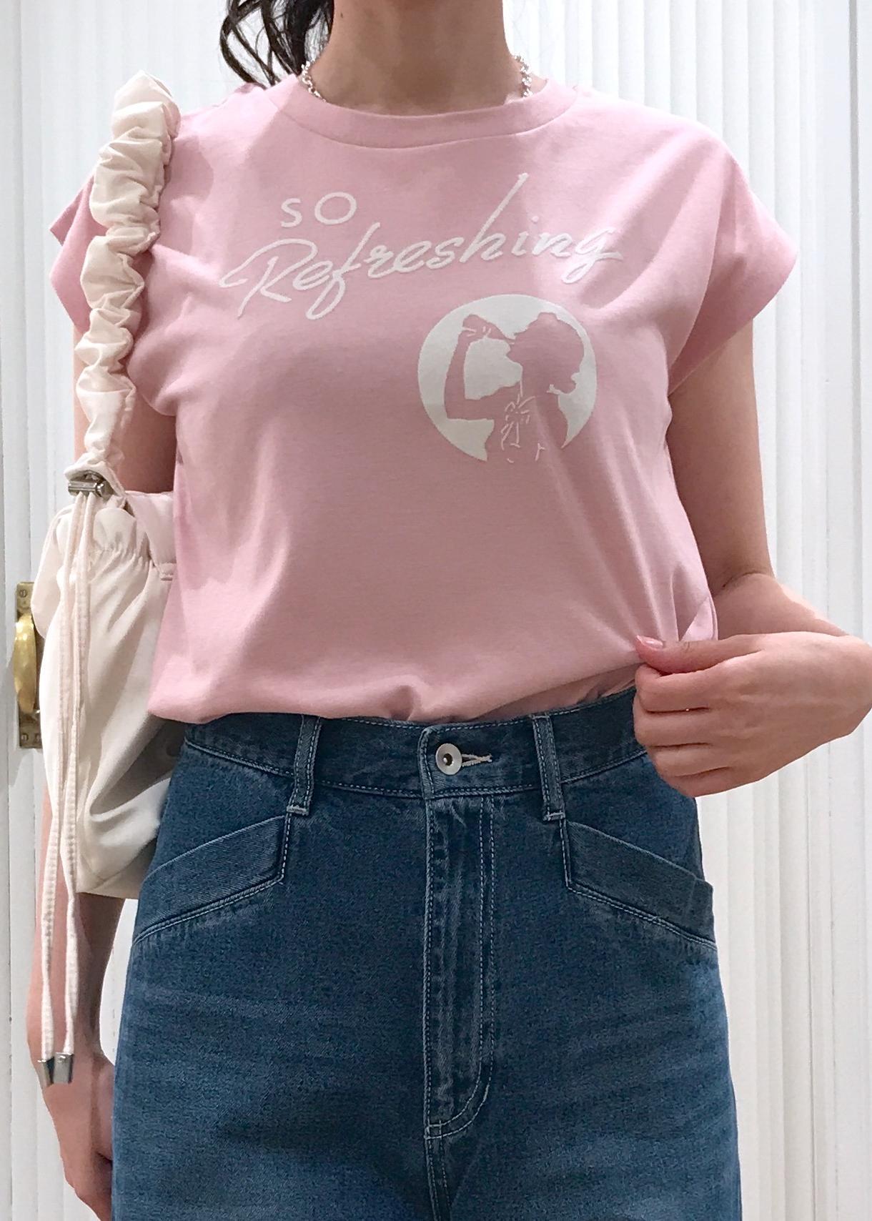 ピンクのフレンチ袖のTシャツとデニムパンツを合わせたカジュアルコーデです。