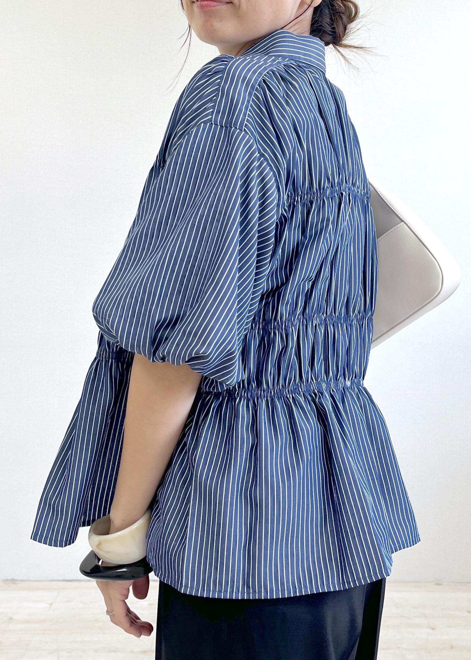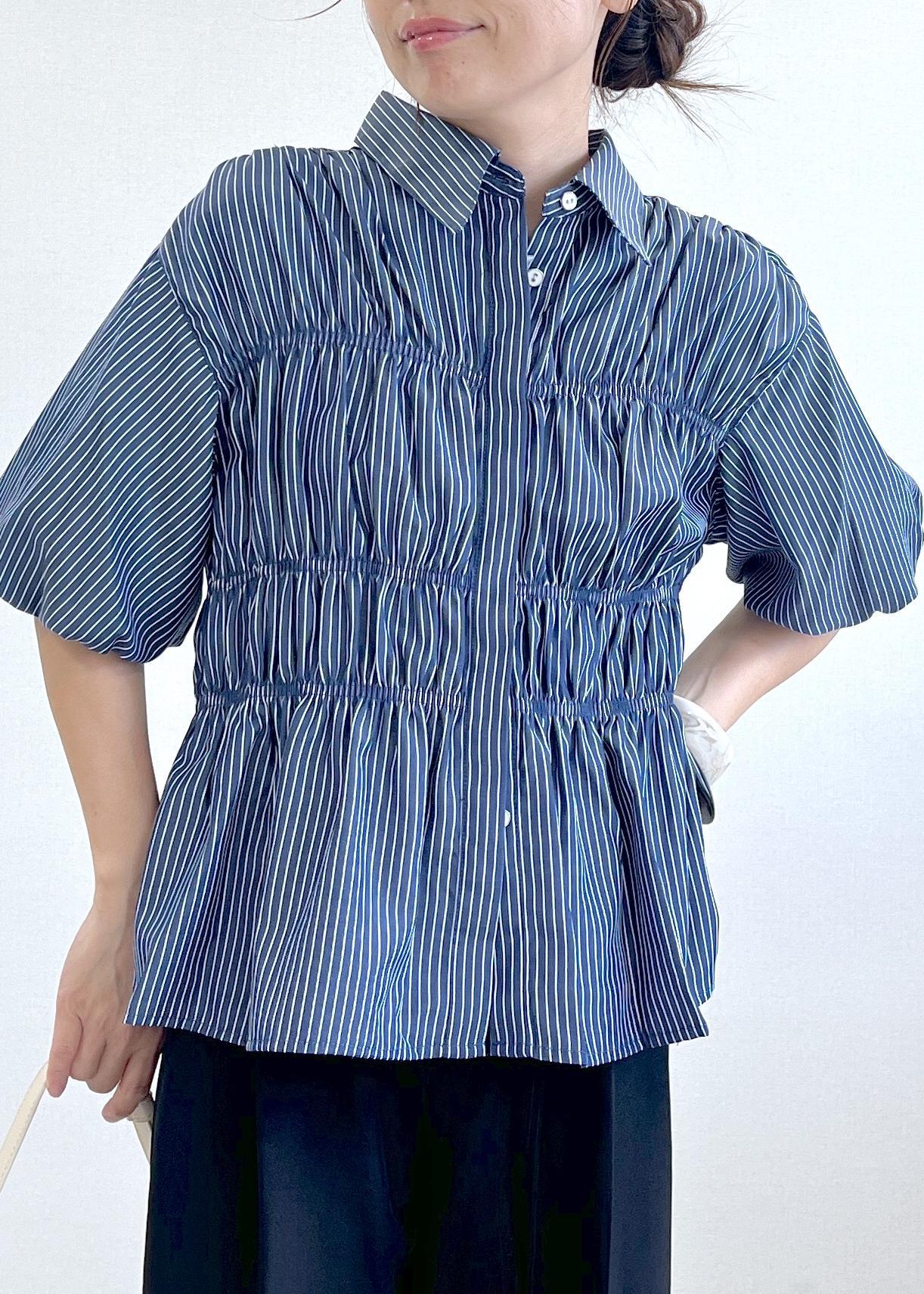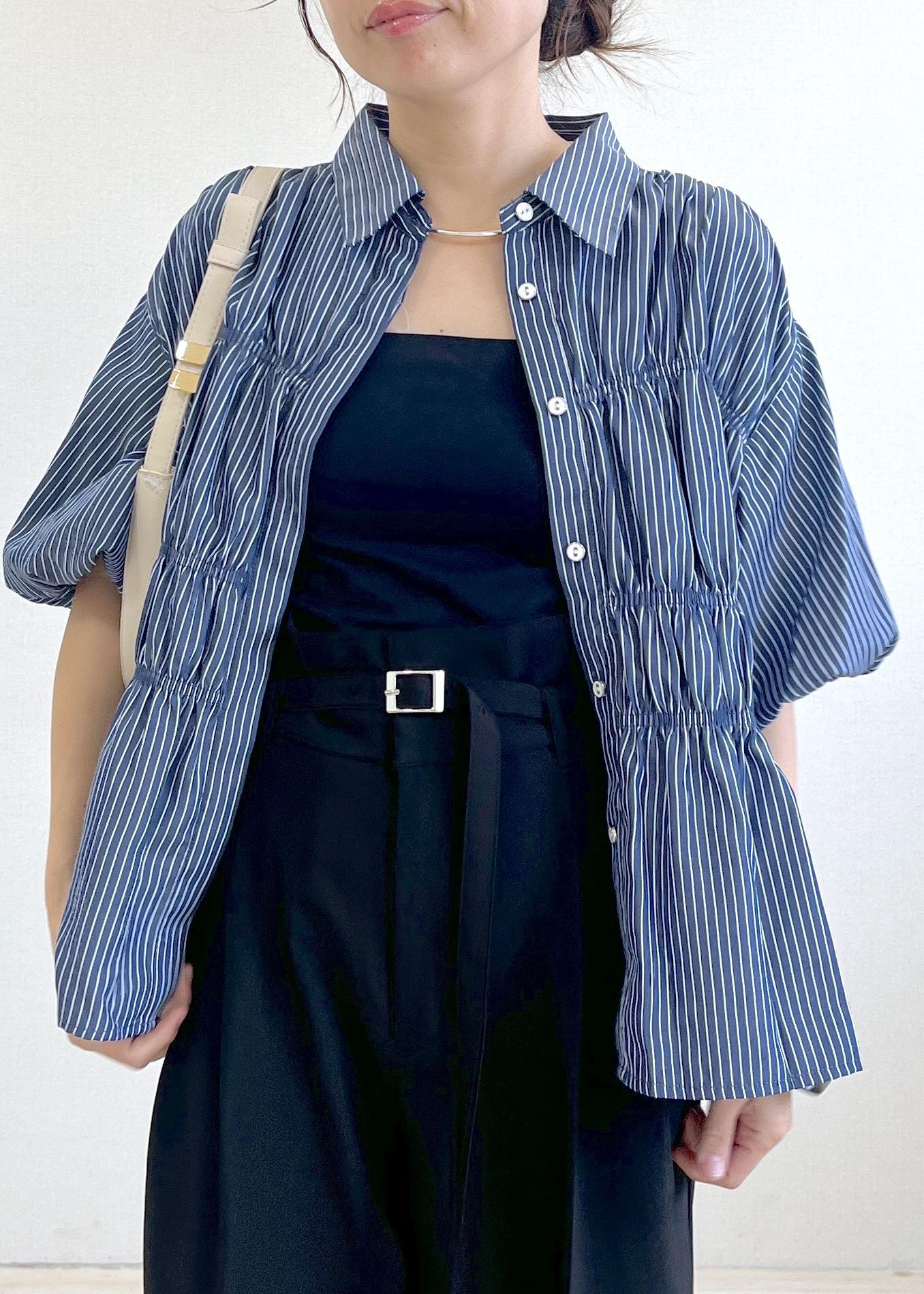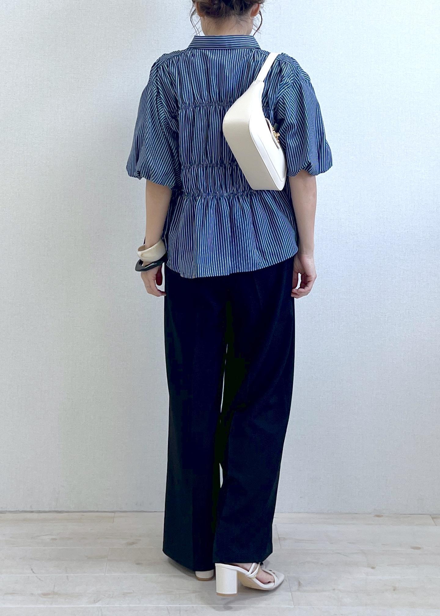 VIS【新色追加】【店頭人気】シャーリングバルーンシャツネイビー系 / F¥5,489レビュー152cmでFサイズ着用し、着丈はお尻にかかるくらいのやや長め丈。昨年も大人気だったブラウスがアップデートです!柔らかくシワになりにくい素材でお手入れも楽ちん♫そのまま着るだけで今年らしくなれるシャーリングデザインも◎