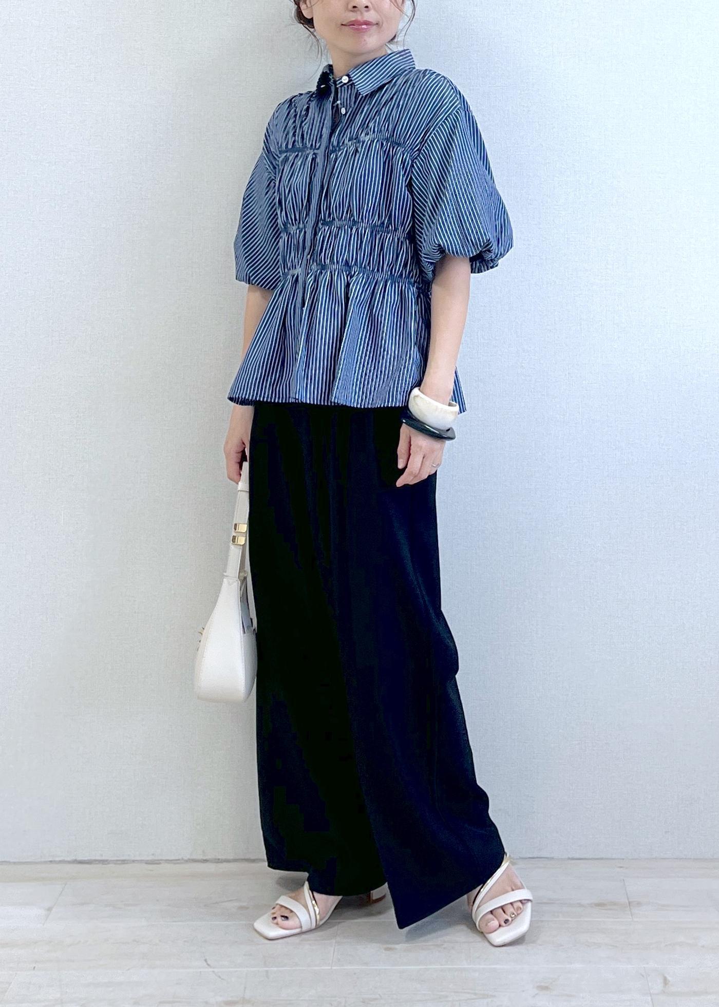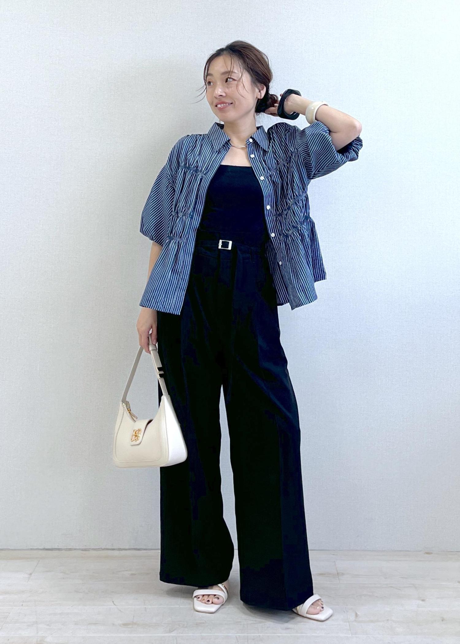 シャツは前を開けてラフに、パンツはとろみ素材で動きのあるシルエットに。