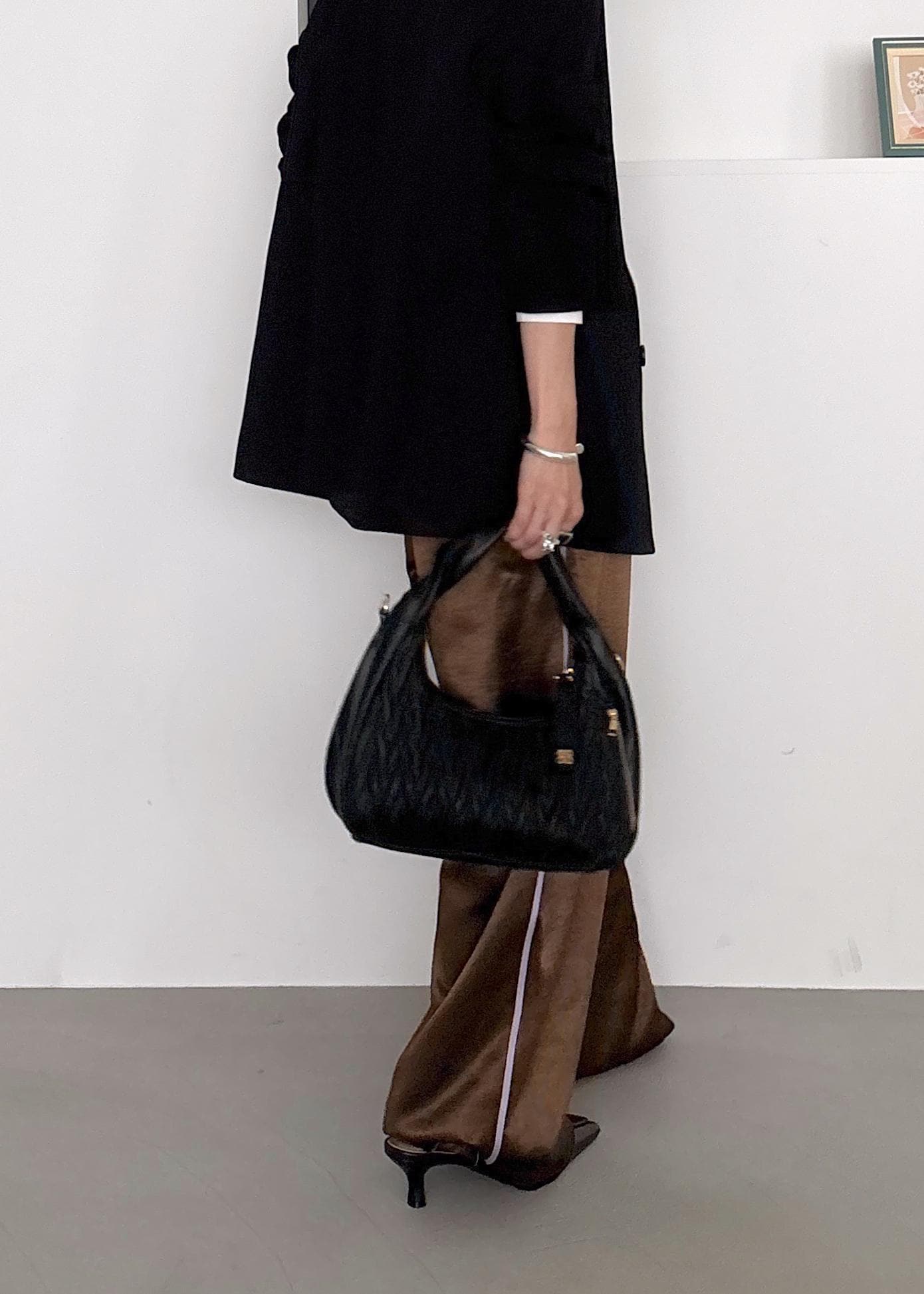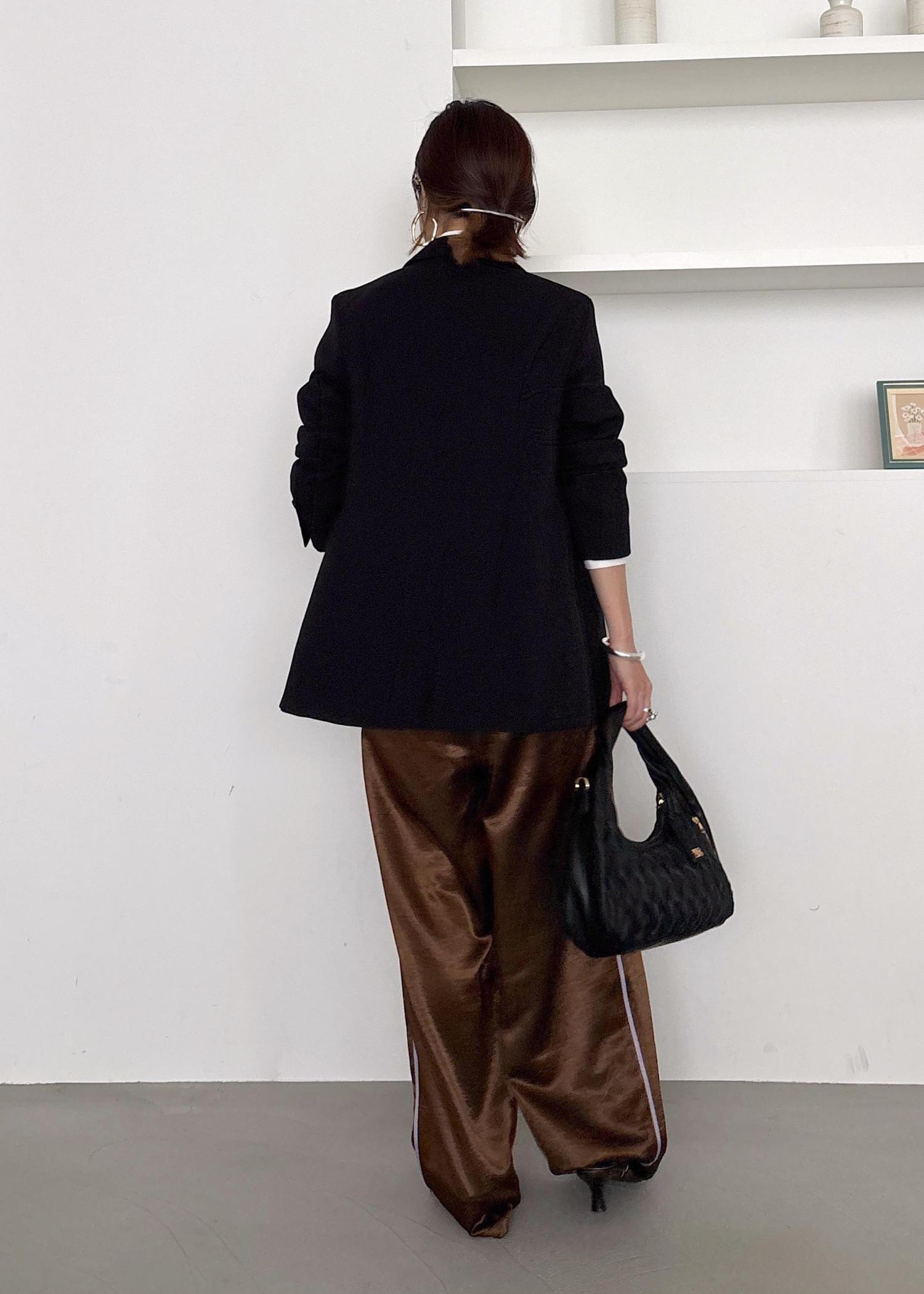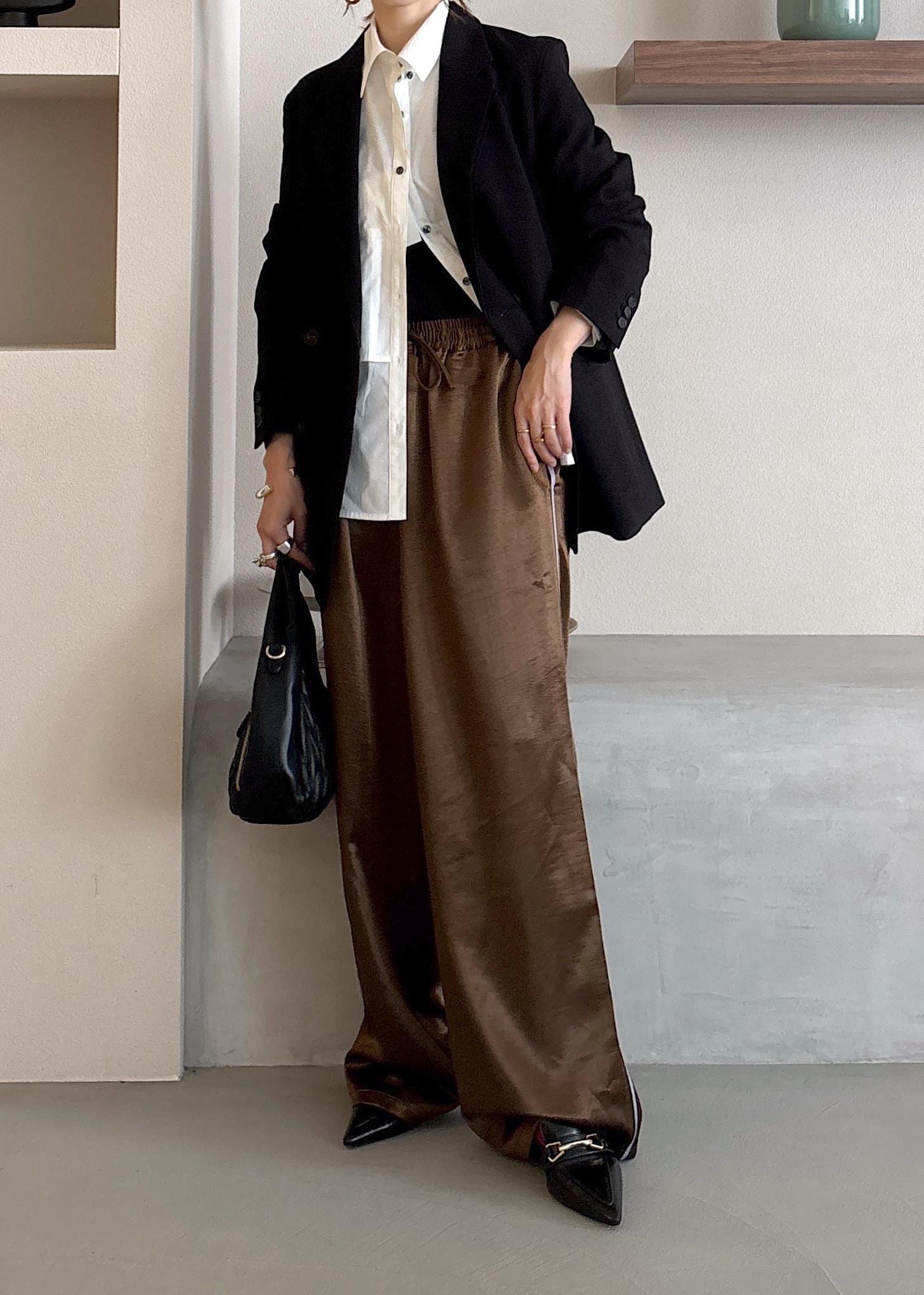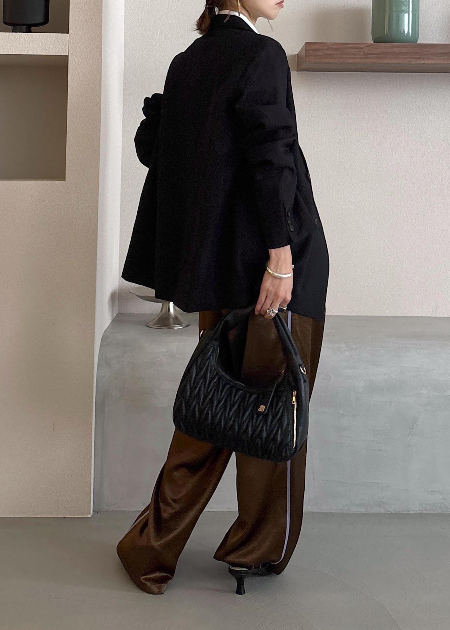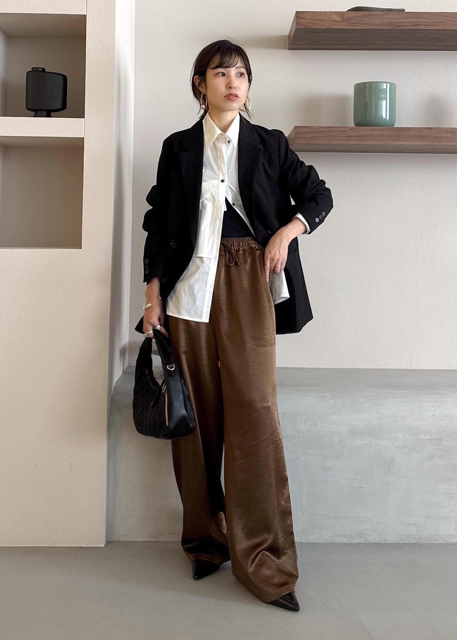8月に入って、まだ暑いけど秋物も気になる時期。ブラックジャケットはオンオフ兼用で着回せるので必ず欲しくなる一枚。ホワイトのシャツと今年らしいサテンパンツでトレンドカジュアルな印象にまとめました◎モード感がある秋オススメの大人カジュアルコーデ。