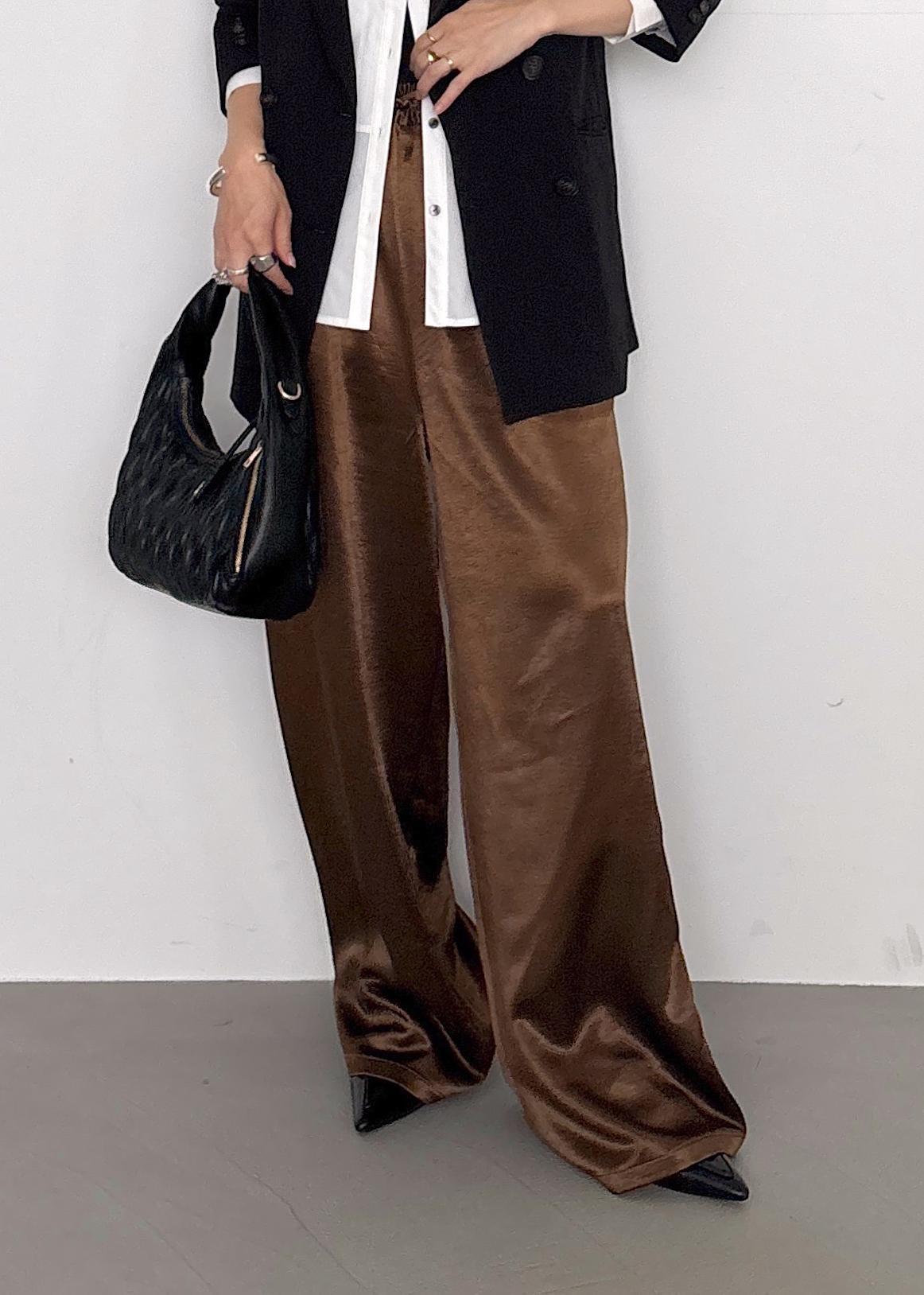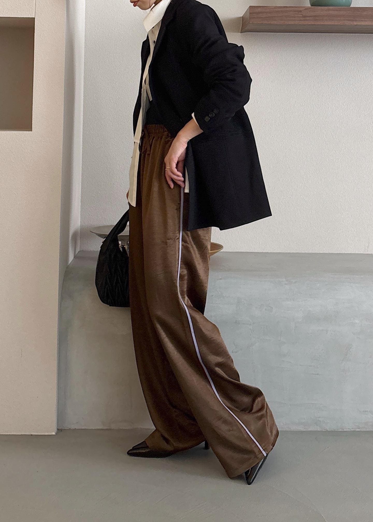 VIS【WEB/一部店舗限定】配色サイドラインサテンイージーパンツブラウン / F¥4,612レビュー今年らしいサイドラインのサテンパンツ♪柔らかな素材で動きやすく、とても着やすいです。程よい光沢感が大人可愛い印象で、スポーティーさもモード感も叶うのでとても好み◎ウエストはドロストコードで調整が可能です。全体的にゆったりめ、着丈は足首が隠れる長さでした。