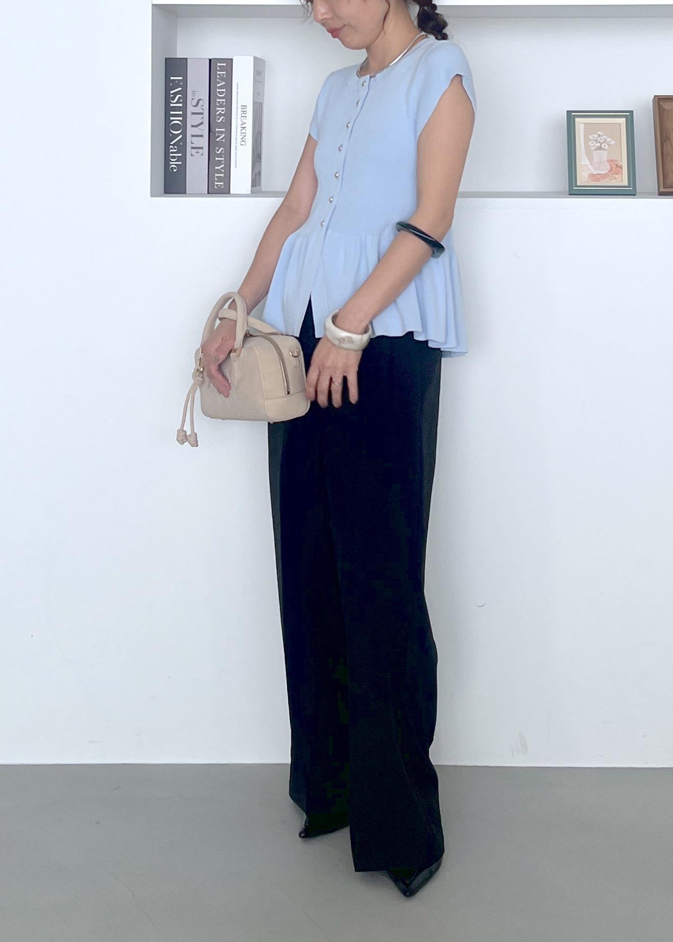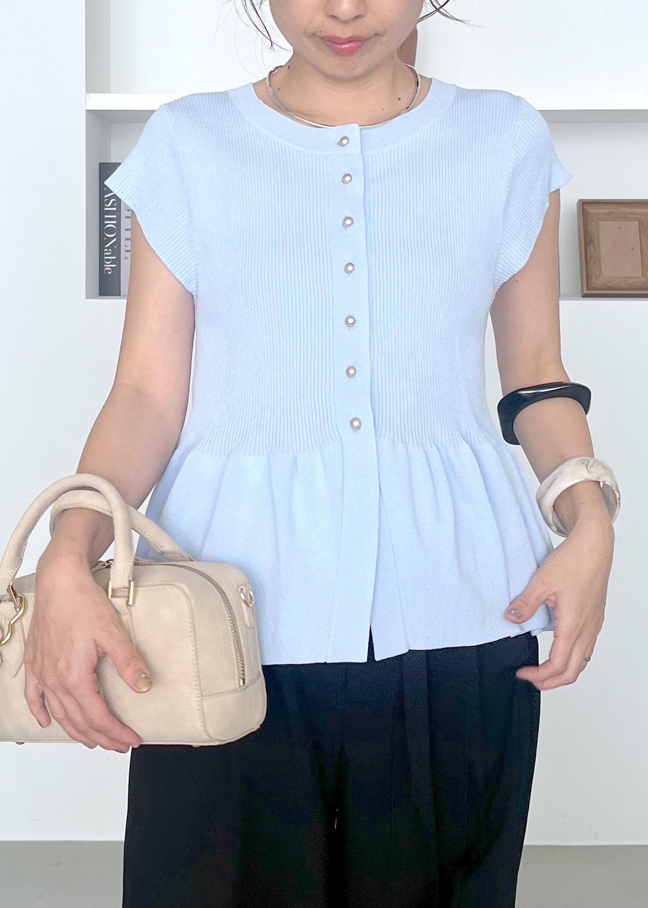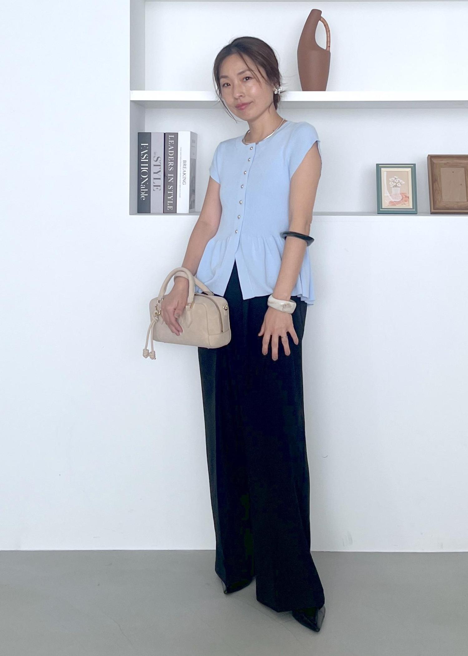 アイスブルーのペプラムカーデは、ふわっと広がるシルエットで女性らしさを引き立ててくれながら体型カバーも◎