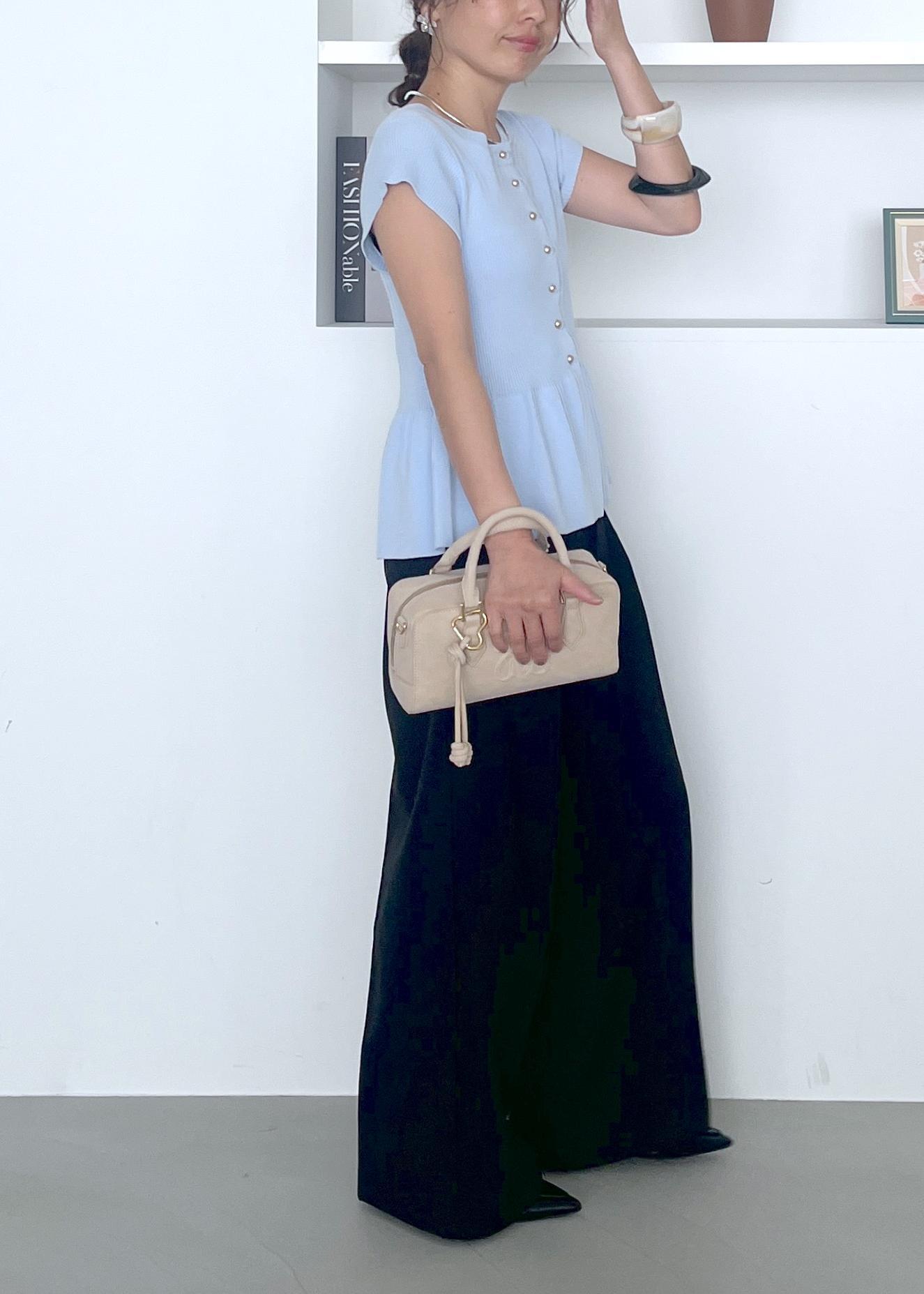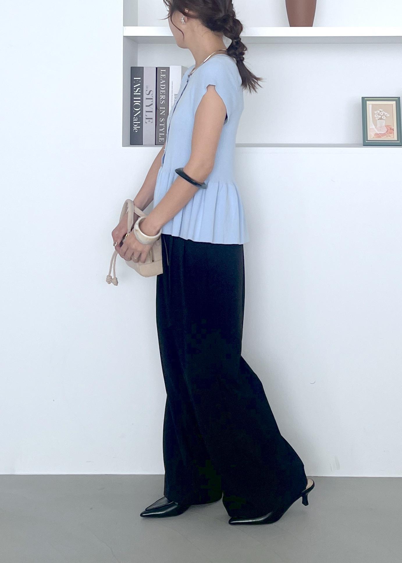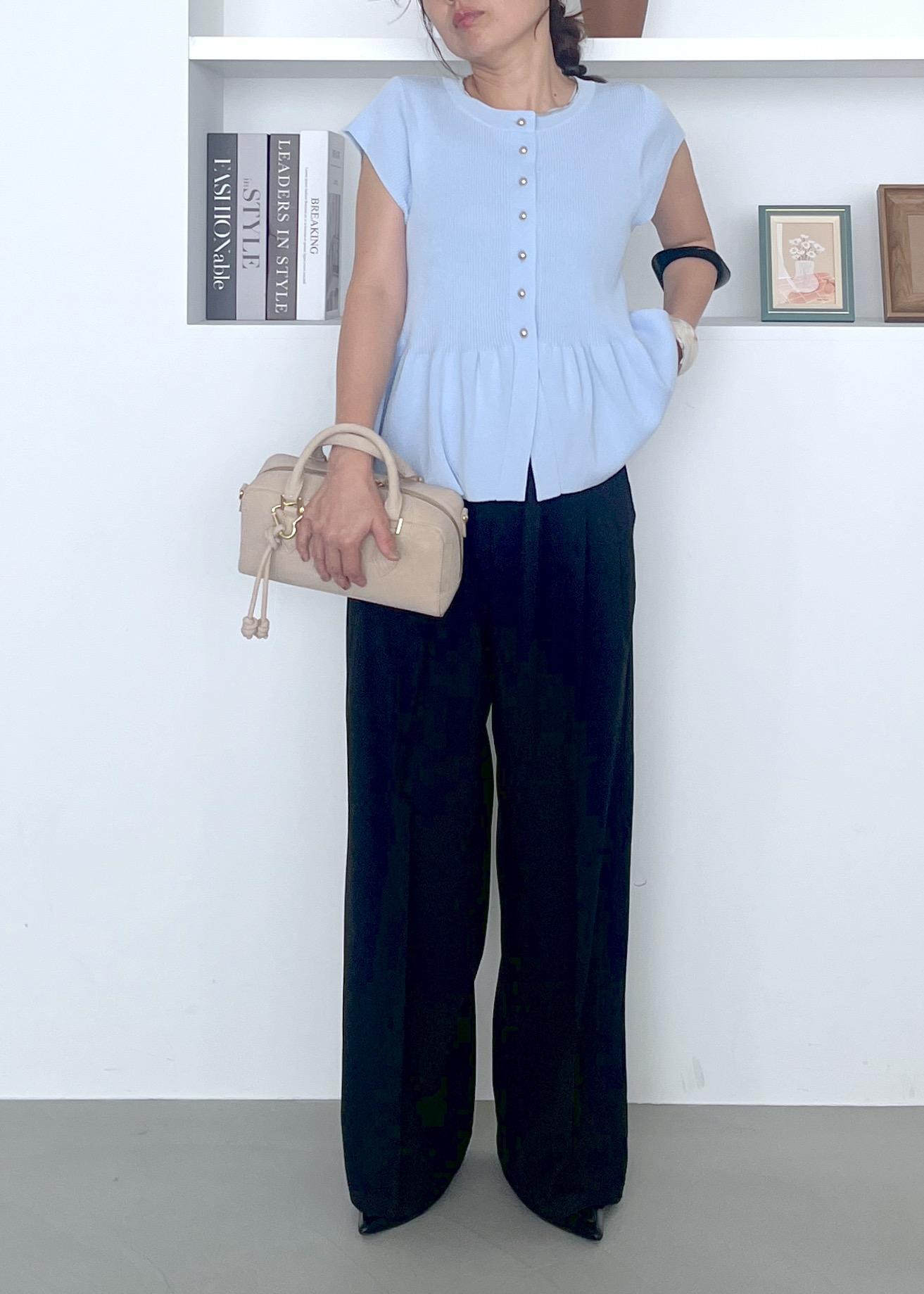 アイスブルーのペプラムカーデは、ふわっと広がるシルエットで女性らしさを引き立ててくれながら体型カバーも◎