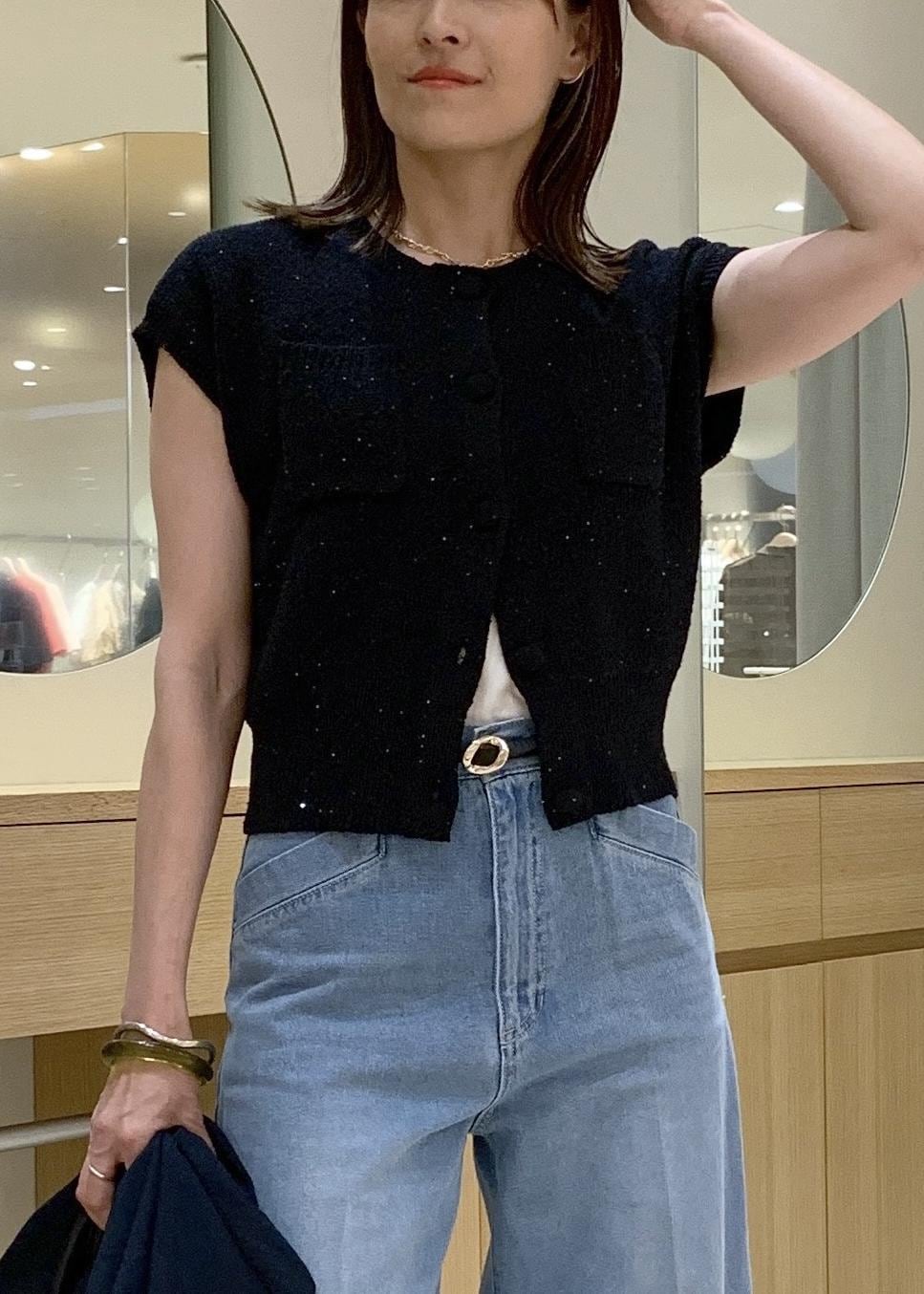 細かい小さなスパンコールが編み込んでますが、チクチク感もなく着用できます。 -