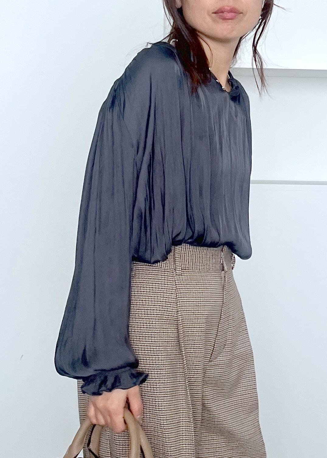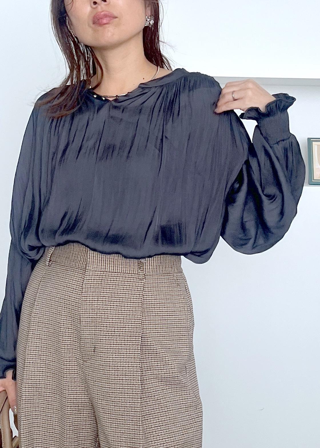 VIS割繊シャーリングブラウス/2WAY・イージーケアチャコール / F¥5,489レビュー152cmで Fサイズ着用し、着丈は腰にかかるくらいの丈。OUTスタイルでも着用できるので気になるお腹周りもすっきりカバー!とろみある素材感で大きめサイズですが、横に広がることなく縦ラインできれいに着用できました。袖部分は手首を見せる着方をすると抜け感がでて◎前後2wayでガラッと雰囲気が変わるのも嬉しいポイント!