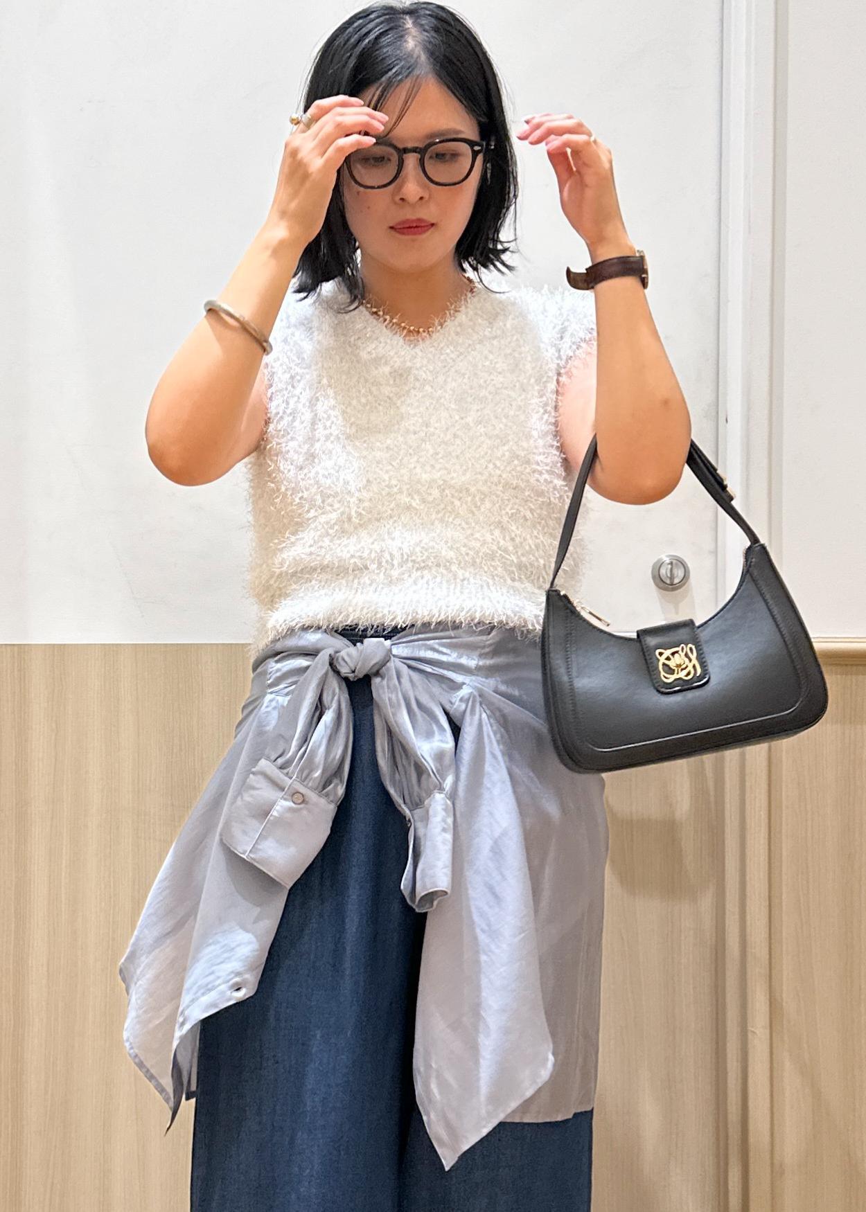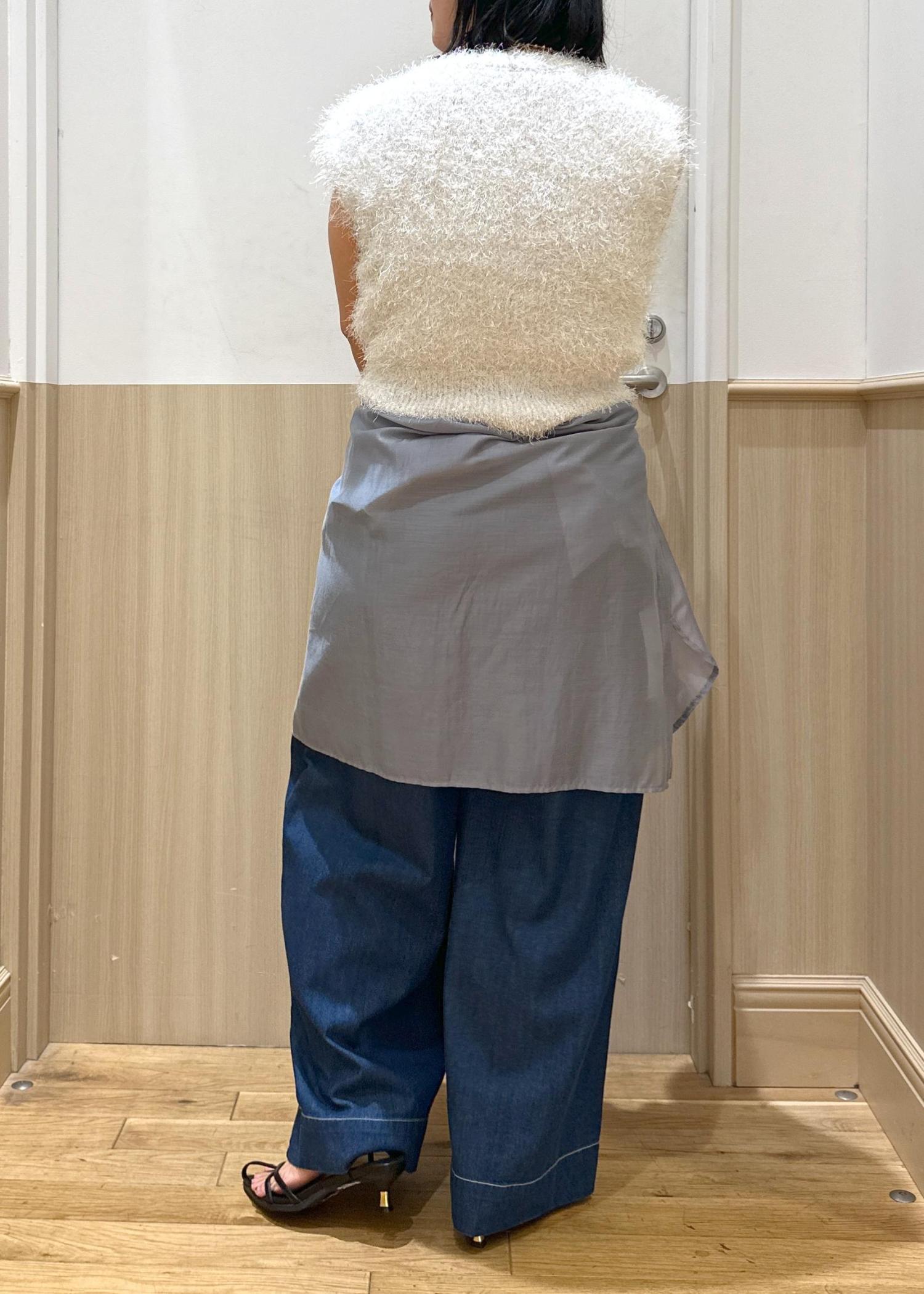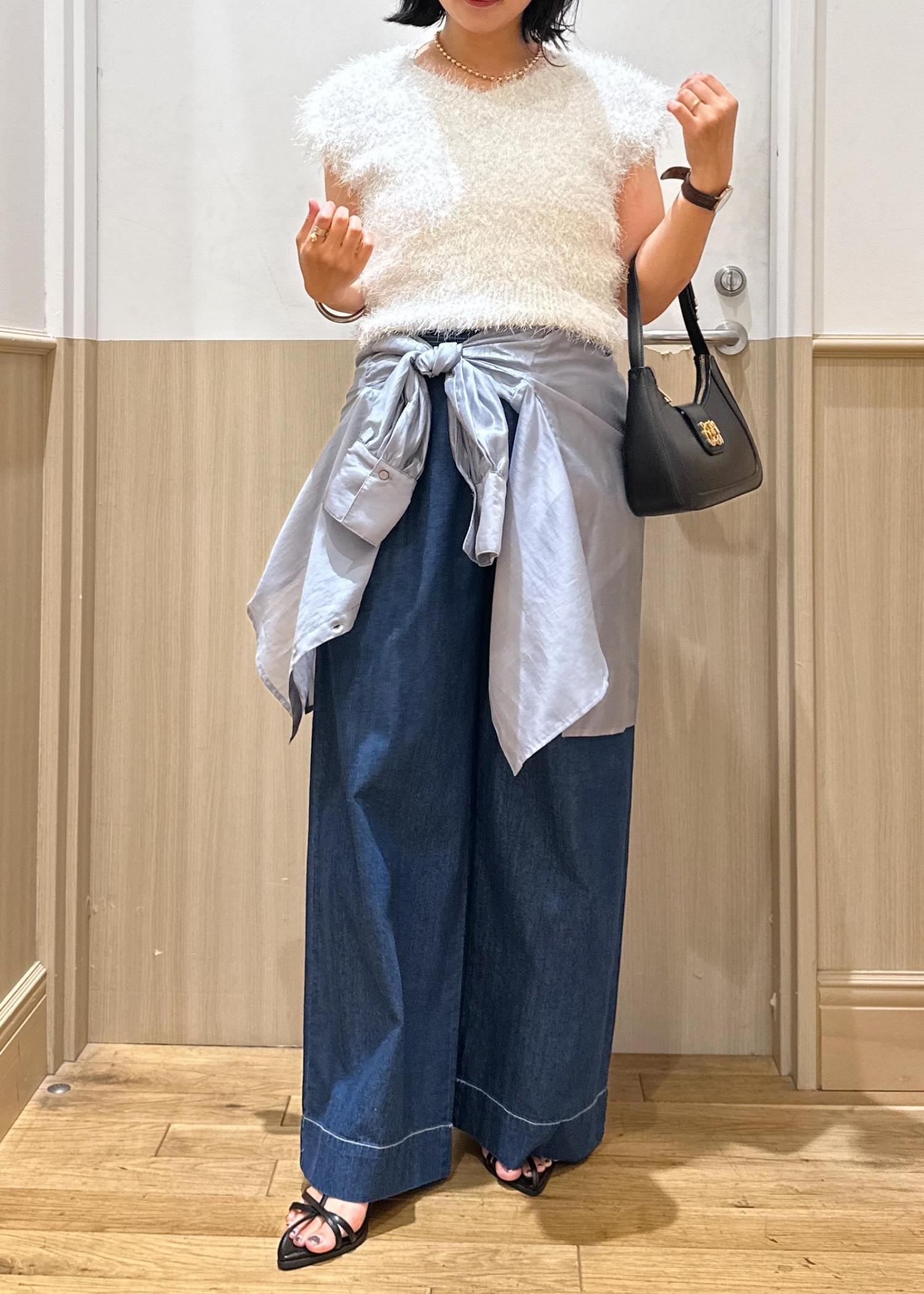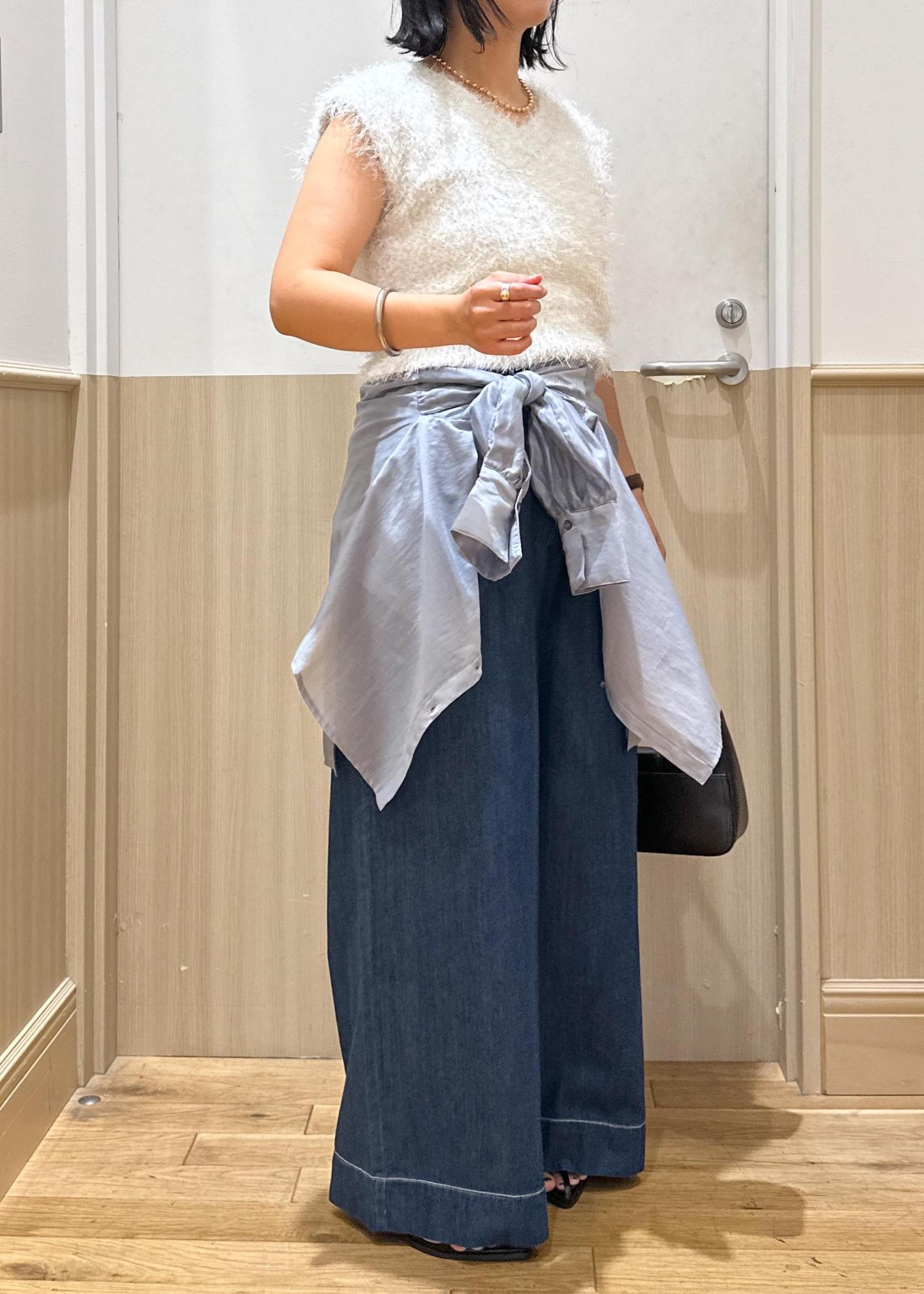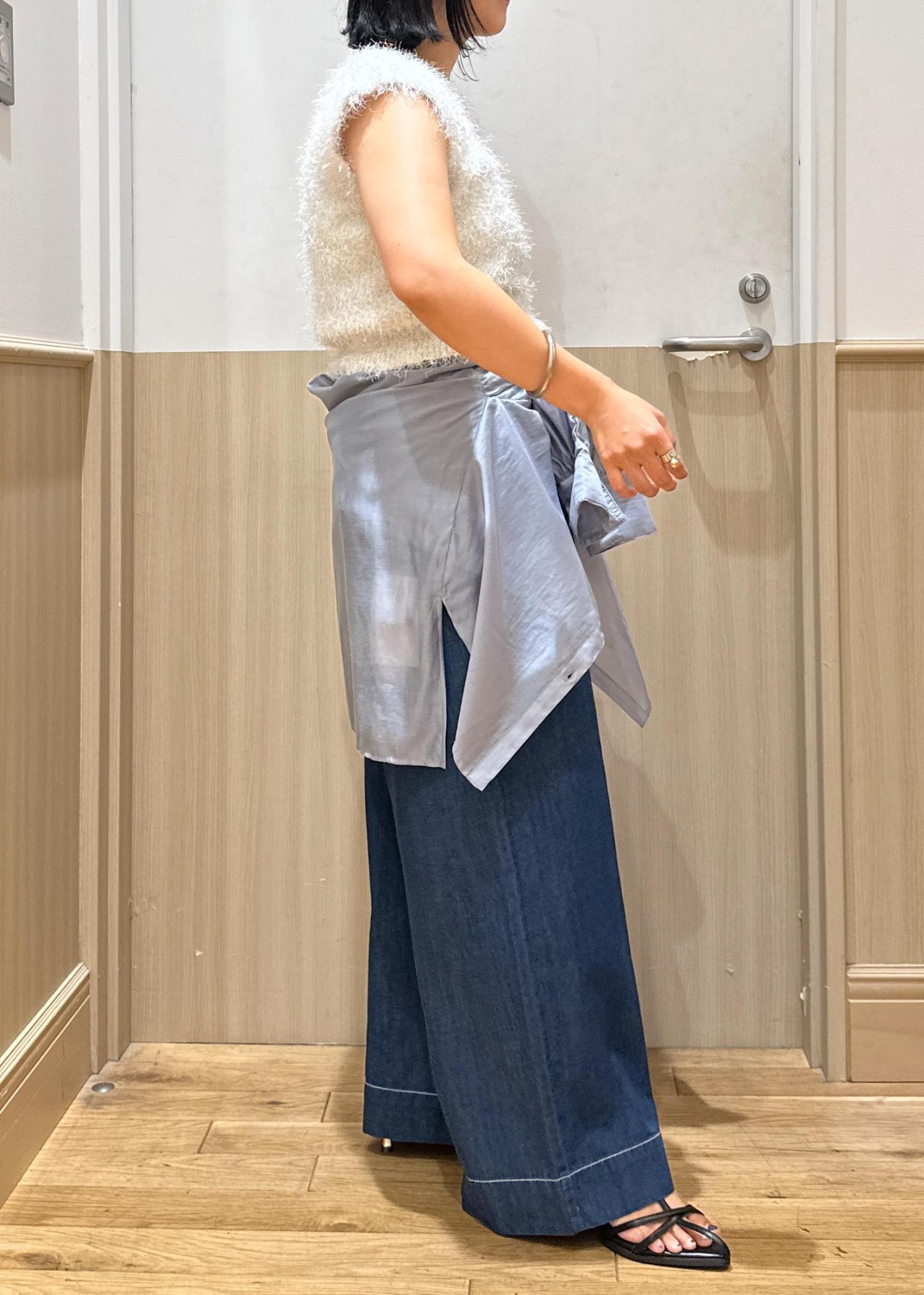 ベストとデニムだけだと少し寂しかったので、シャツを腰巻きしておしゃれ度アップ!