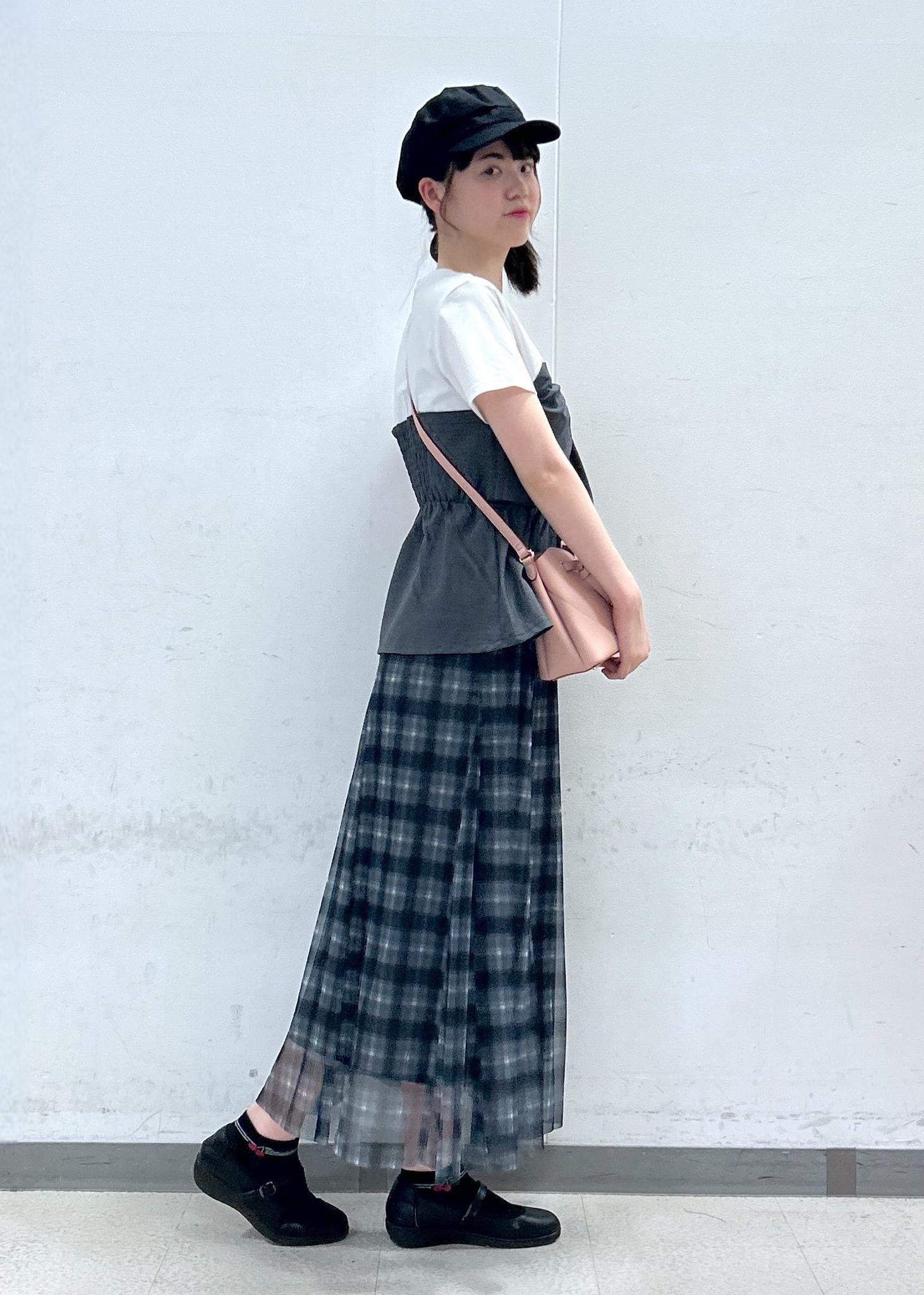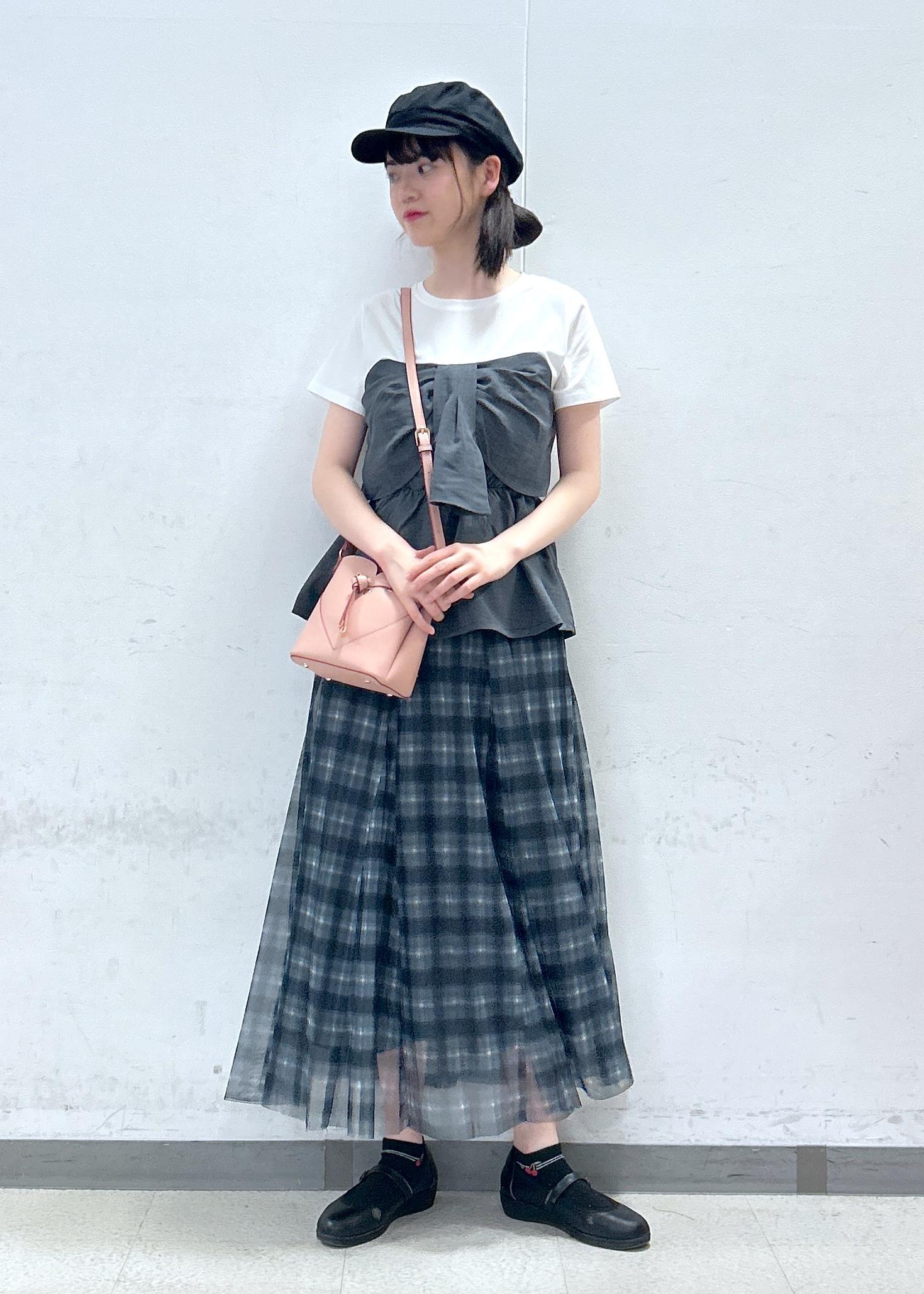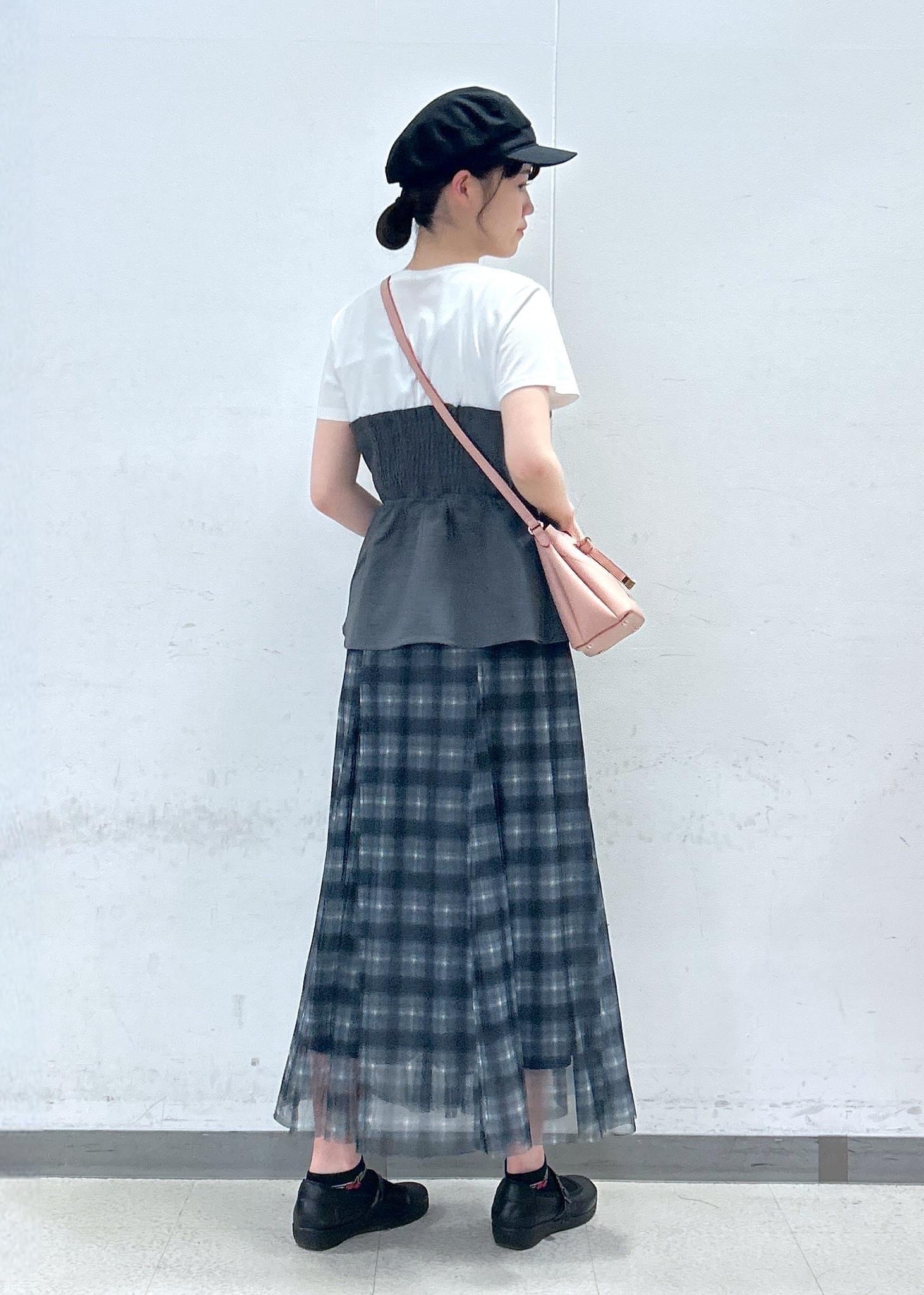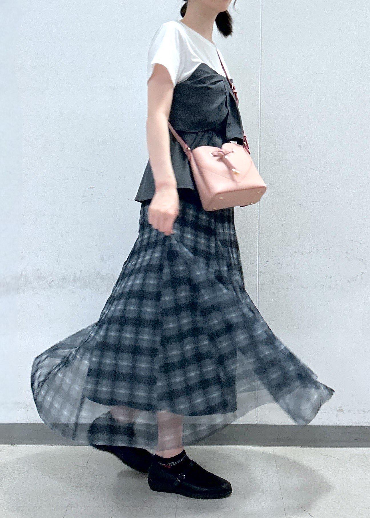 VIS【洗える】チュールプリントチェックスカートブラック系 / F¥4,612レビューチュールがふわっと風に揺れるフェミニンなスカート。裾に向かって3角のマチが入っているので腰周りはスッキリ、蹴回しは広めの女性らしいシルエットです♡柔らかい素材&ウエストがゴムなので窮屈感無く楽に着用していただけます。