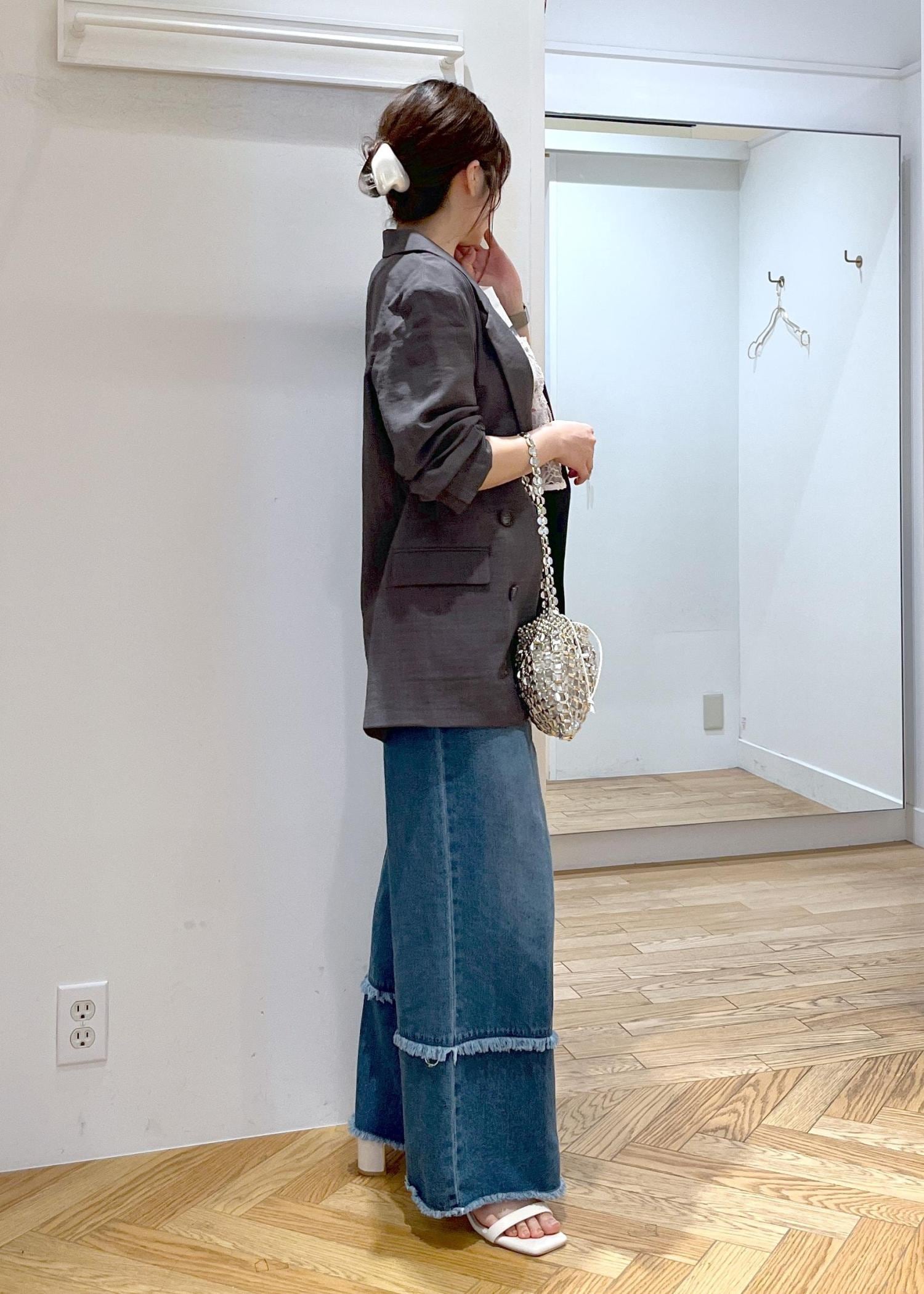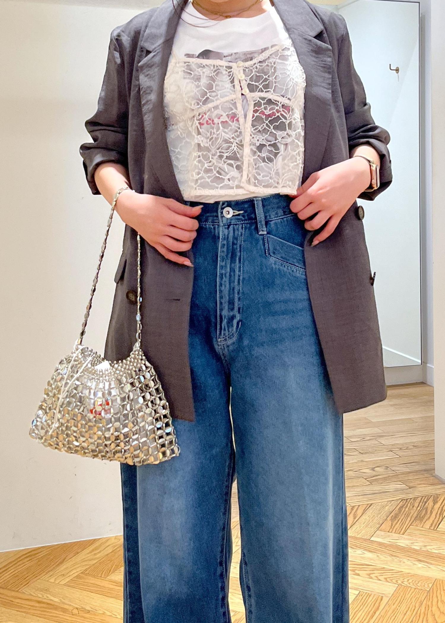 トップスはTシャツにビスチェを重ねて、ジャケットをカジュアルに!