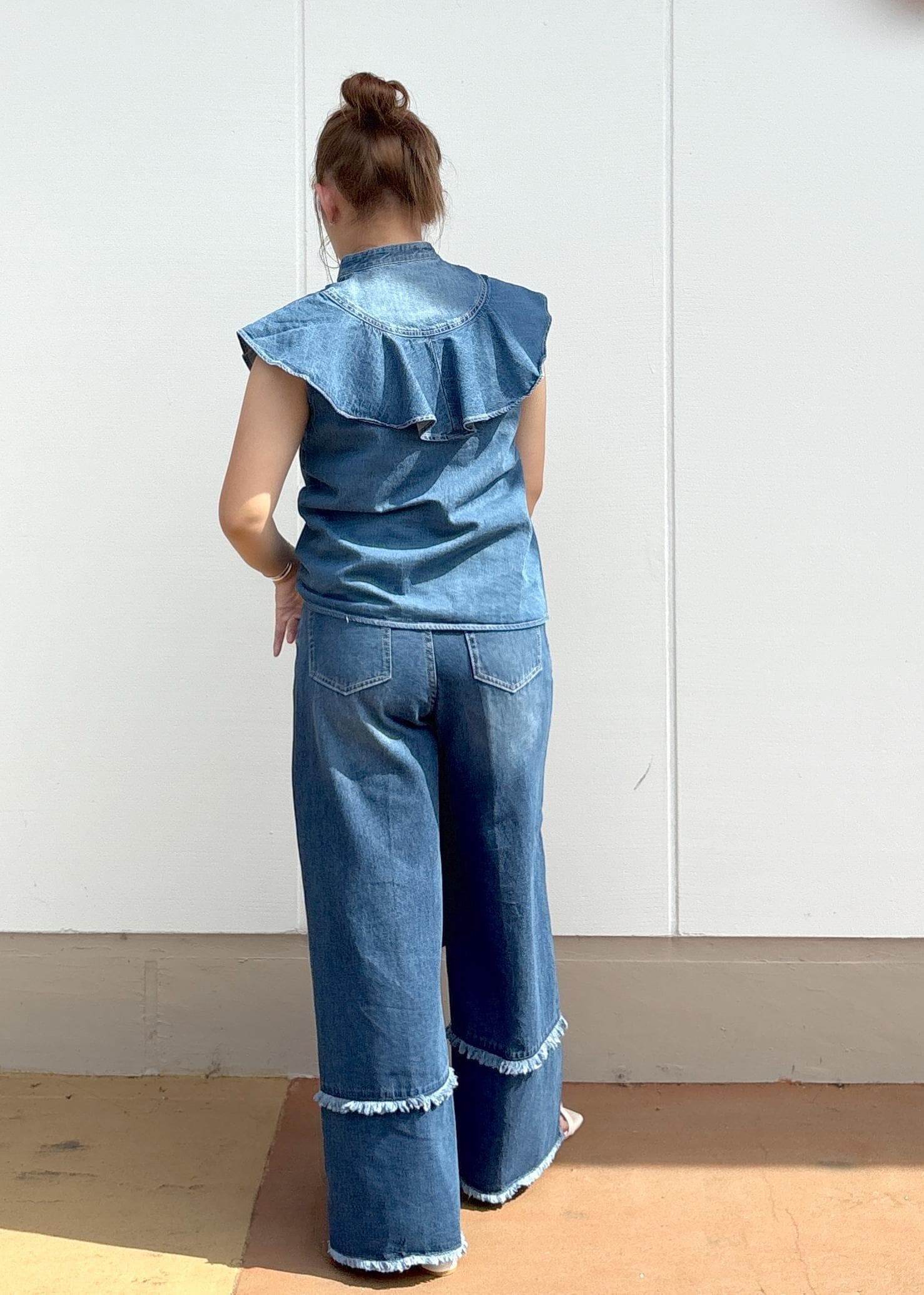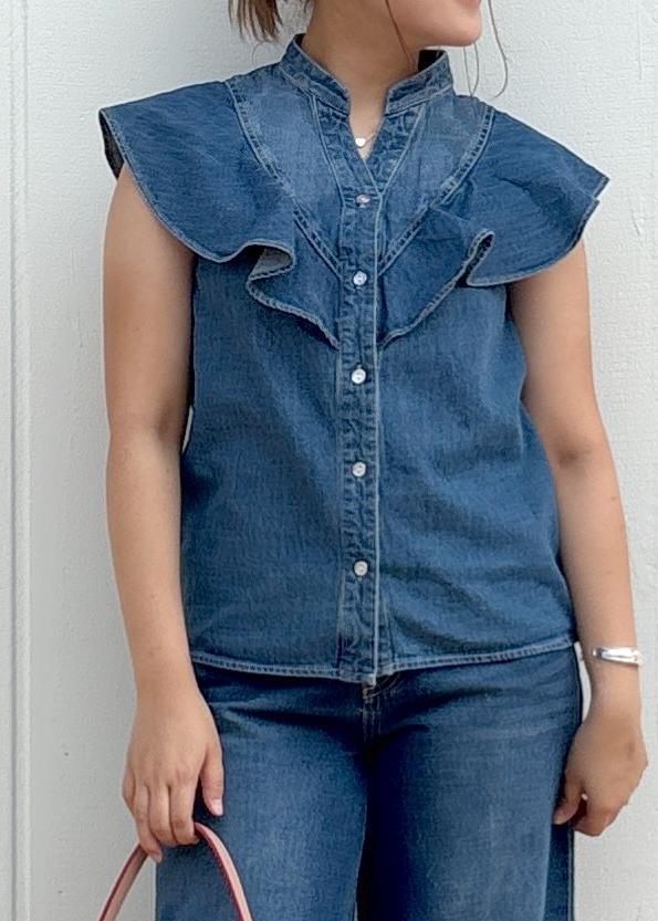 VIS【UVケア/洗える】ラッフルデザインデニムブラウスブルー系 / F¥3,953レビューデニムのフリルが可愛いトップス!