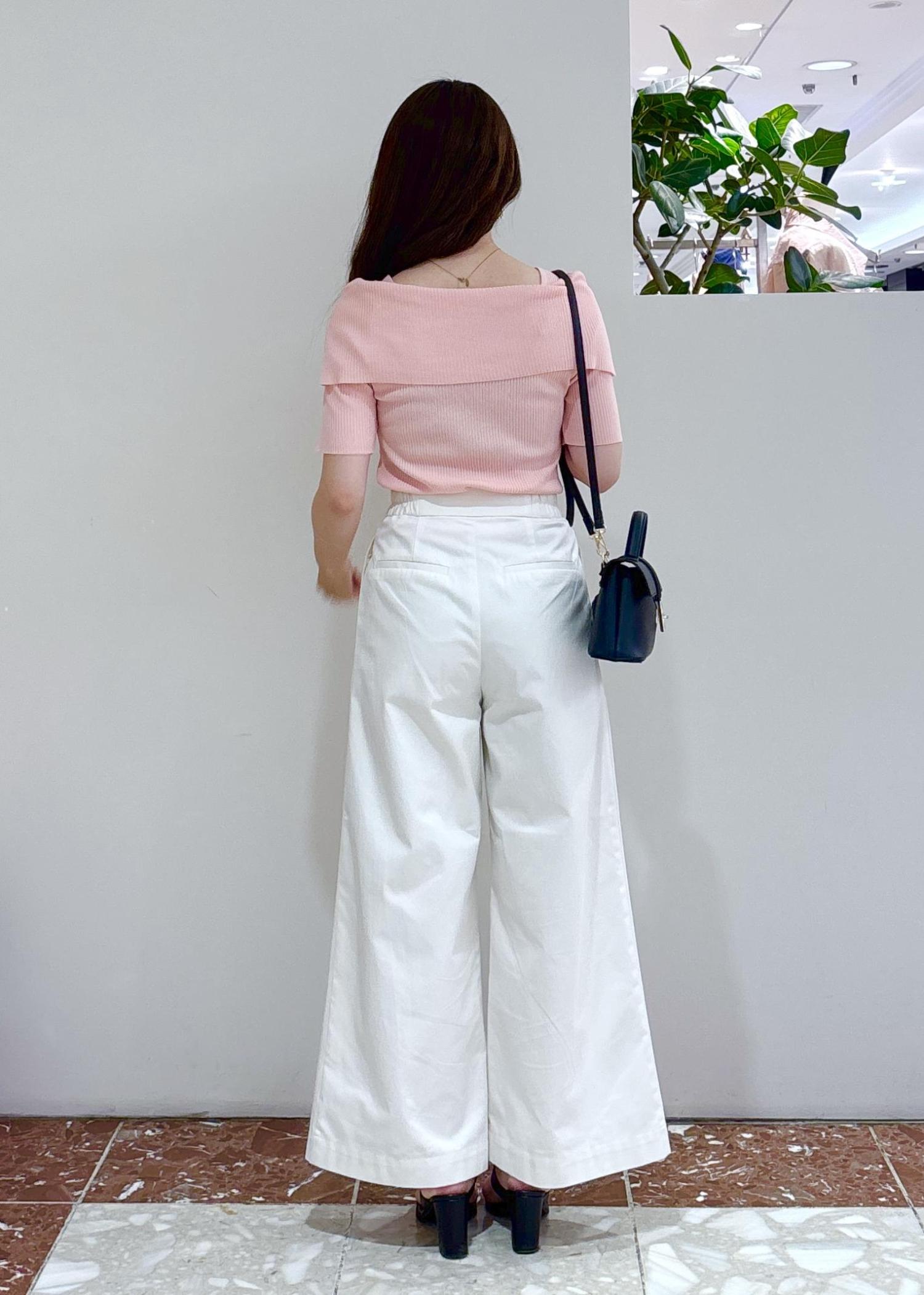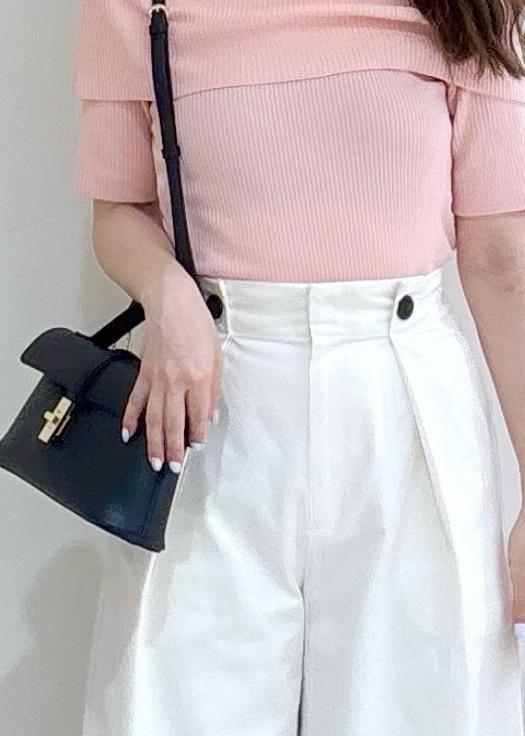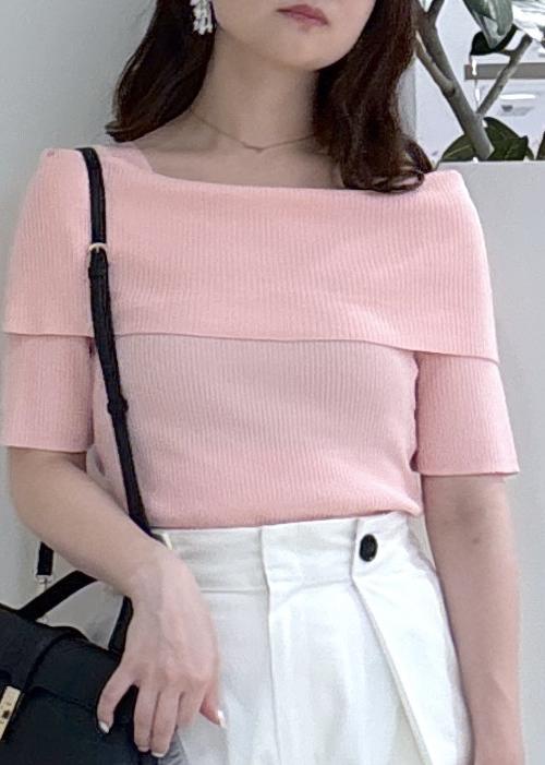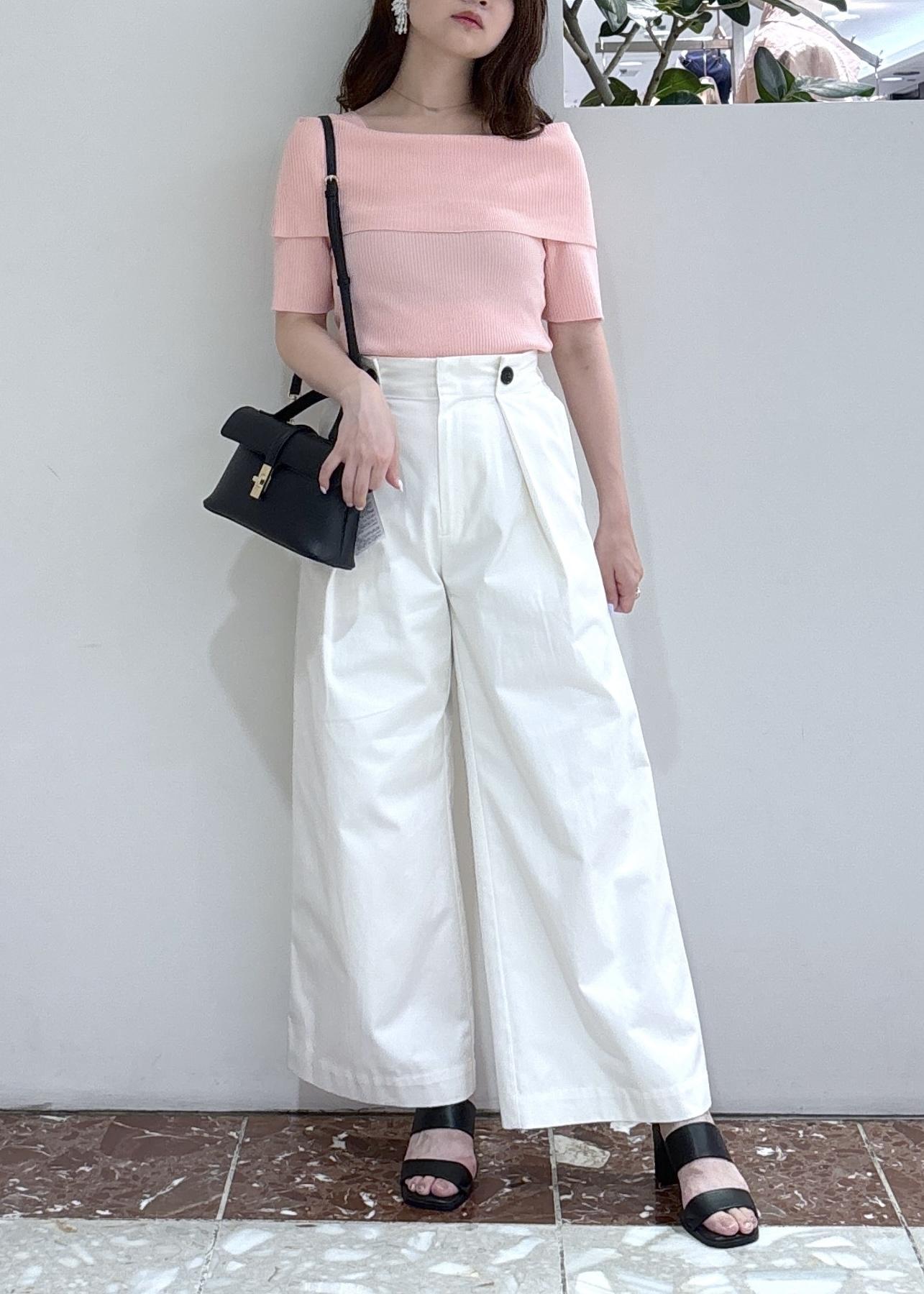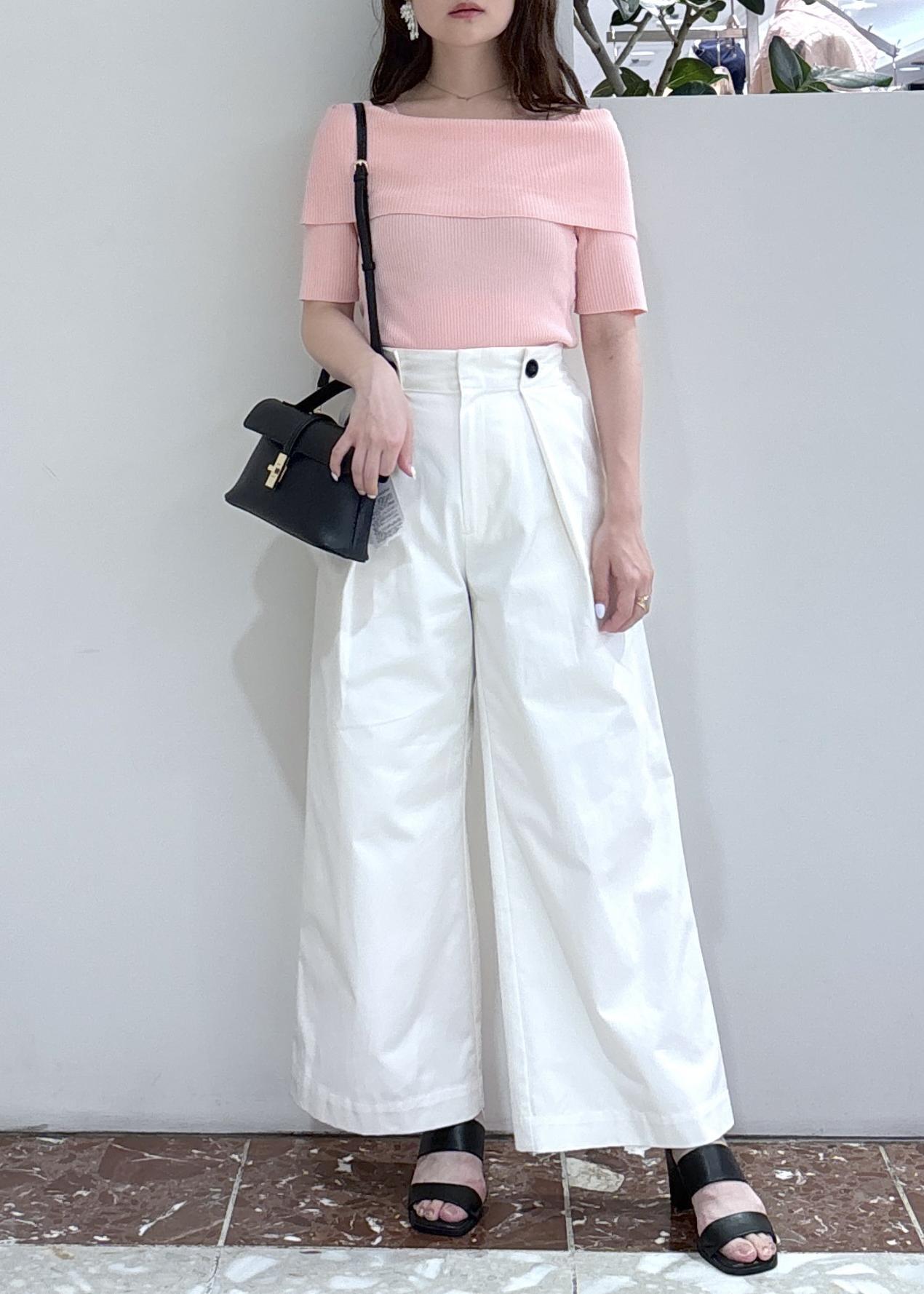 大人気で再入荷したオフショル風リブニットのピンクを活かして甘めカジュアルスタイリングにしてみました!