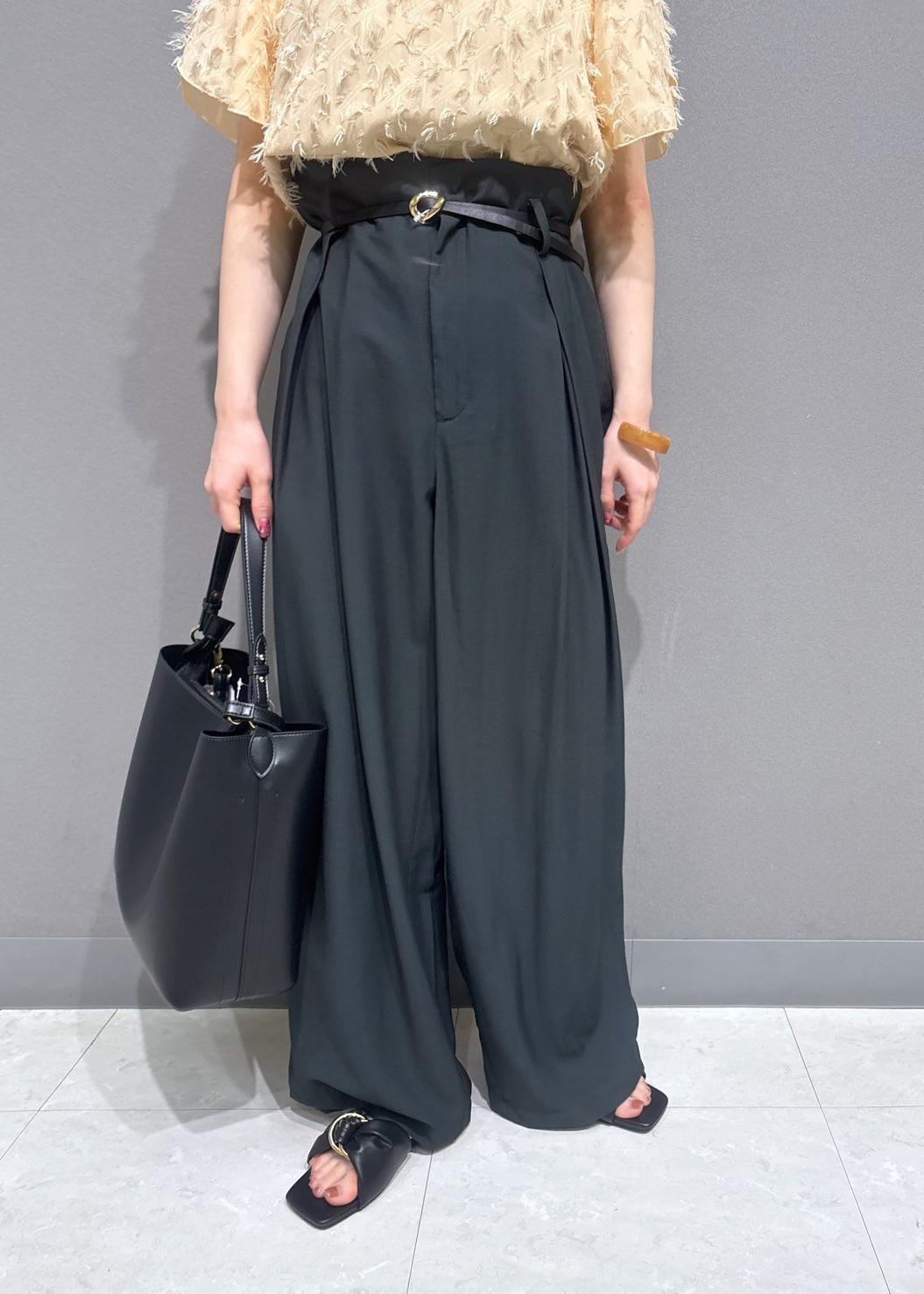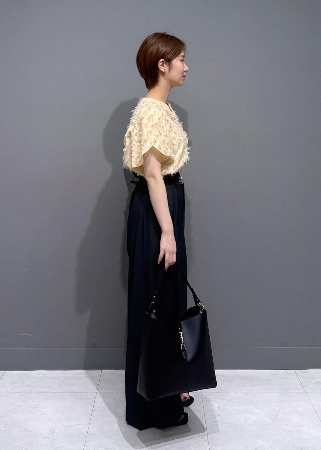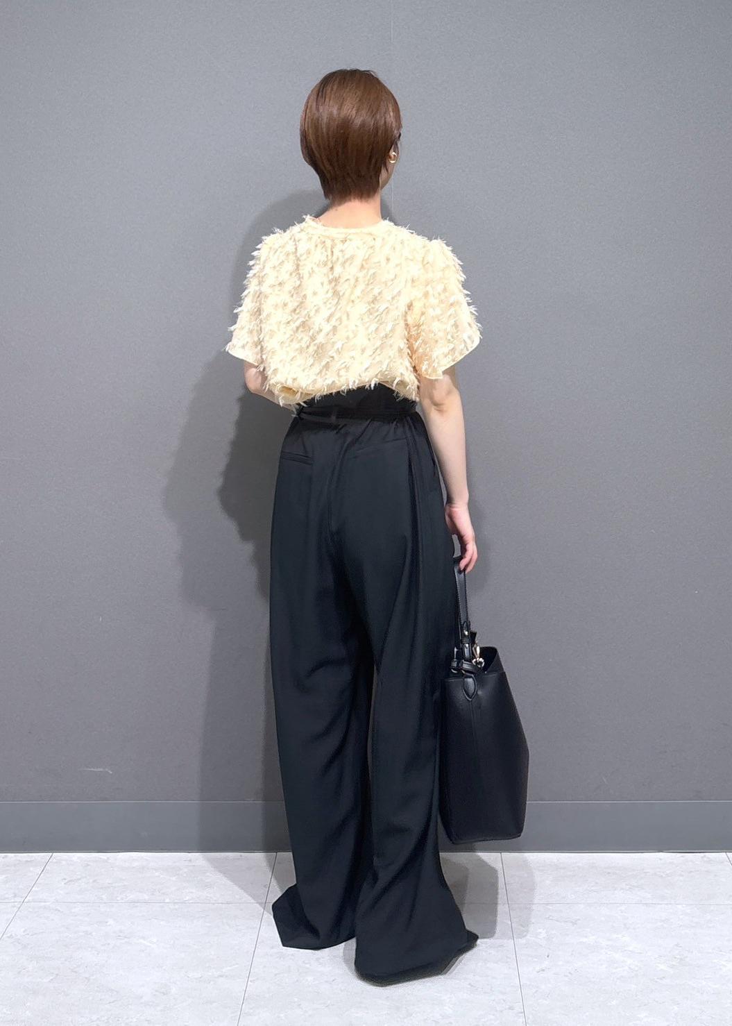 ハイウエストのワイドパンツと合わせてエレガントな印象に。