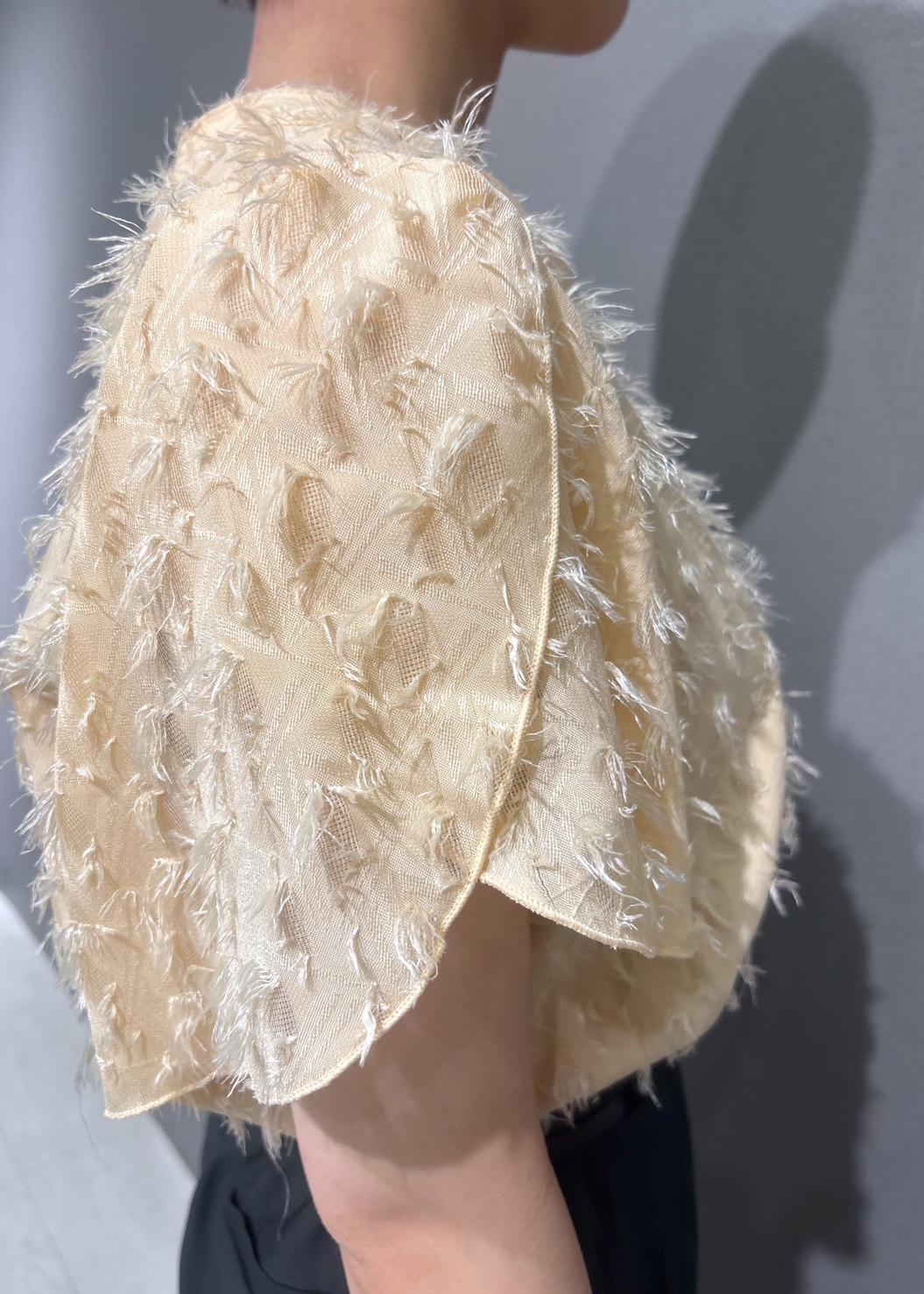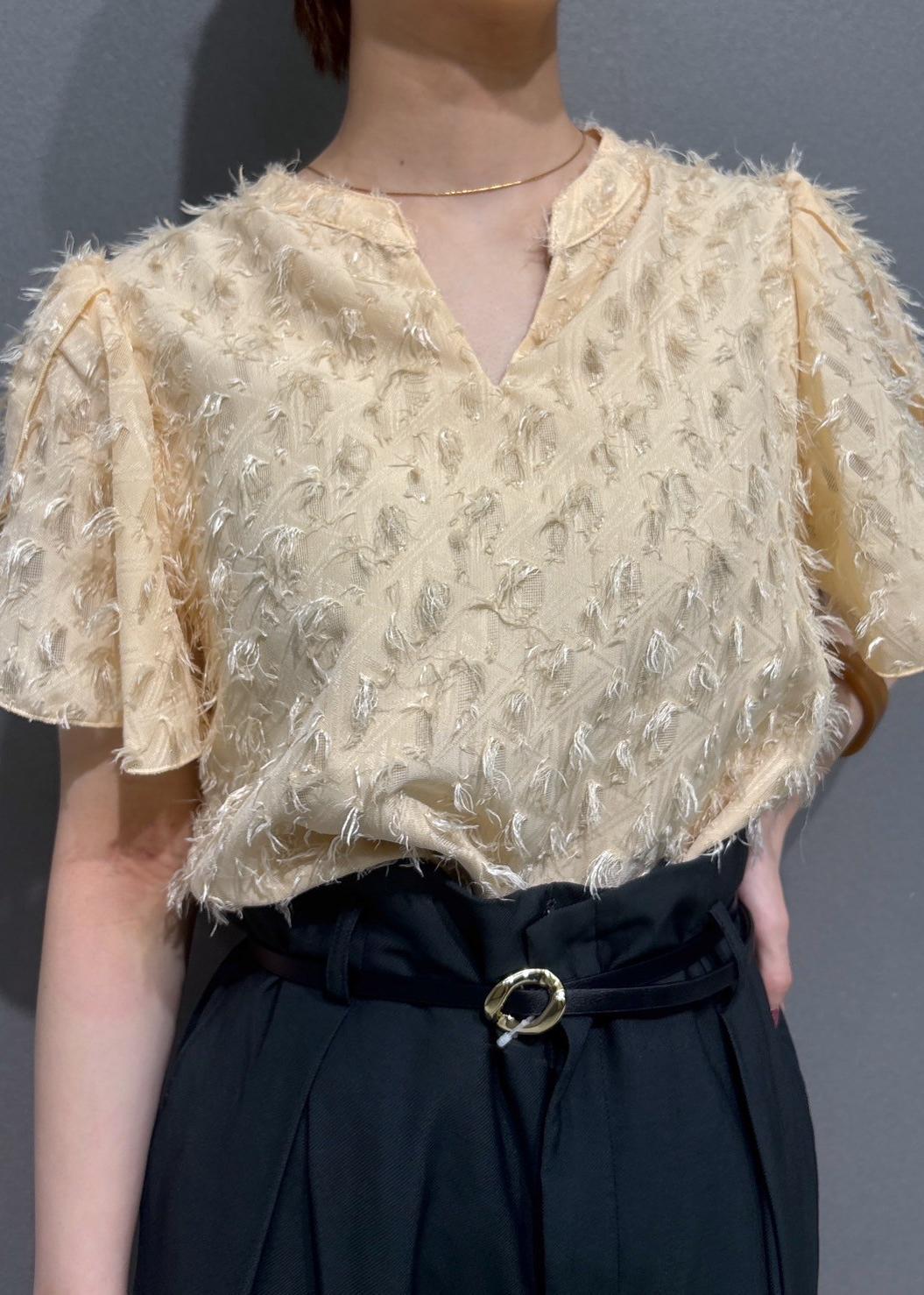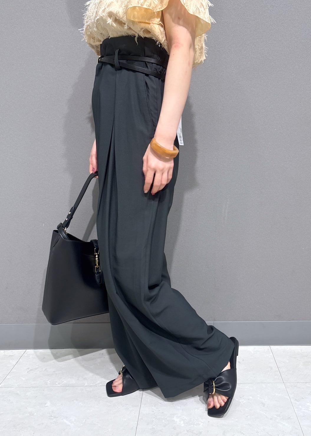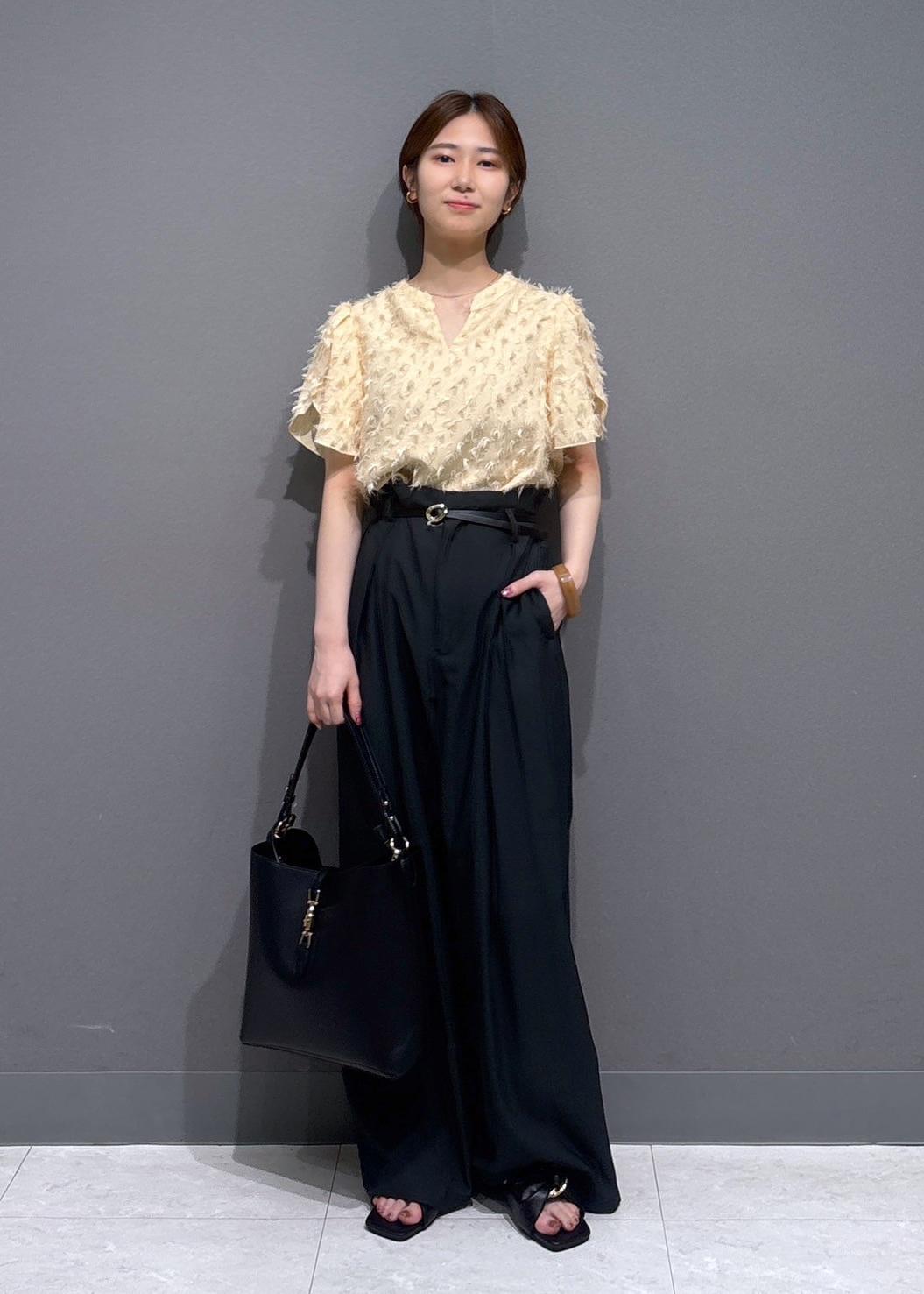 ハイウエストのワイドパンツと合わせてエレガントな印象に。