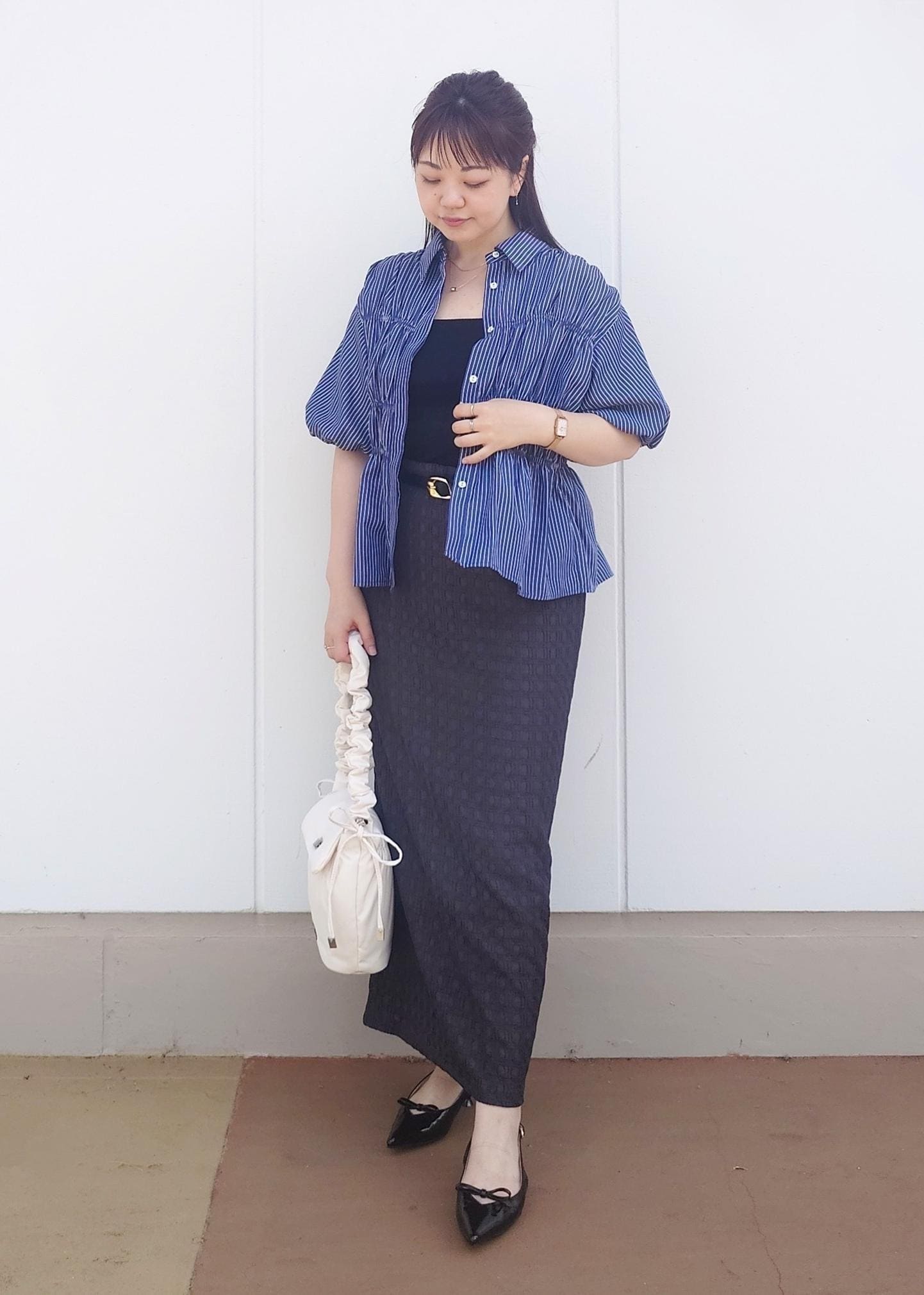 156cmでヒップの中間くらいの丈で、パンツはもちろん、ロングスカート合わせも可愛いです。