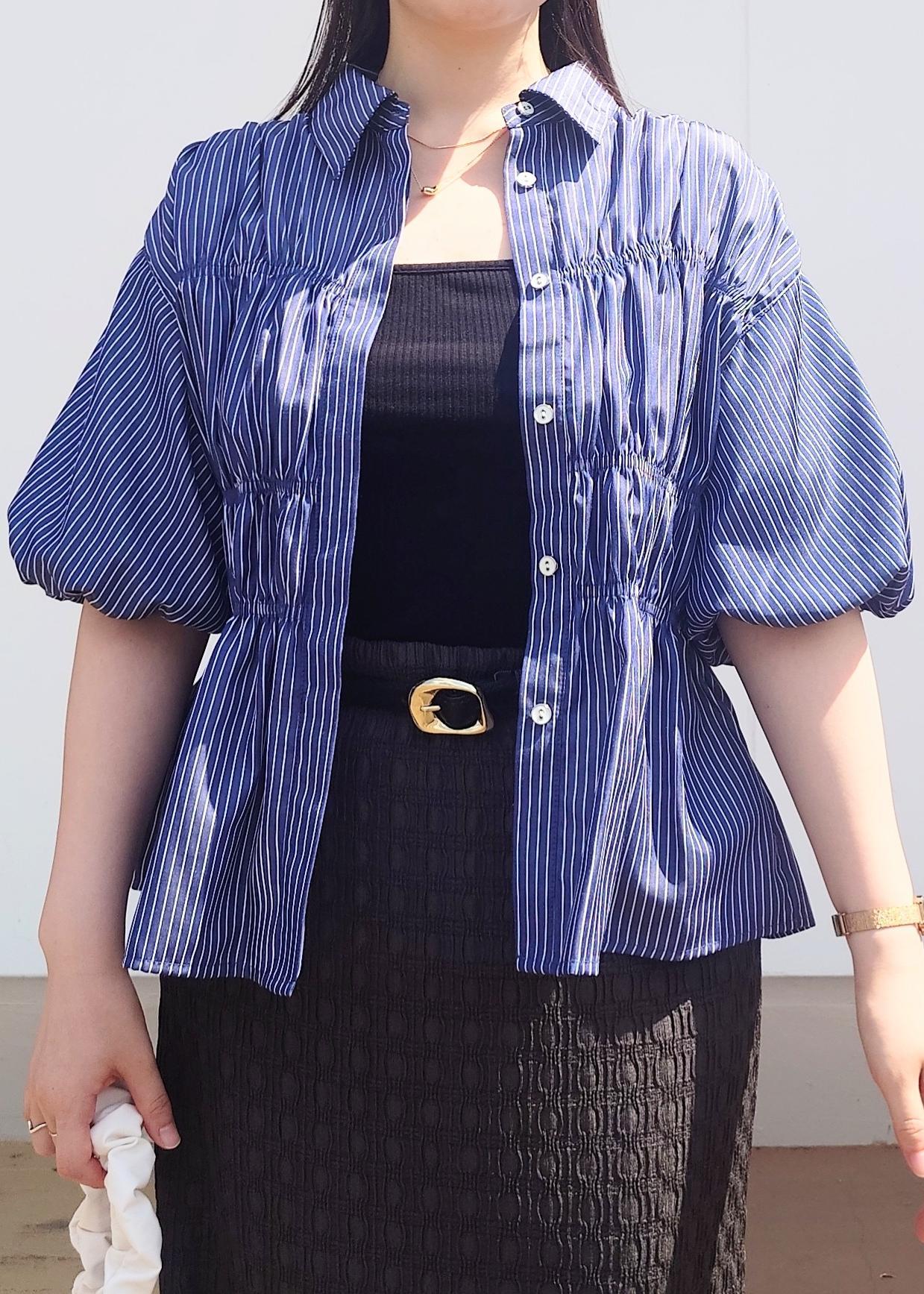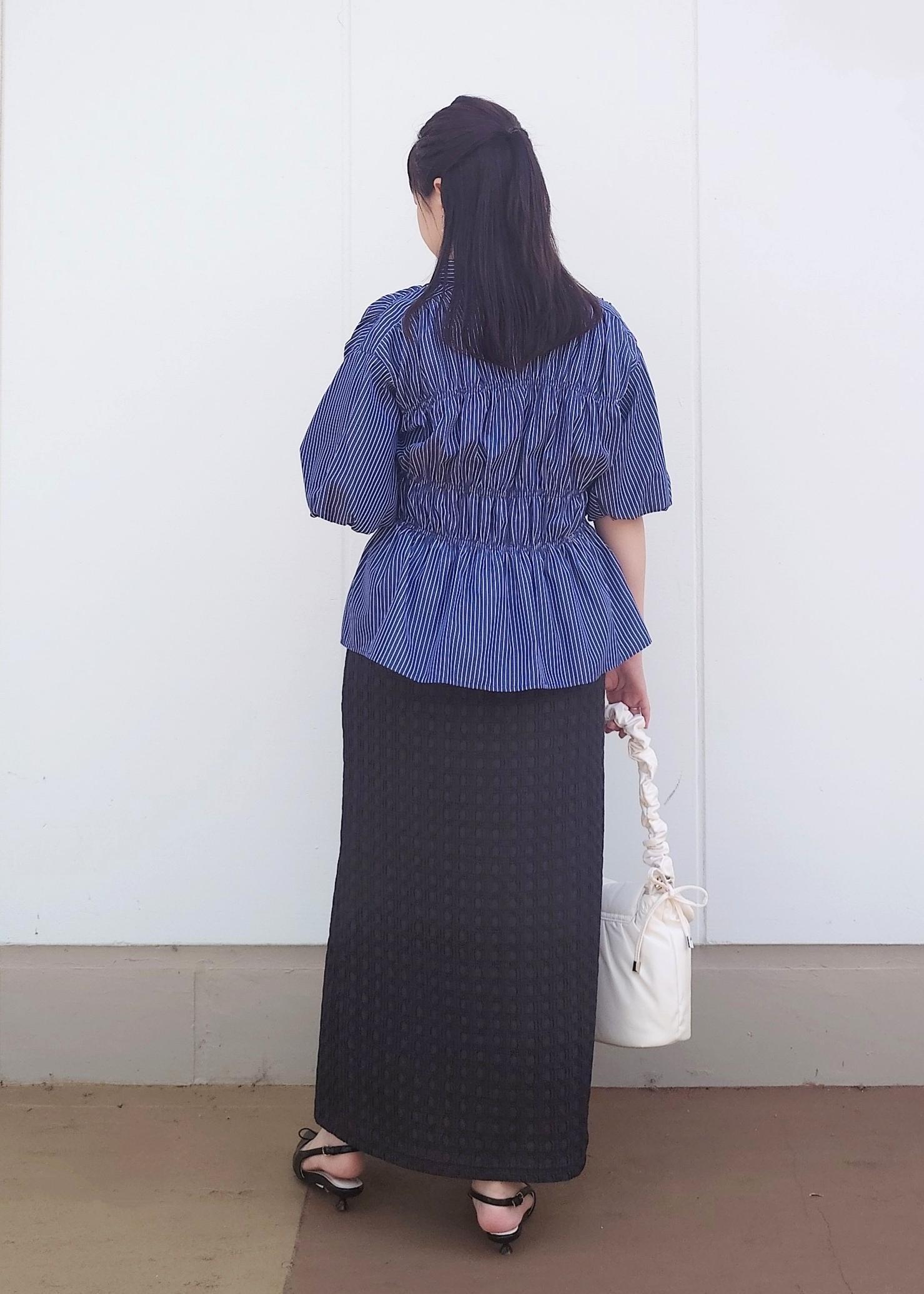 身頃のシャーリングや袖口は締め付け感がないので、見た目よりも楽な着心地です。