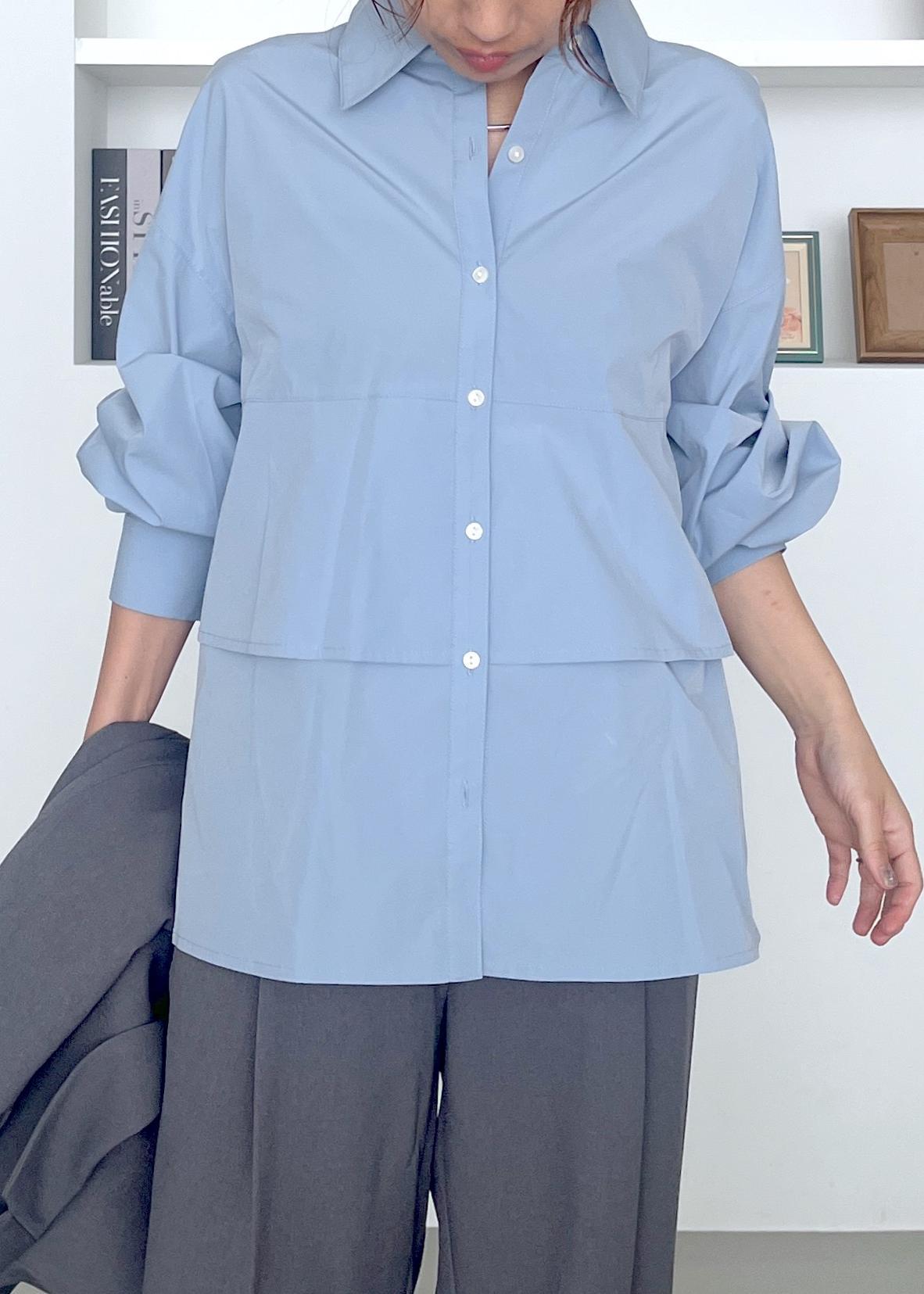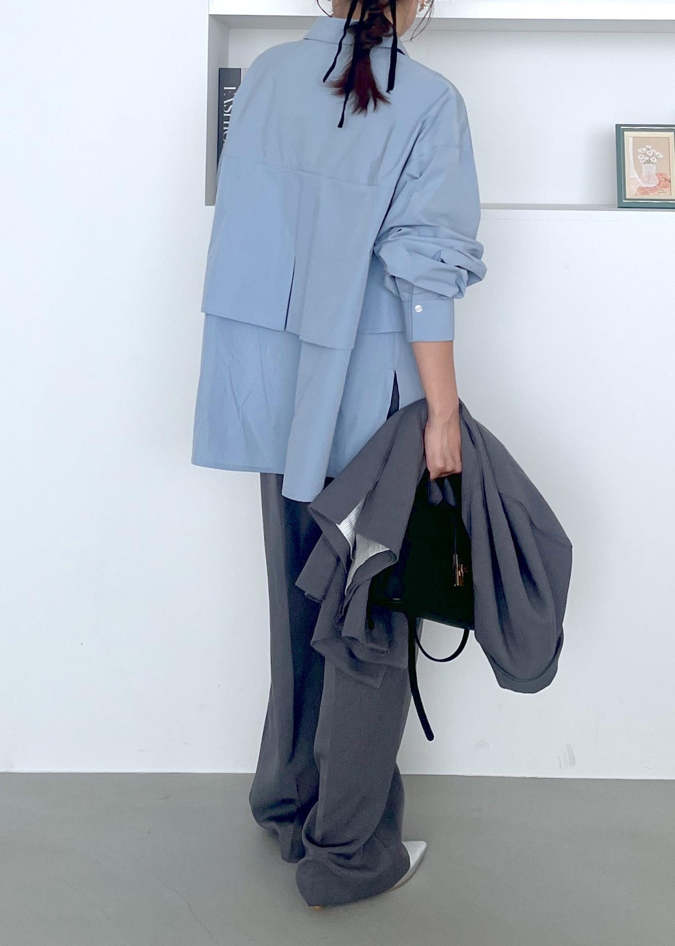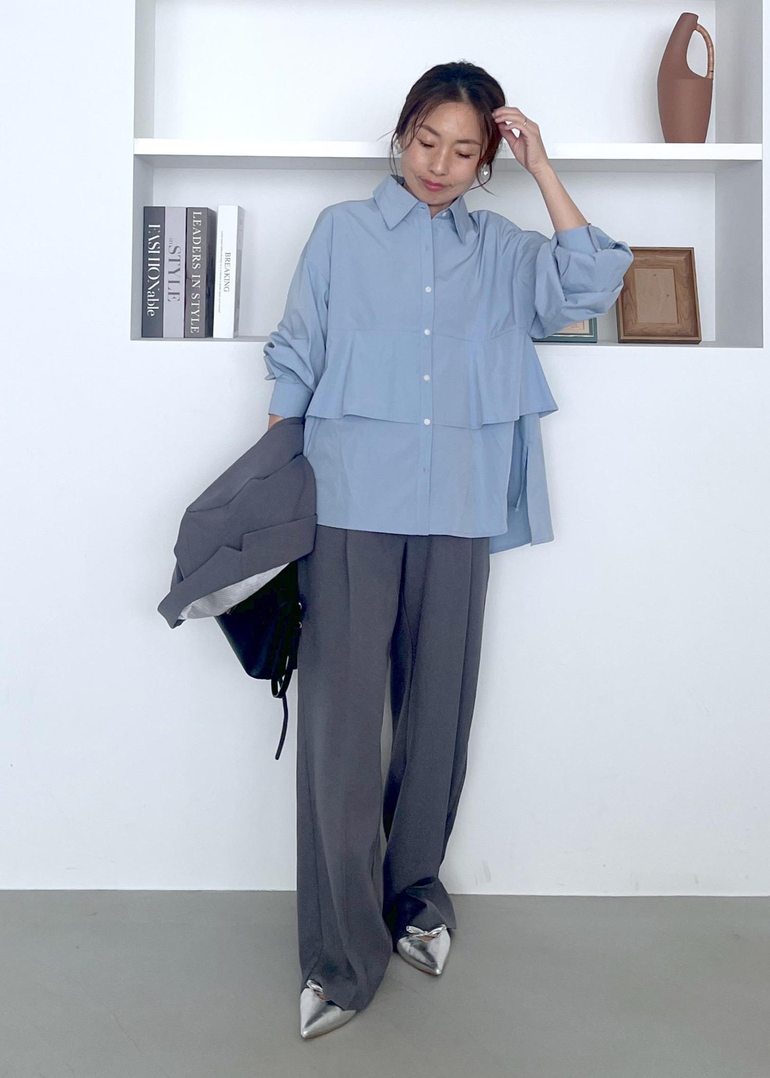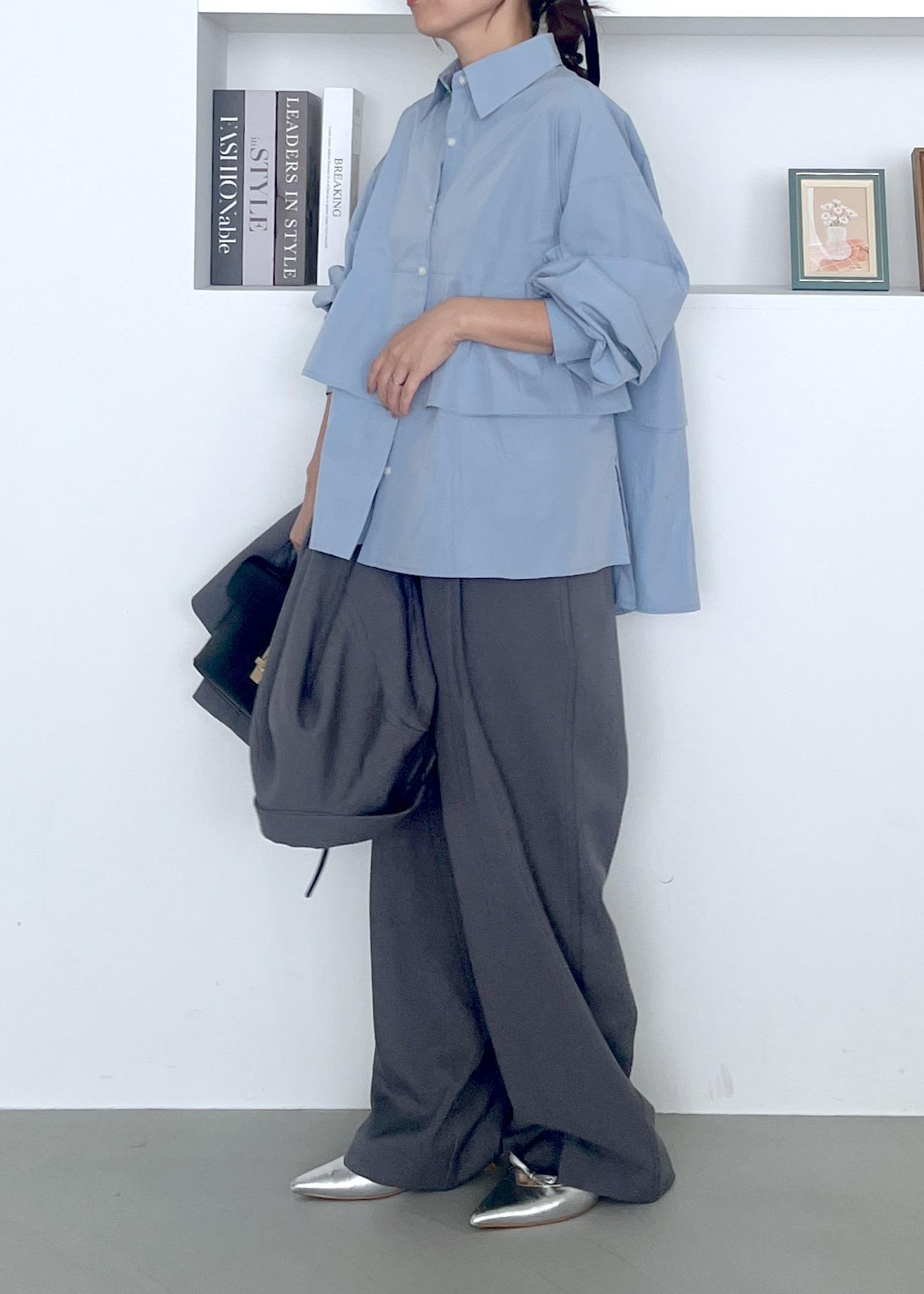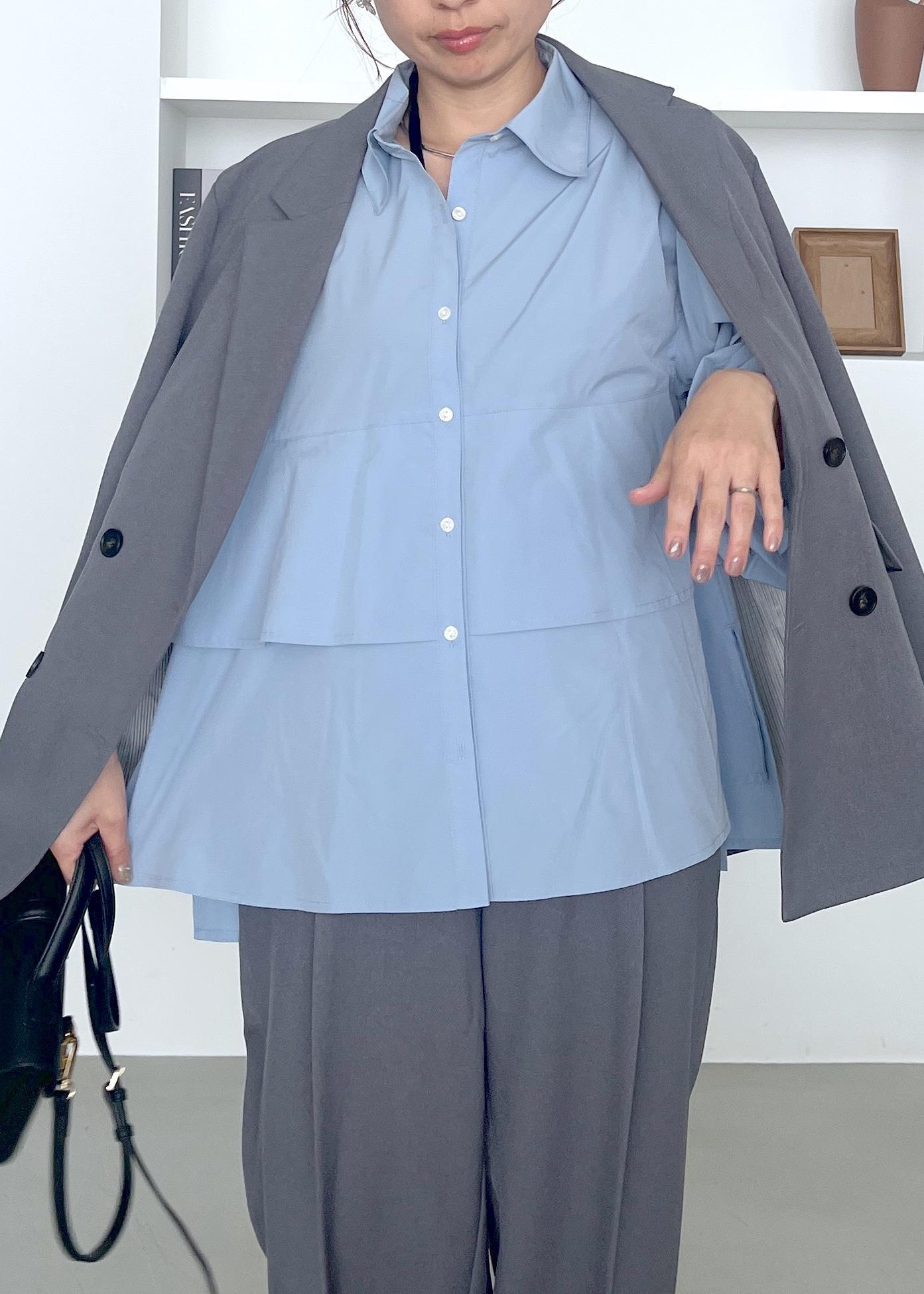 VIS裾ティアードオーバーシャツ/UVケア・イージーケアサックス / F¥2,965レビュー152cmでFサイズ着用し、着丈はお尻が隠れるくらいの丈。長さと裾ティアードのデザインがお腹、お尻まわりのカバーしてくれて◎オーバーサイズで着られてしまうかな?と思いましたが袖部分をグッとまくって手首見せで着用すると、こなれ感もでて好きな着方でした。カチッとしすぎない遊び心あるデザインで着るだけで決まるブラウスです!