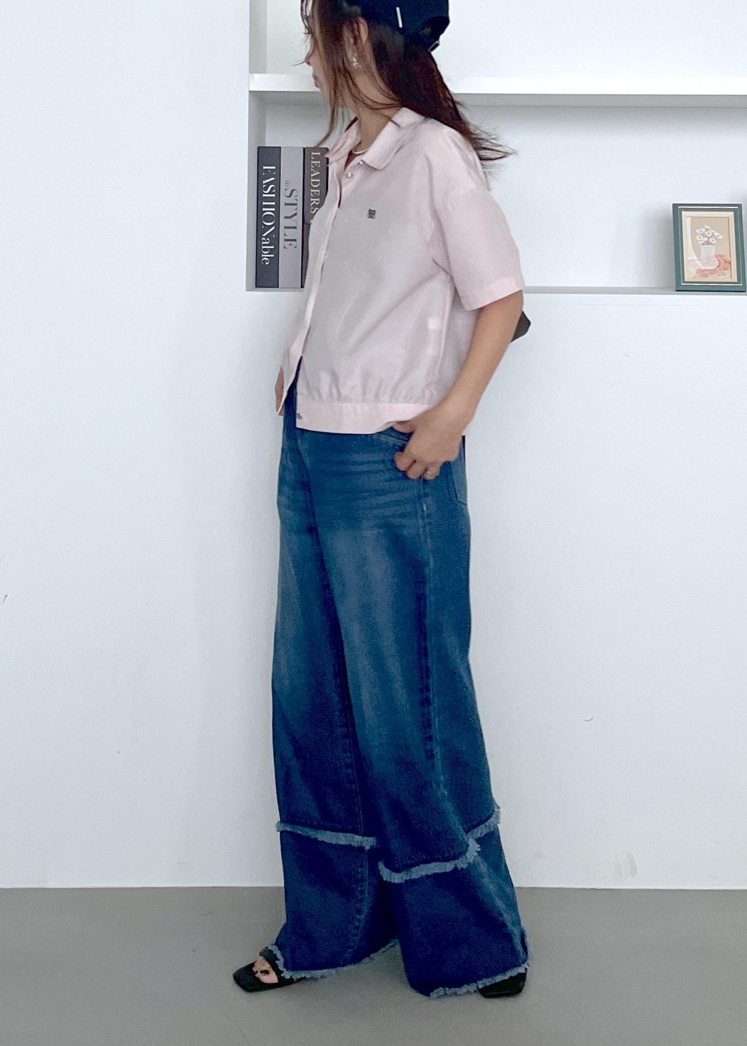 VISフリンジフレアデニムブルー系 / S¥4,395レビュー152cmでSサイズ着用し、ウエストジャストで着丈はペタンコ靴で床につかない丈でした。程よくフレアになったセミワイドシルエットがとってもキレイ♫しかもフリンジデザインが他にはなくて◎デニム好きとしては絶対にGETしたい一本。サックスのカラーでリアルバイです♡