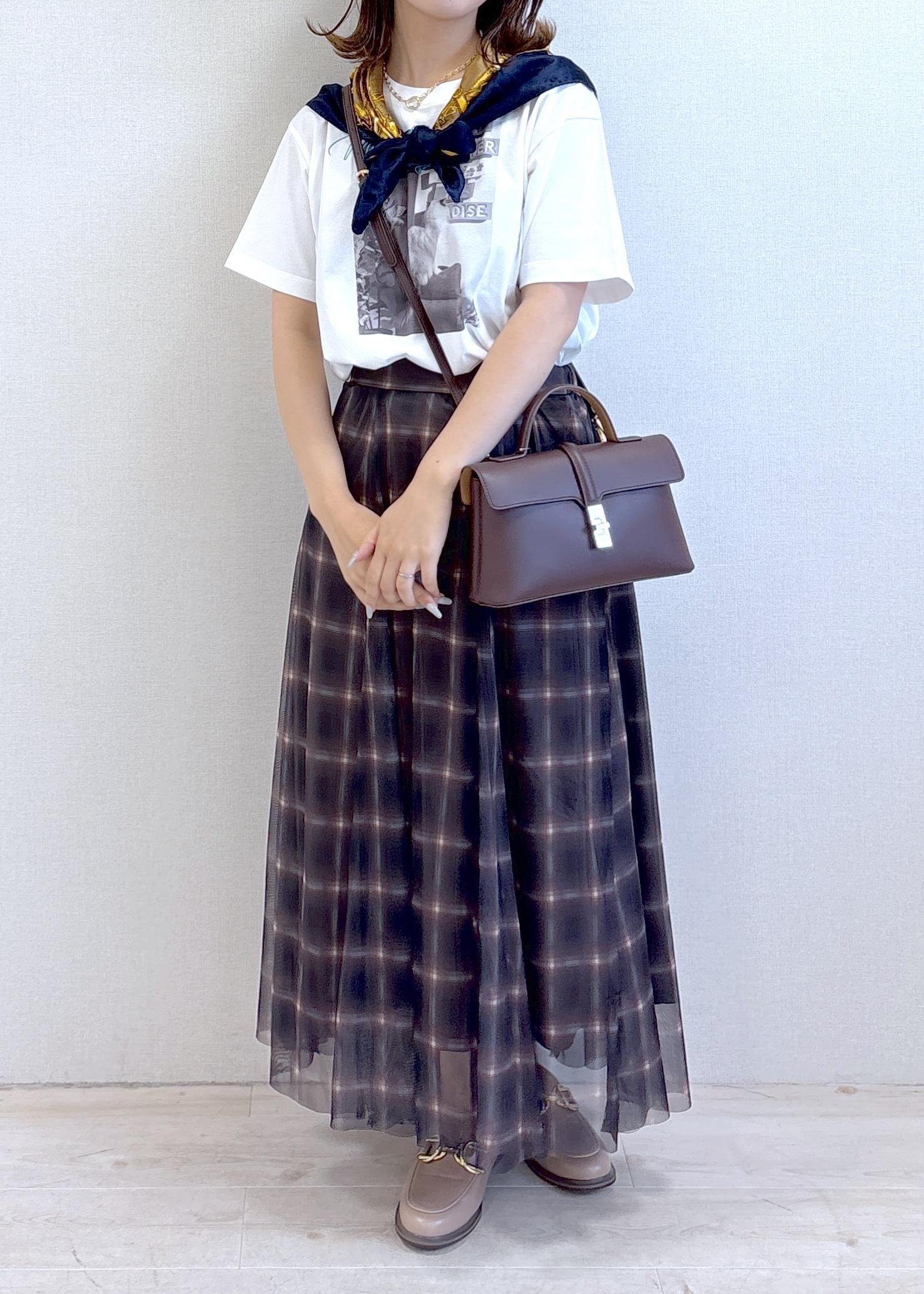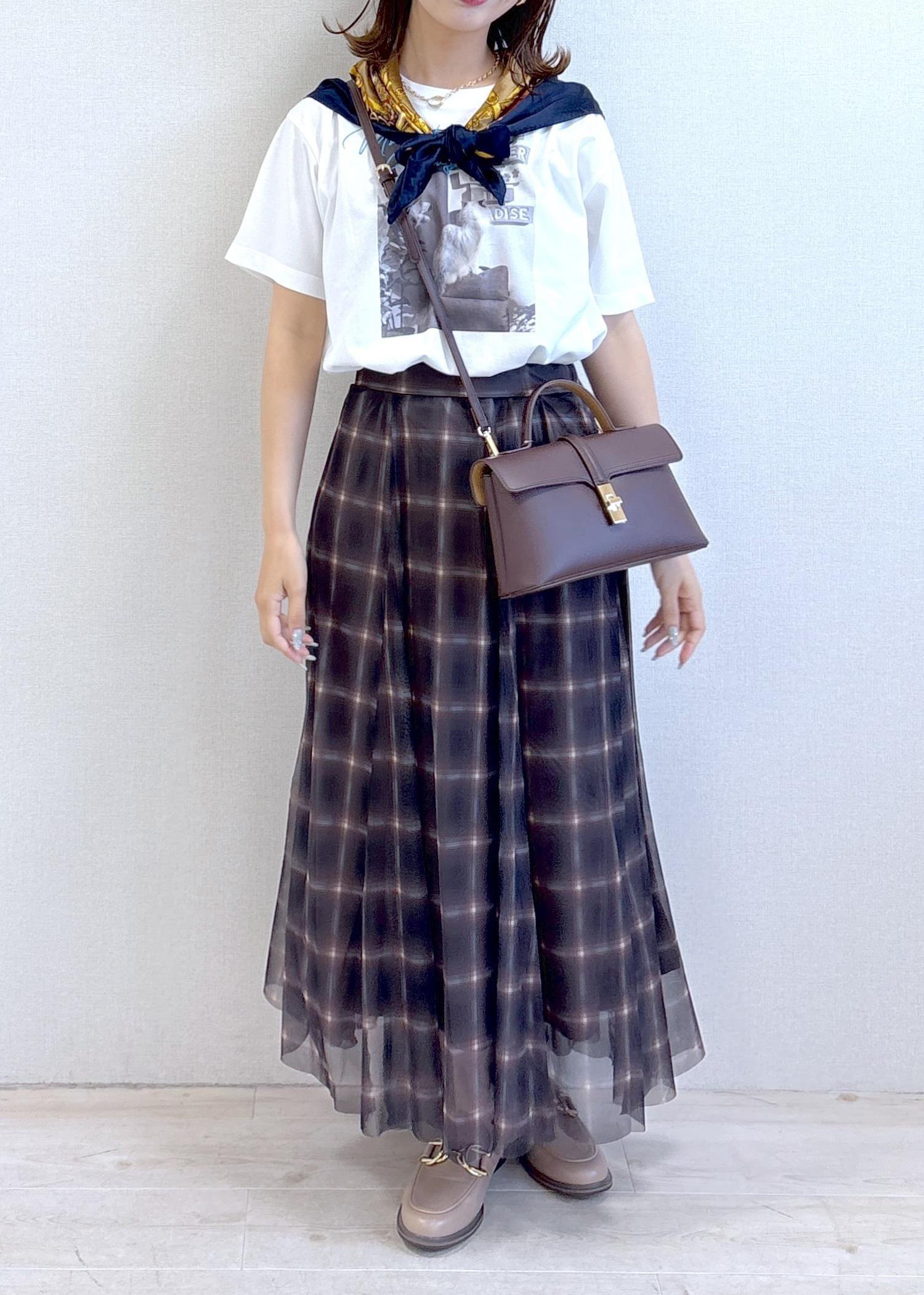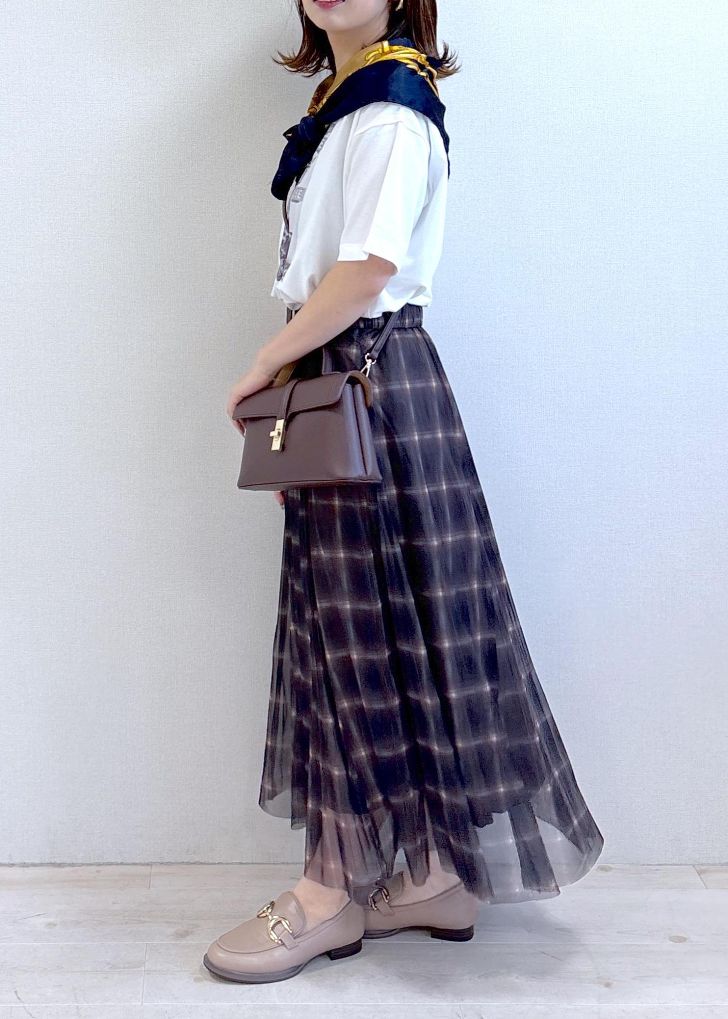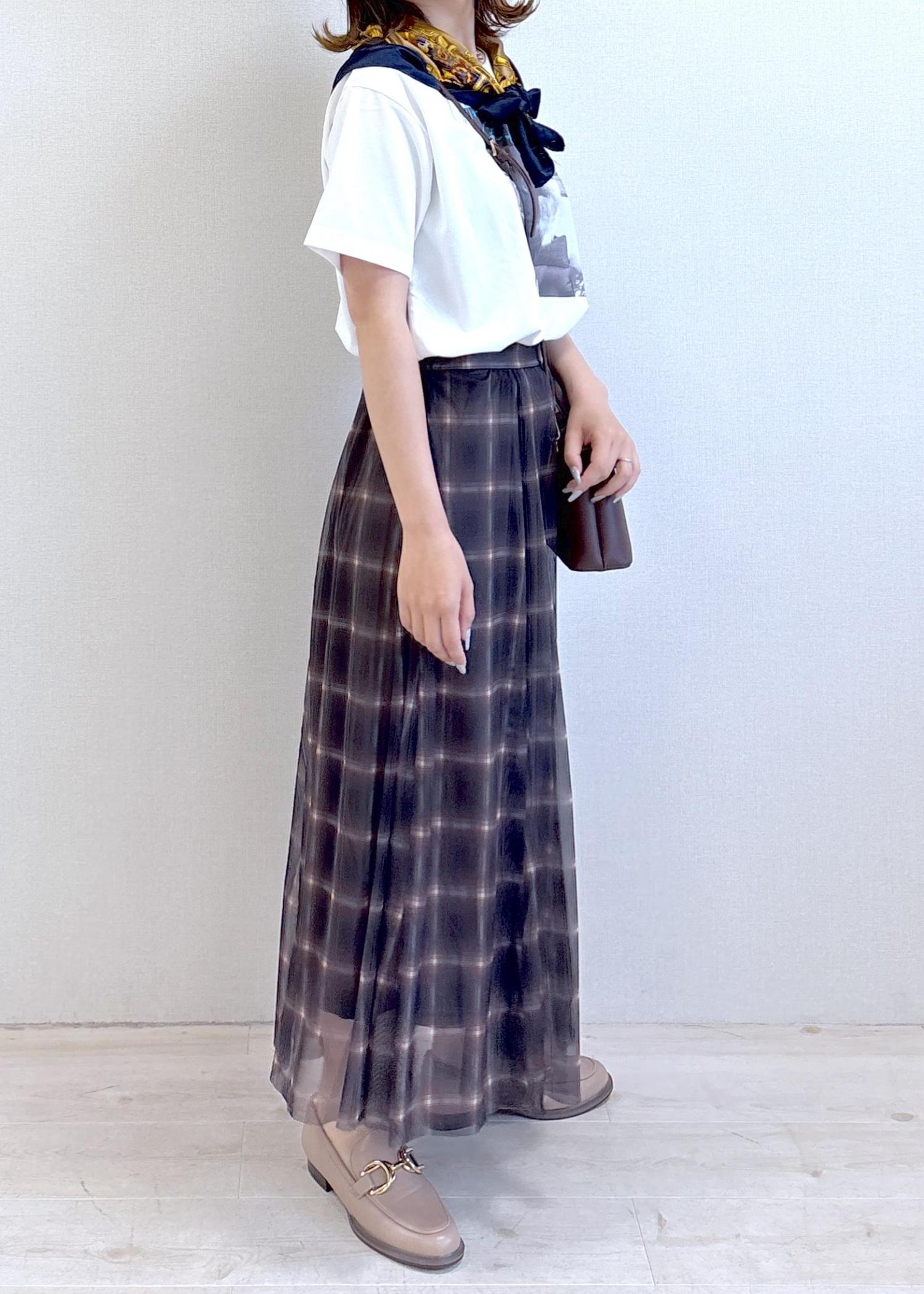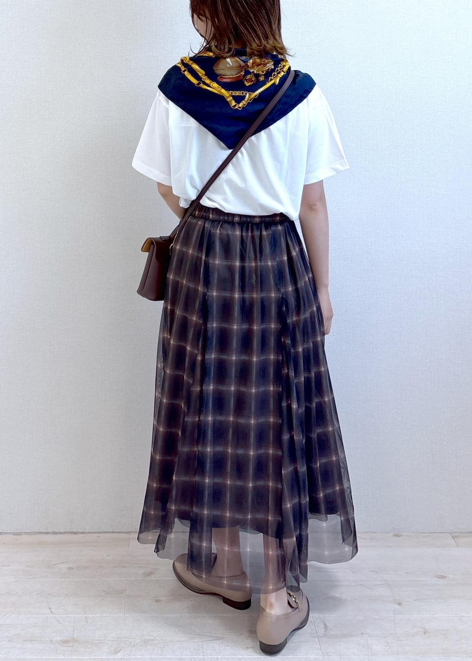 VIS【洗える】チュールプリントチェックスカートダークブラウン系 / F¥4,612レビュー長めの丈ながらほどよく足元に抜け感のあるデザインで、素材も柔らかいのでとっても着やすいです!