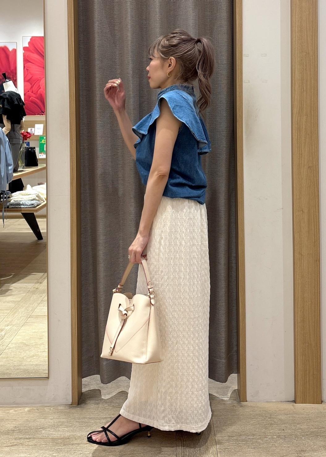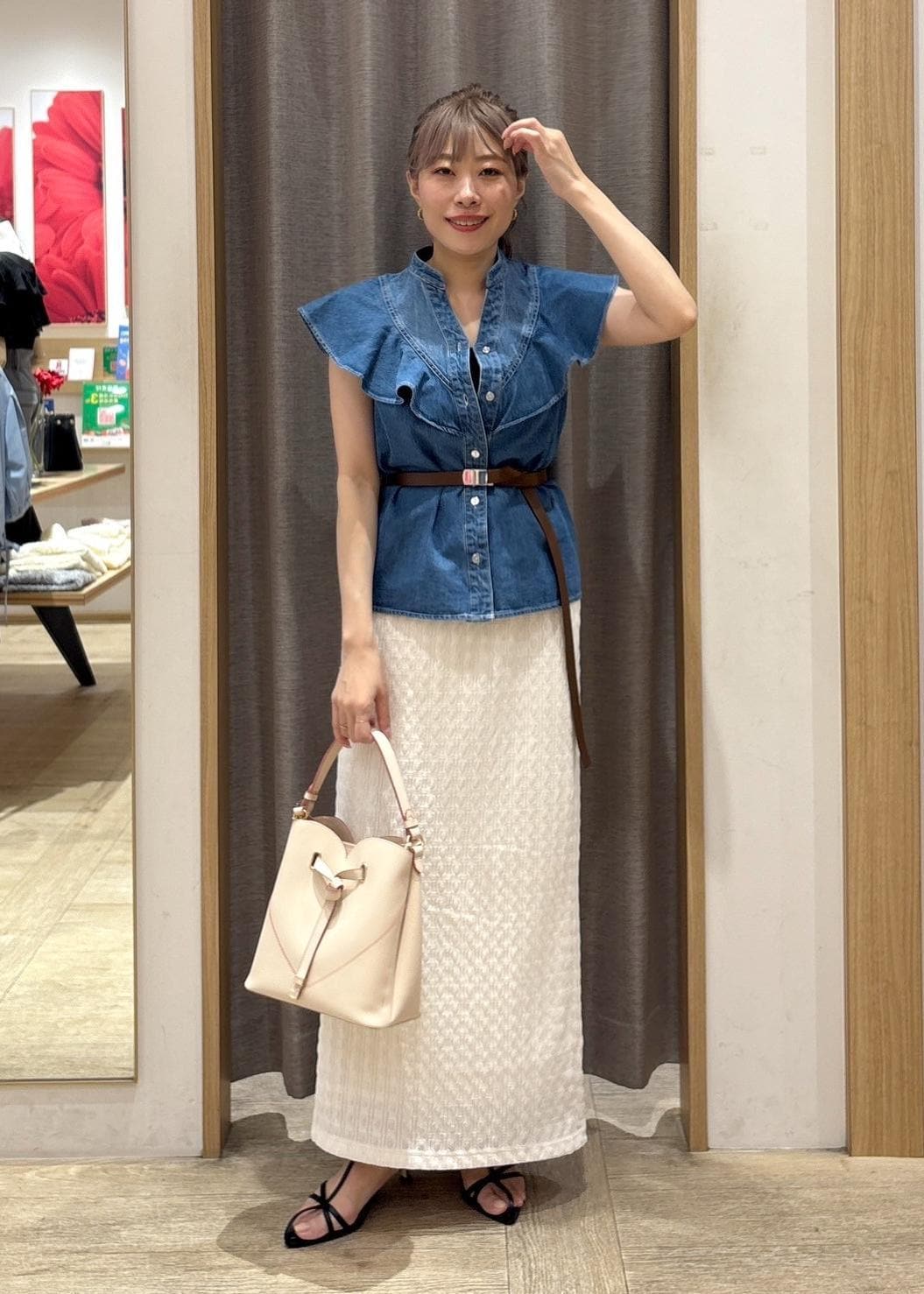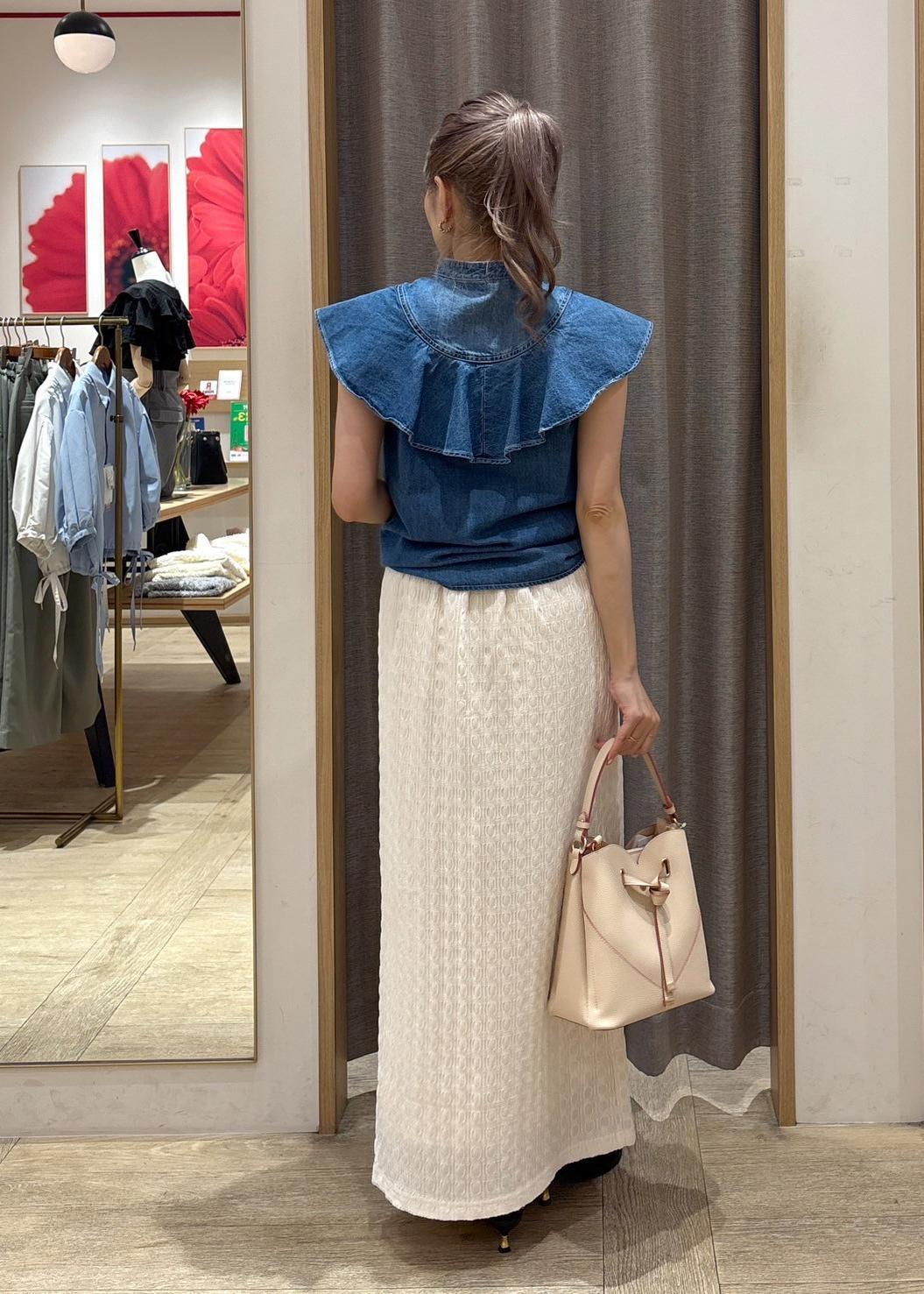 存在感抜群のデニムブラウスは、ホワイトカラーのスカートで清涼感をプラスしました。