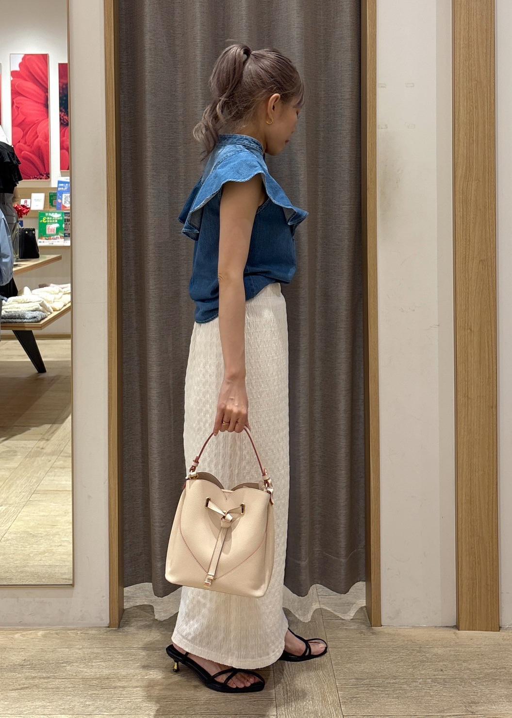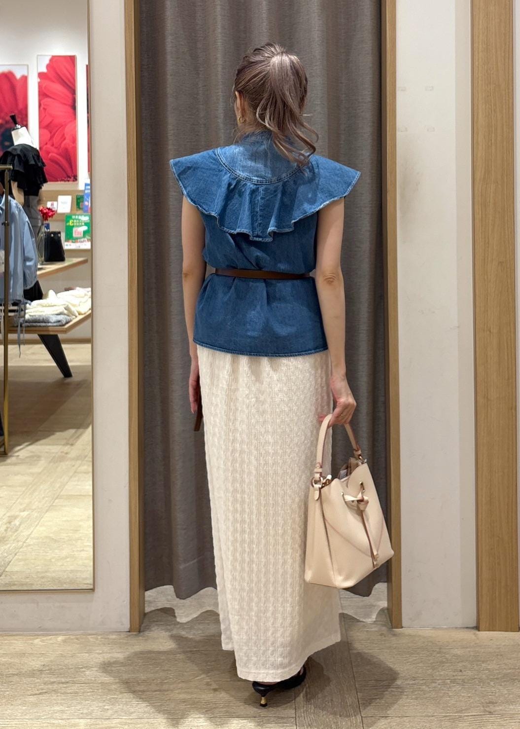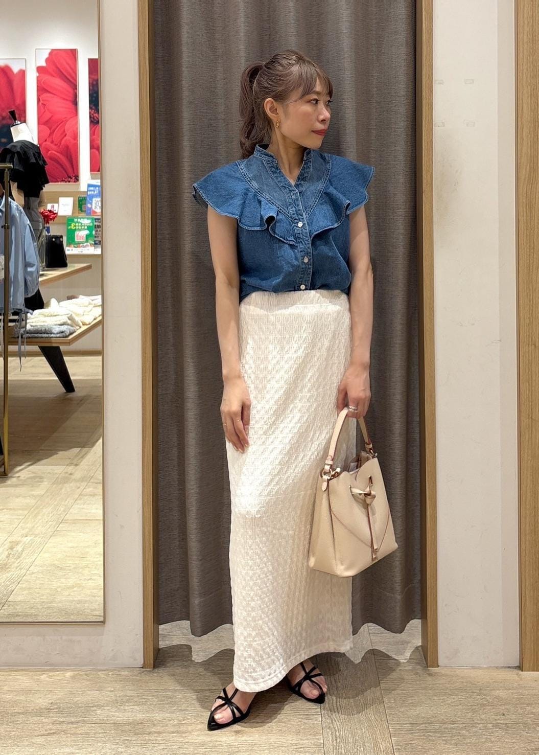 存在感抜群のデニムブラウスは、ホワイトカラーのスカートで清涼感をプラスしました。