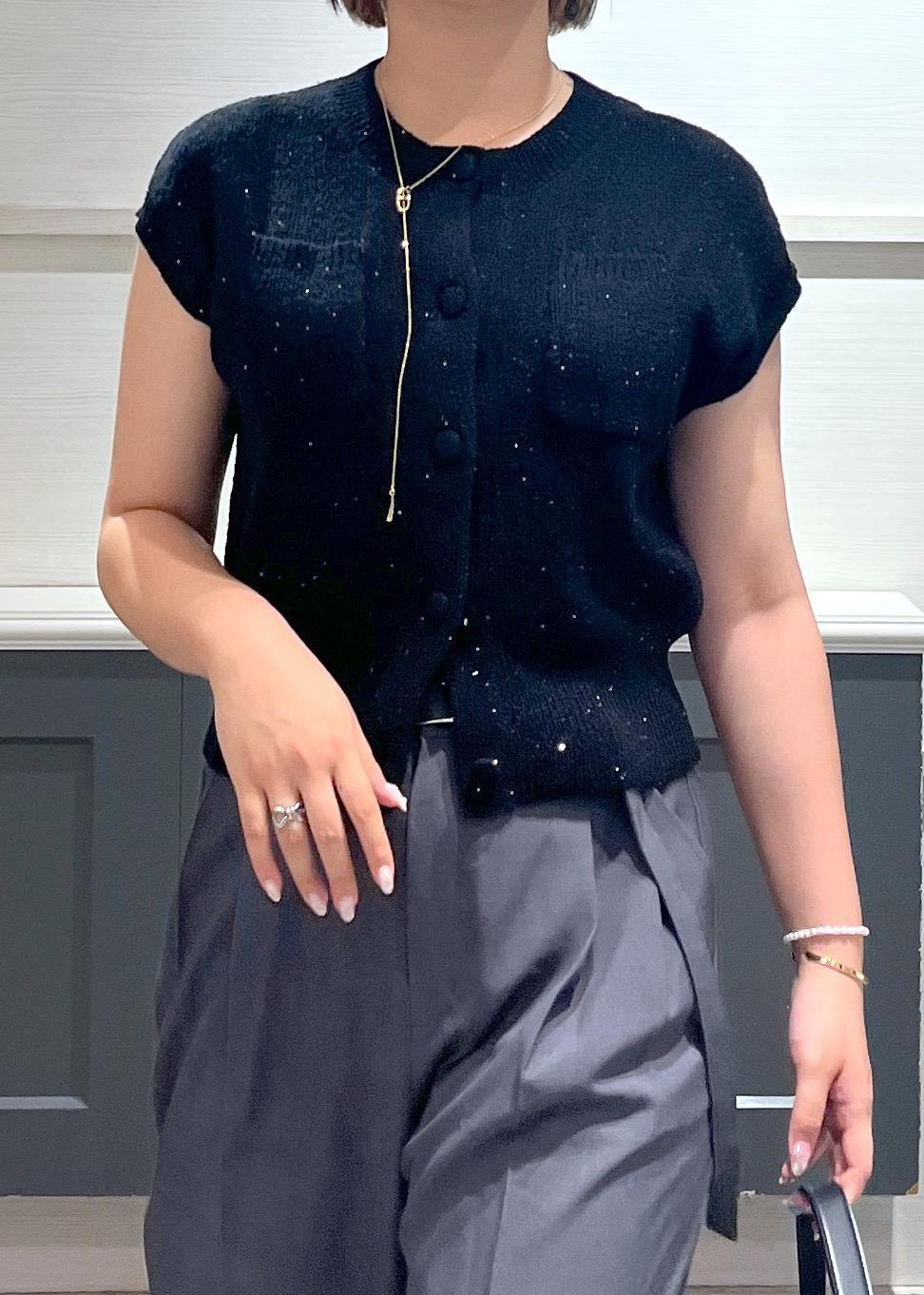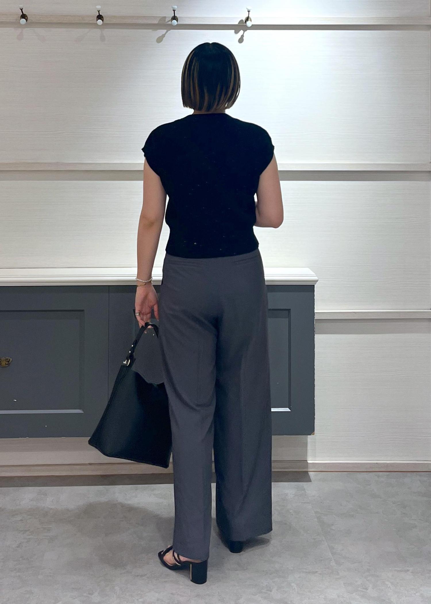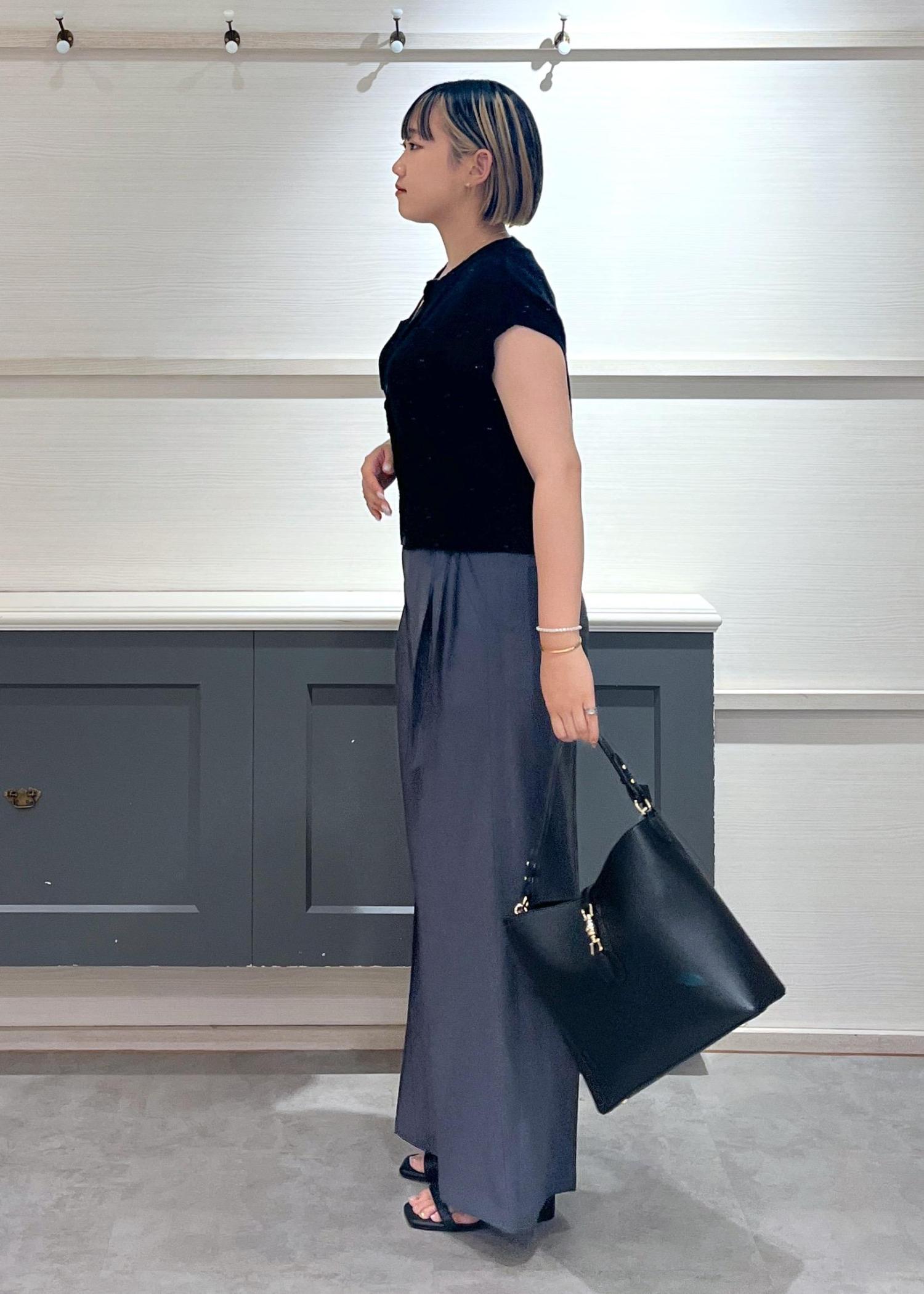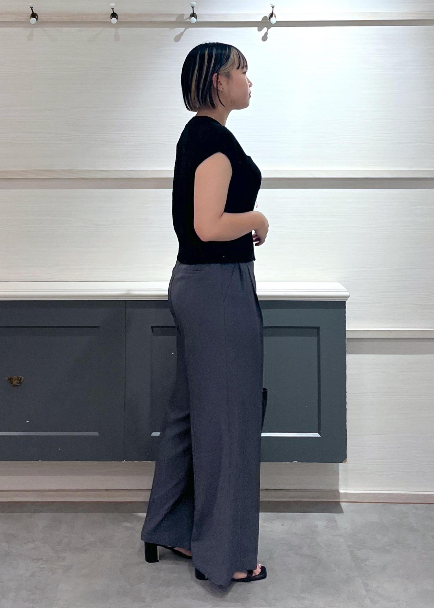 黒のサマーニットに、タック入りのグレーワイドパンツを合わせて、すっきりとしたスタイルにしました。