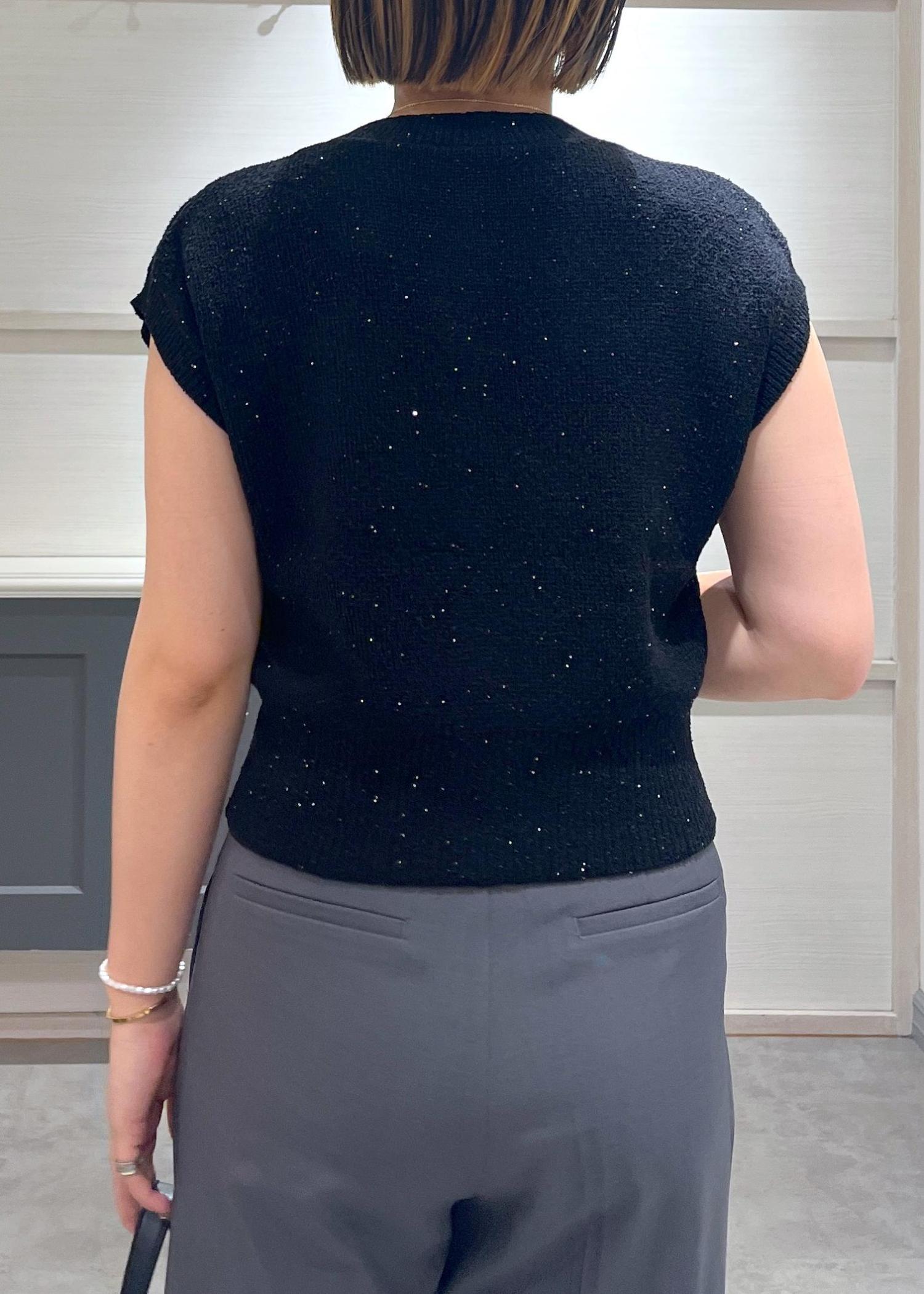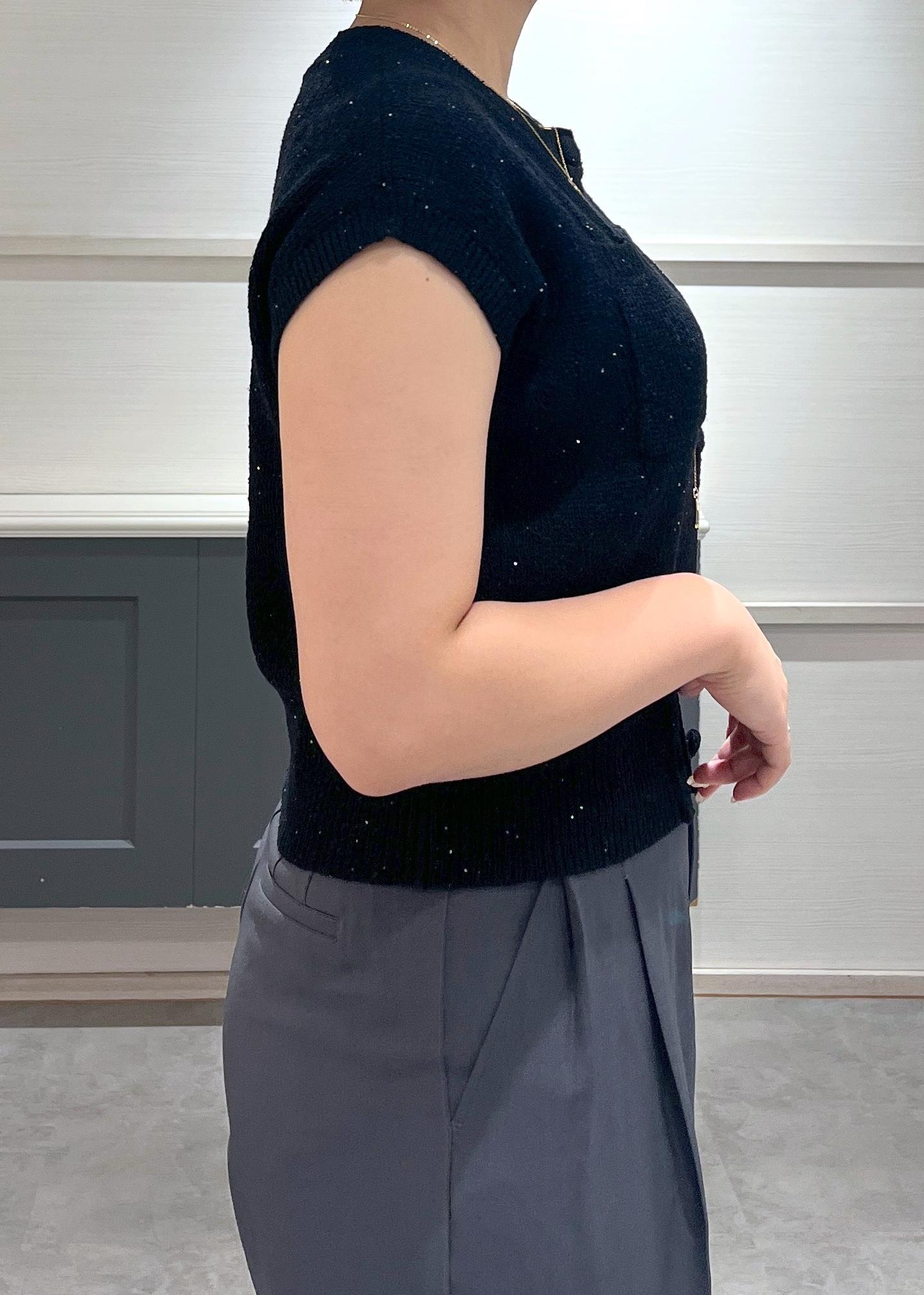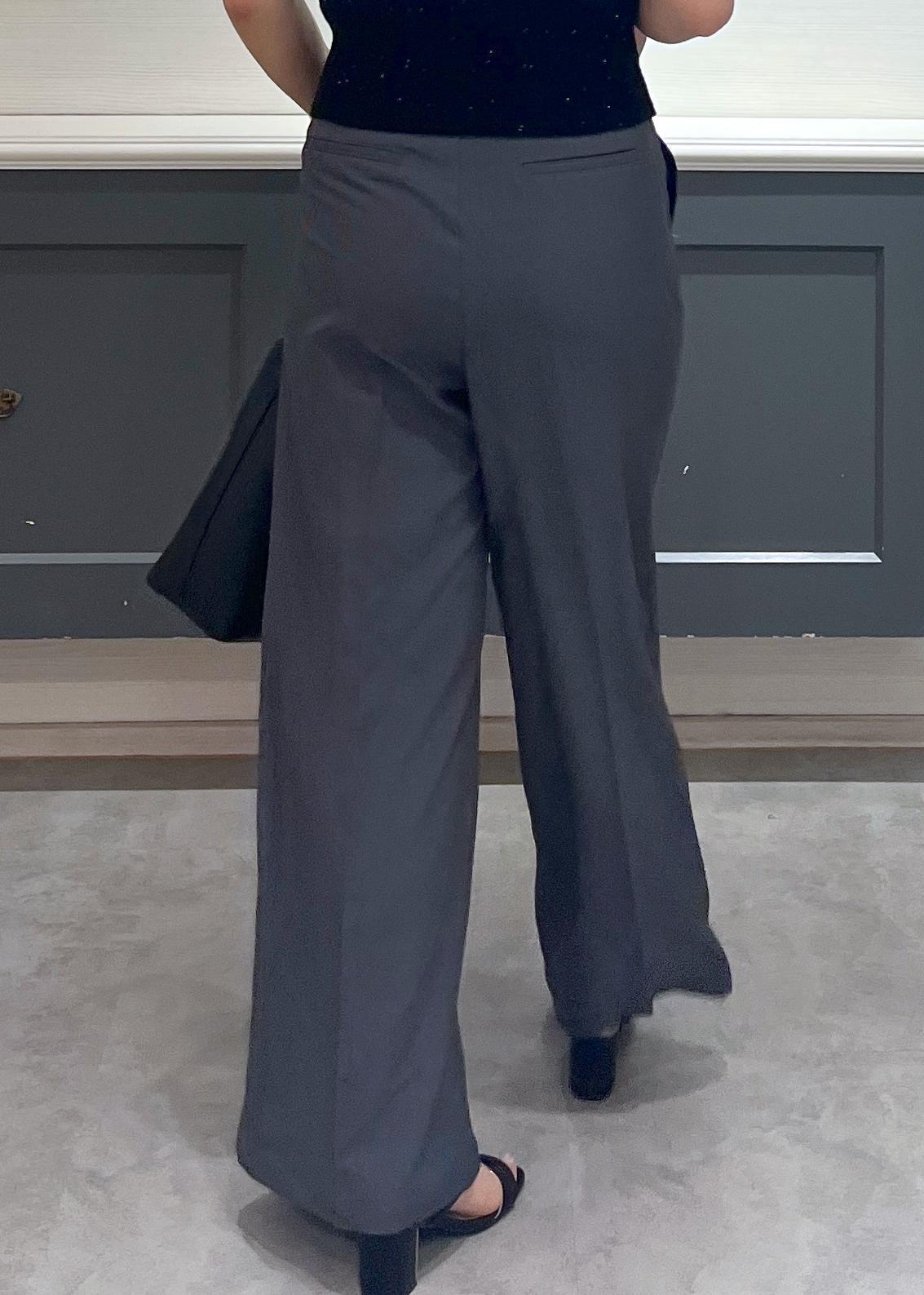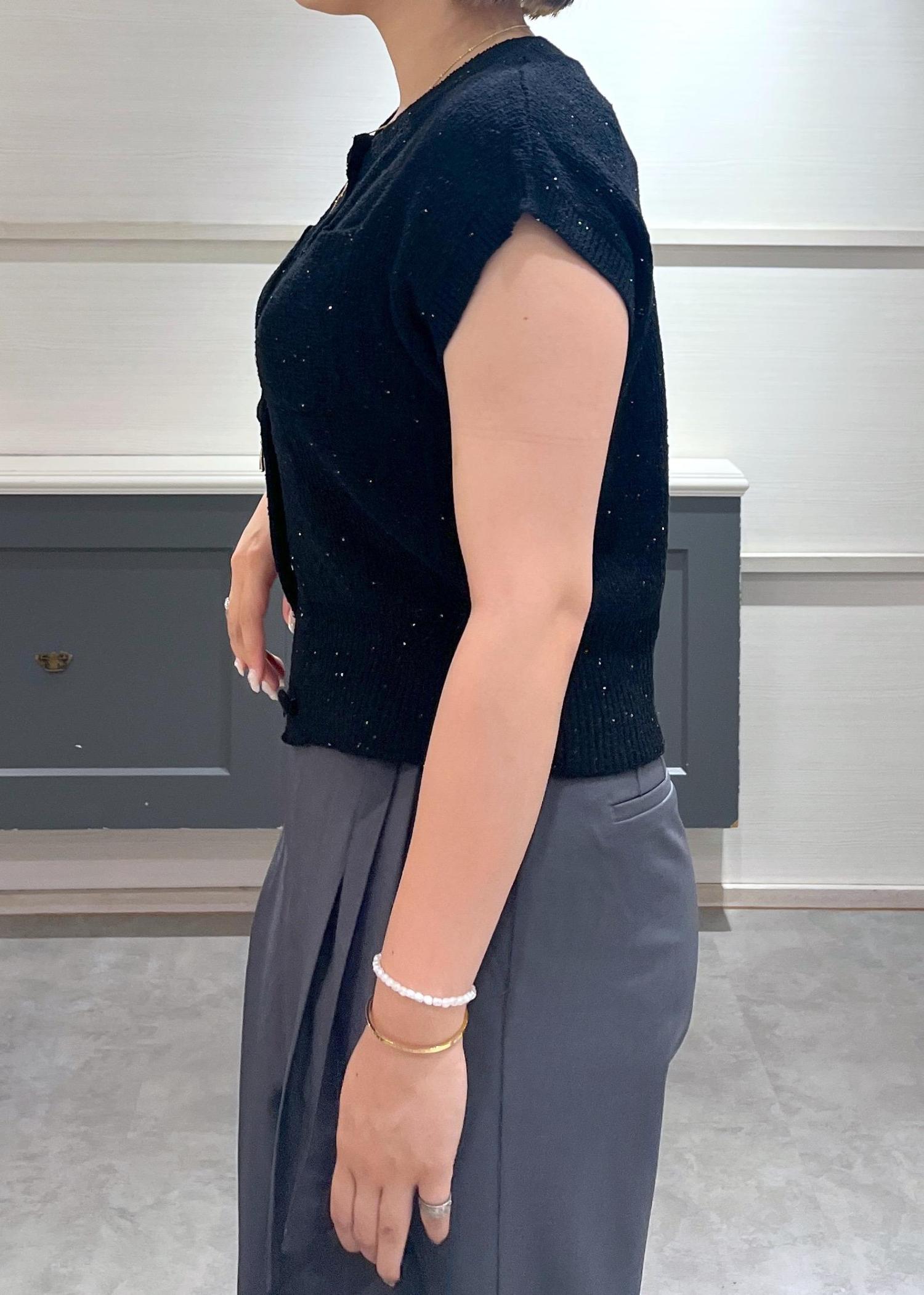 黒のサマーニットに、タック入りのグレーワイドパンツを合わせて、すっきりとしたスタイルにしました。