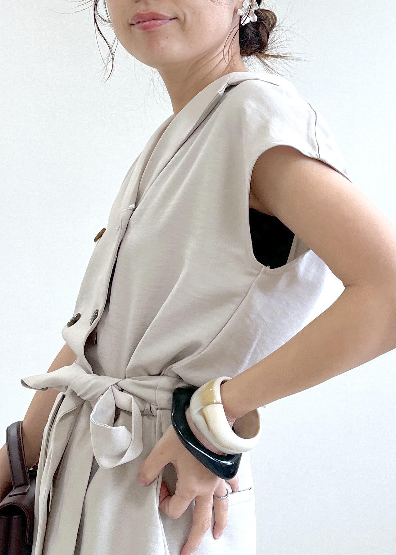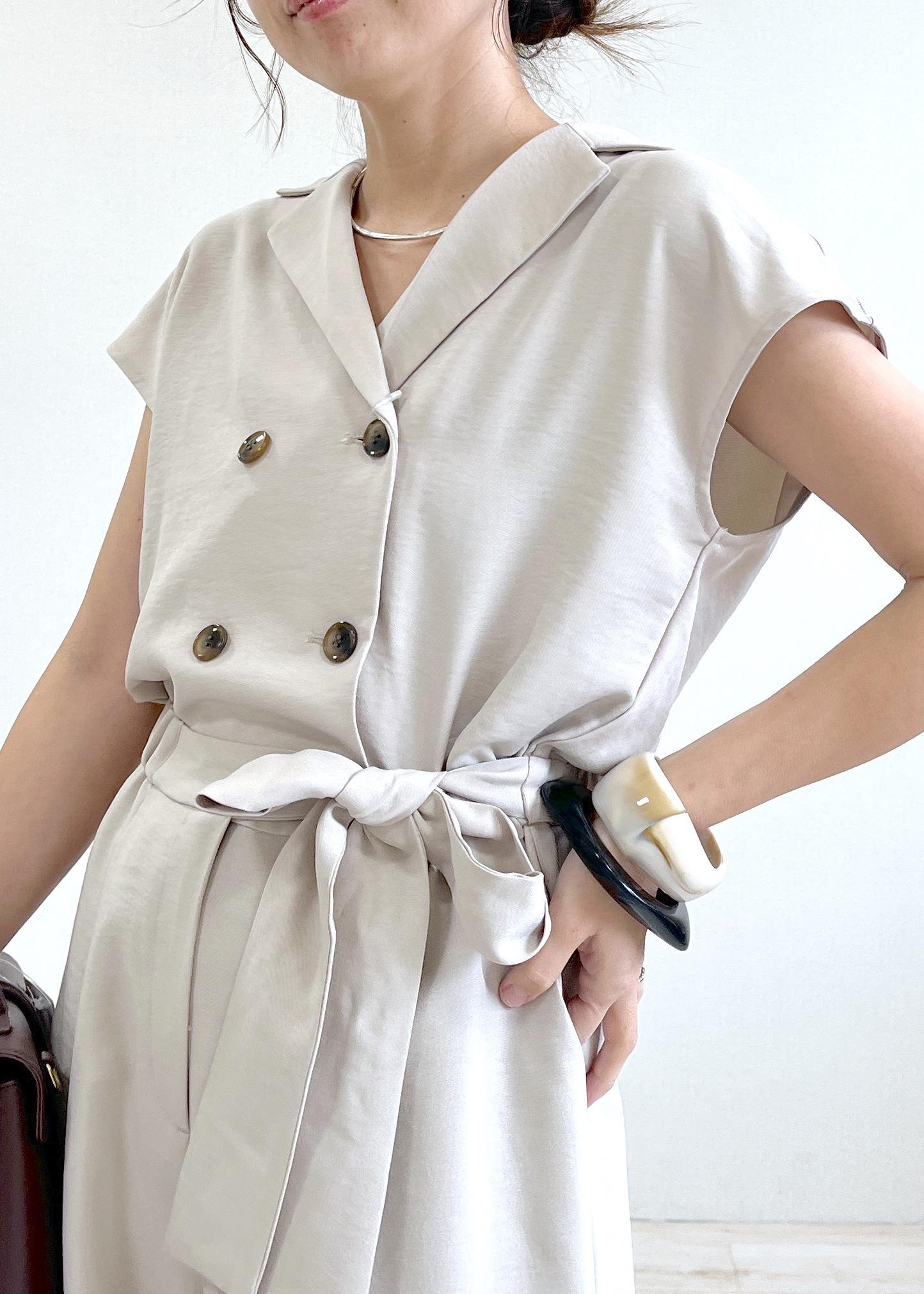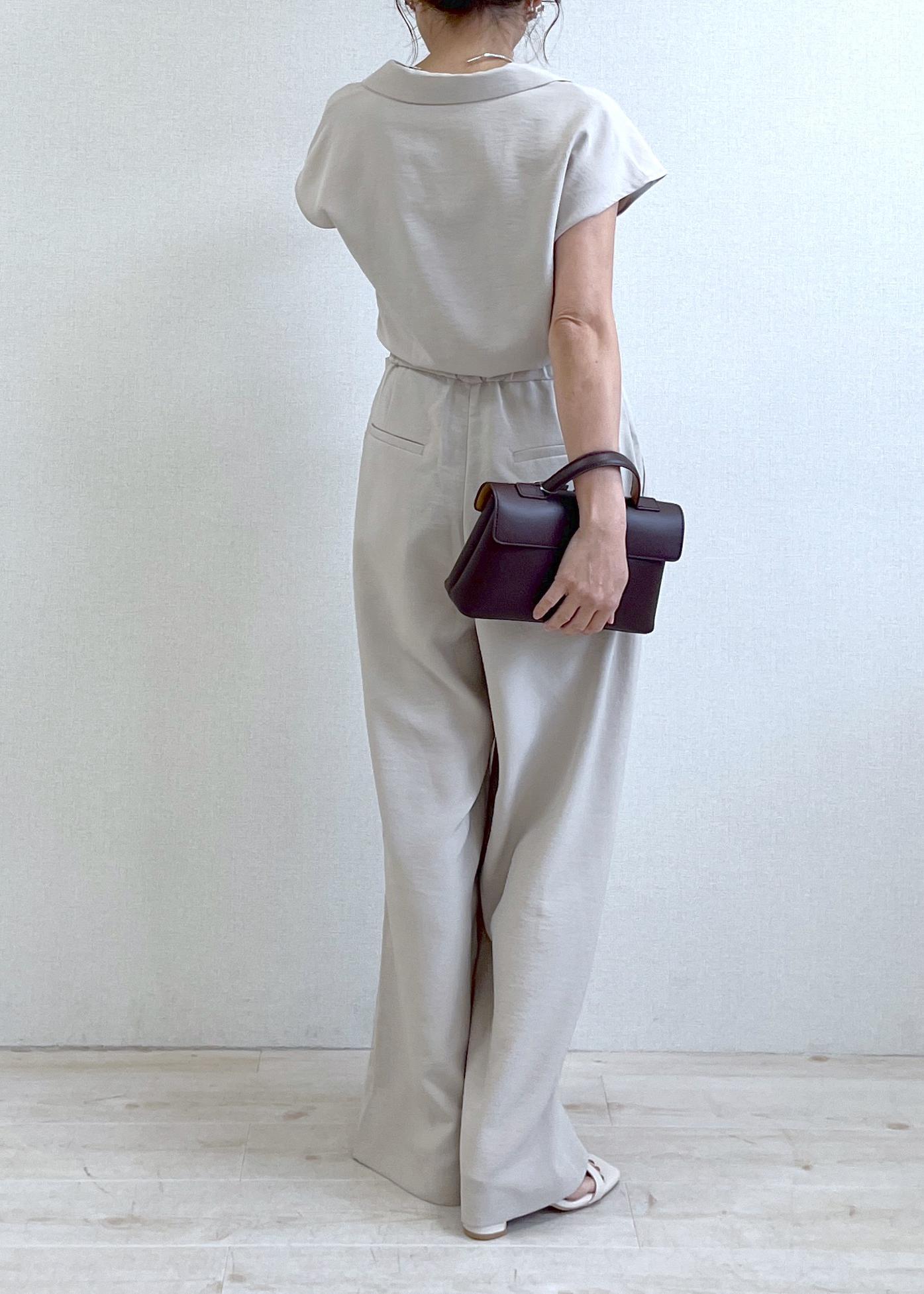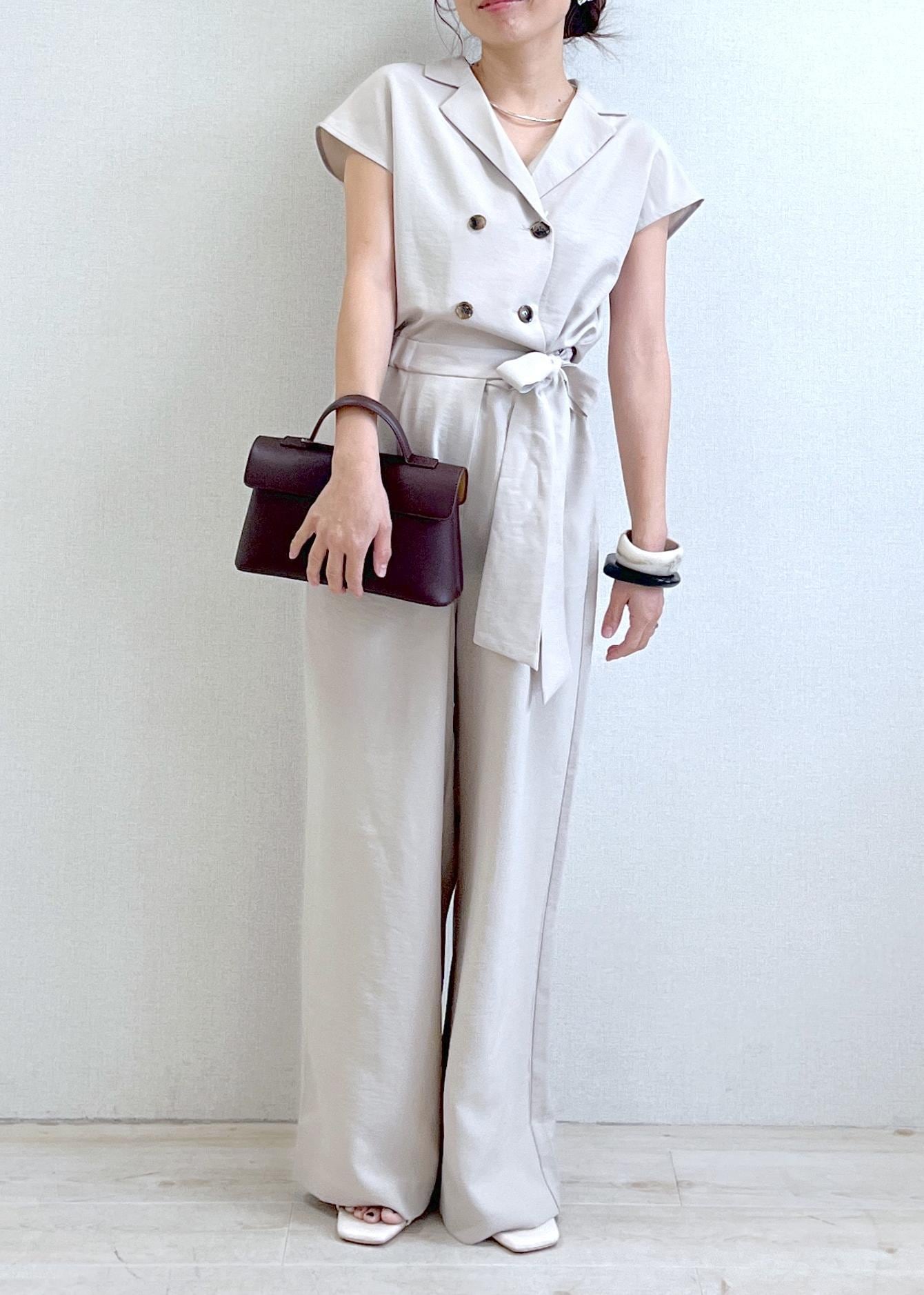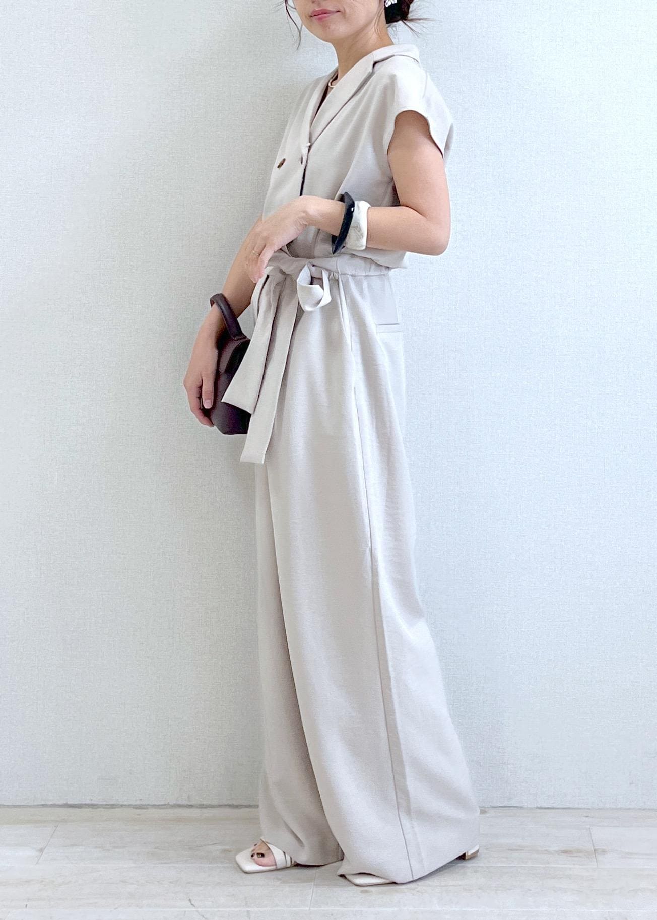 シャツ感覚でサラッと着られる、白っぽベージュのオールインワン。