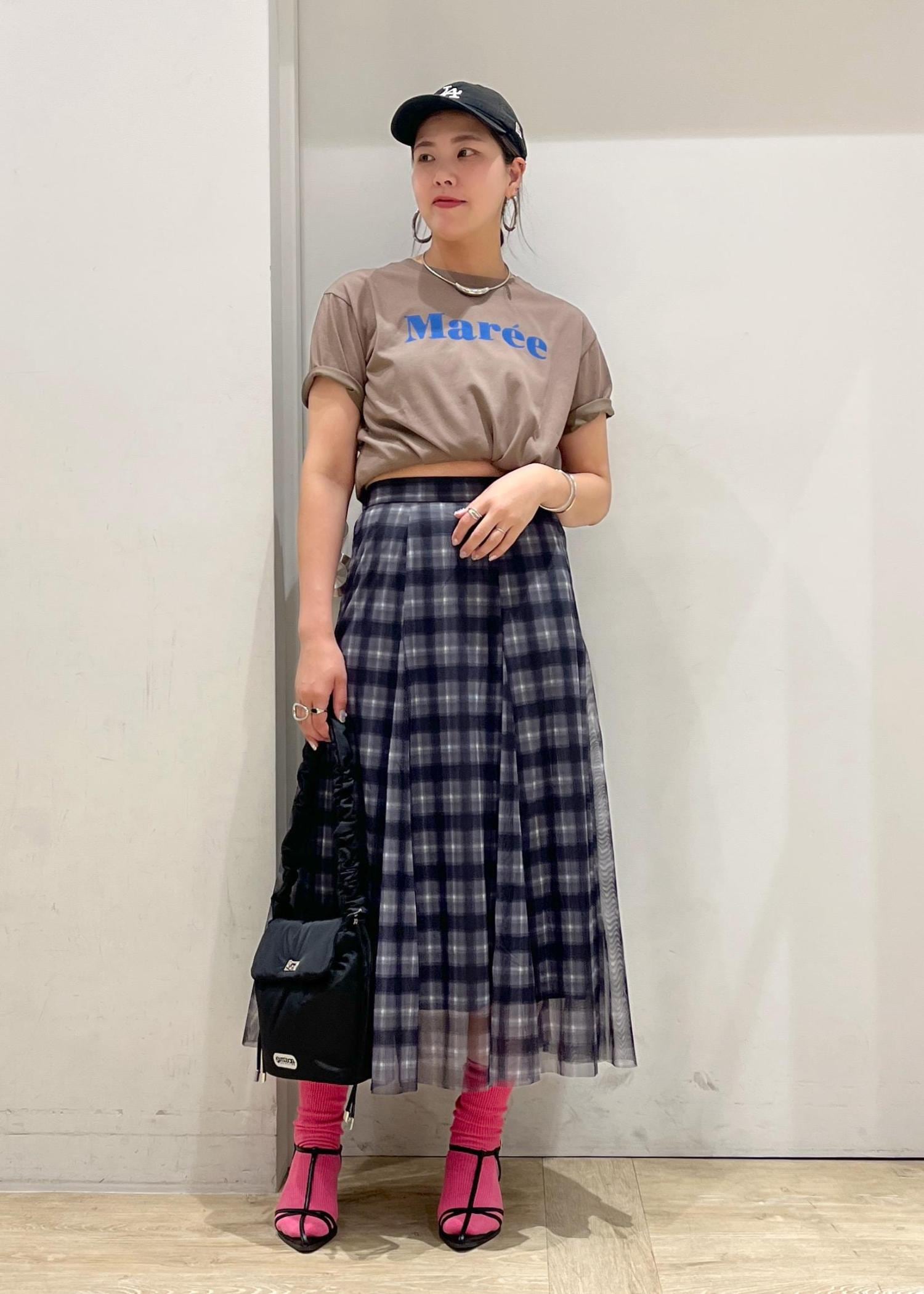 抜け感が出るようにトップスは絞ってチラッと肌見せがポイント。高身長ではスカートの丈感が絶妙だったので、靴下合わせでバランスをとってサンダル合わせが可愛かった♡
