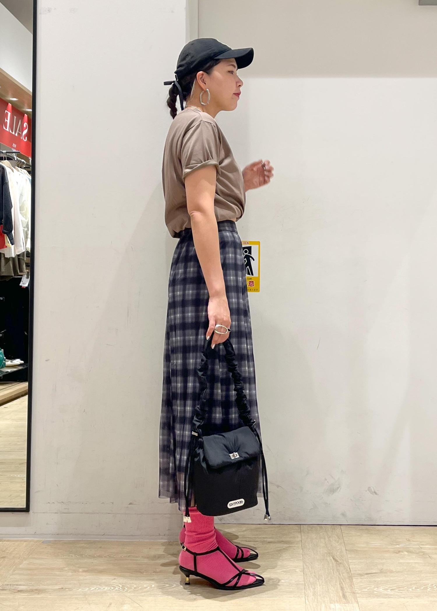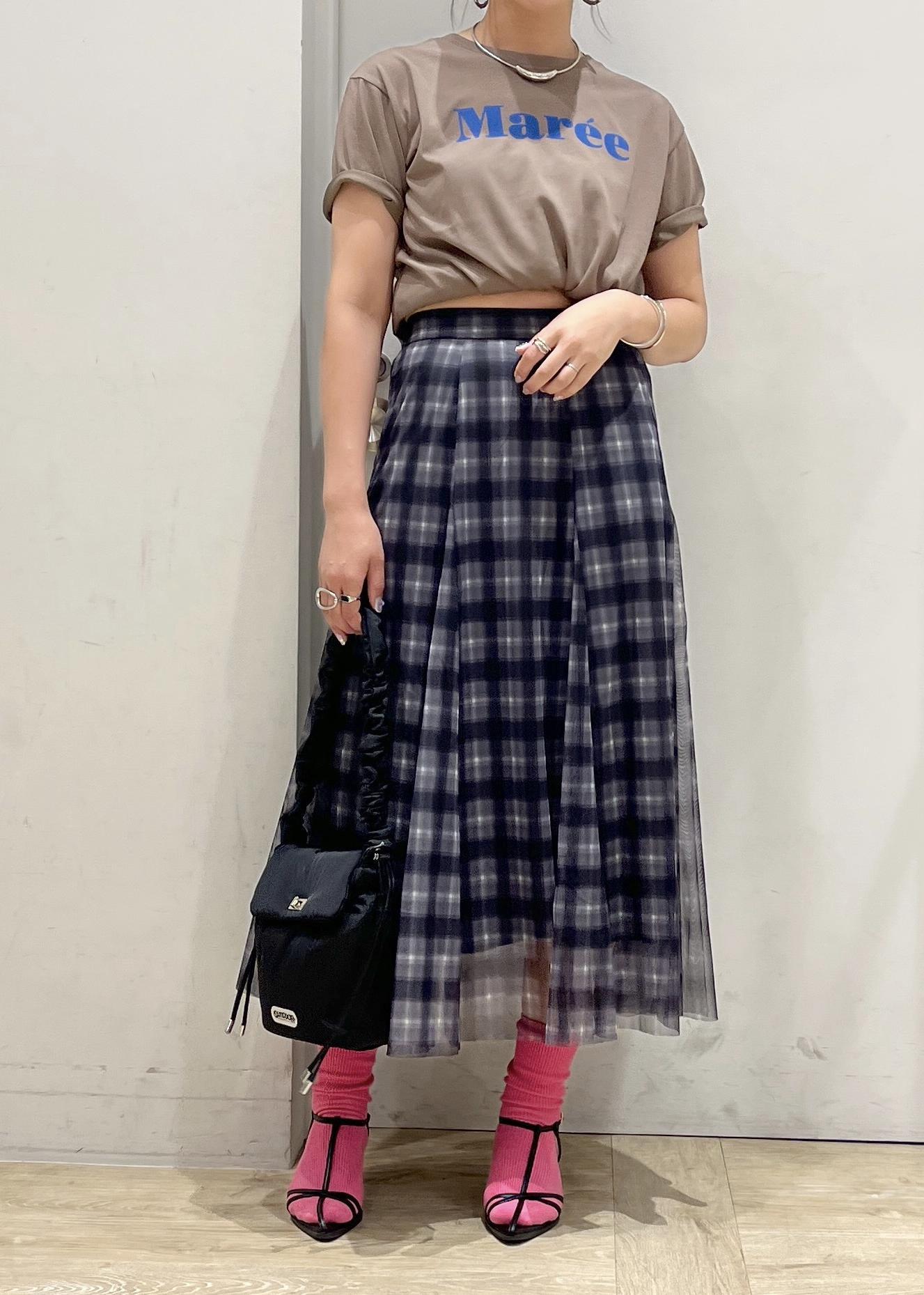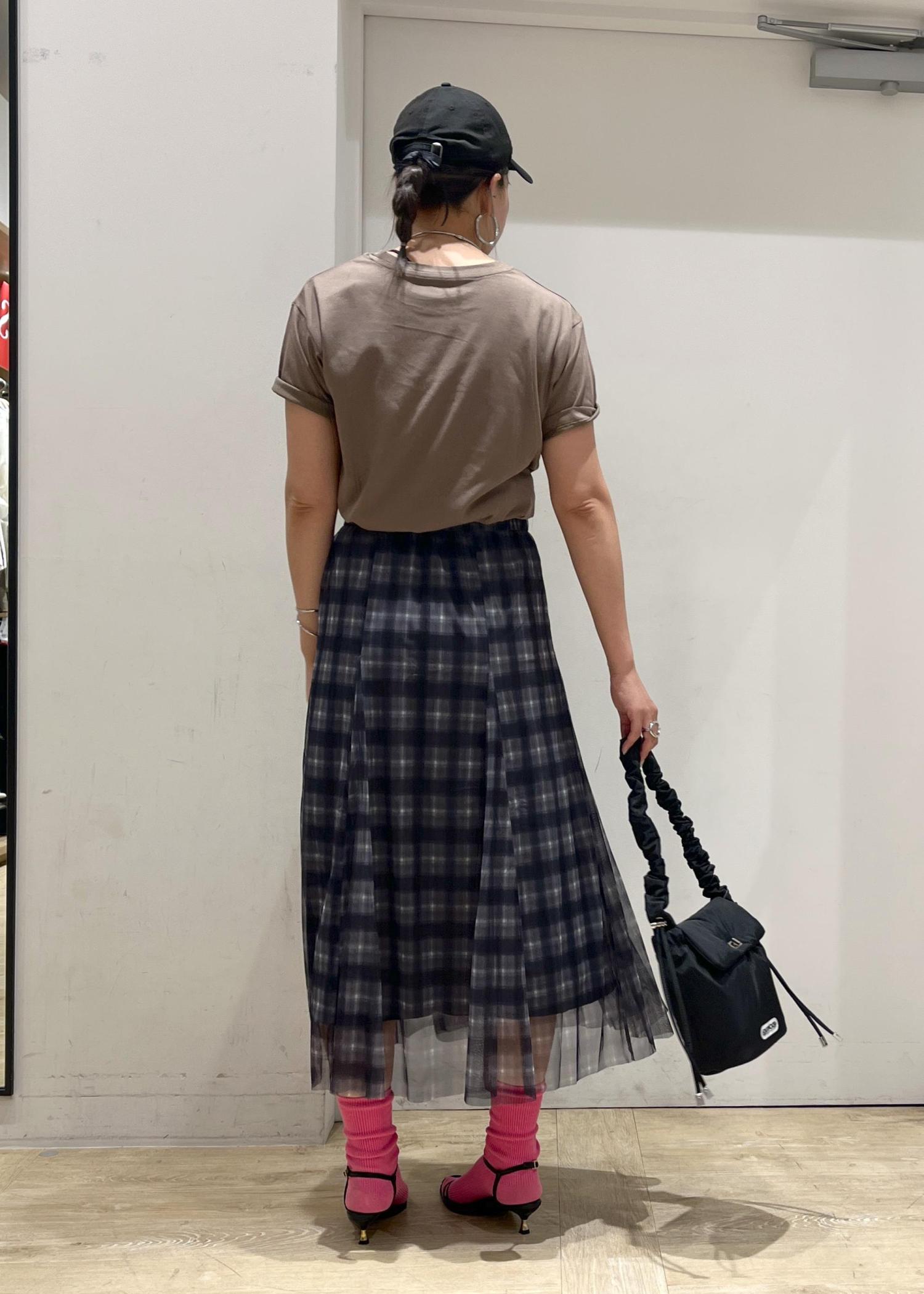 ロゴがポイントになるTシャツにチェックスカートで大人カジュアルコーデ!!
