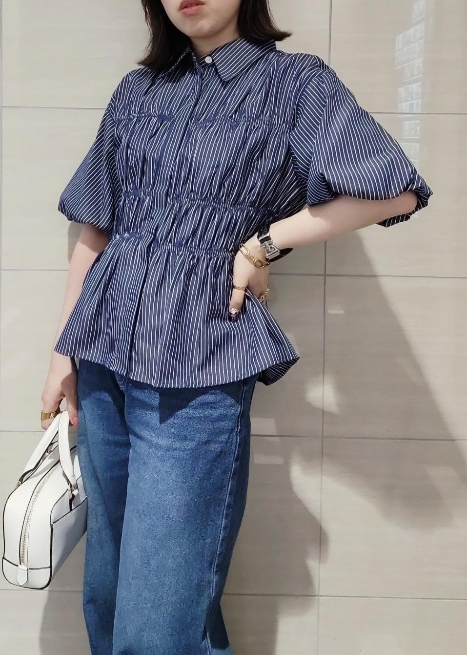 VIS【新色追加】【店頭人気】シャーリングバルーンシャツネイビー系 / F¥5,489レビュートレンドのバルーンスリーブデザインで、お袖丈も二の腕が隠れるほどあるので1枚着として着やすさがあります♪