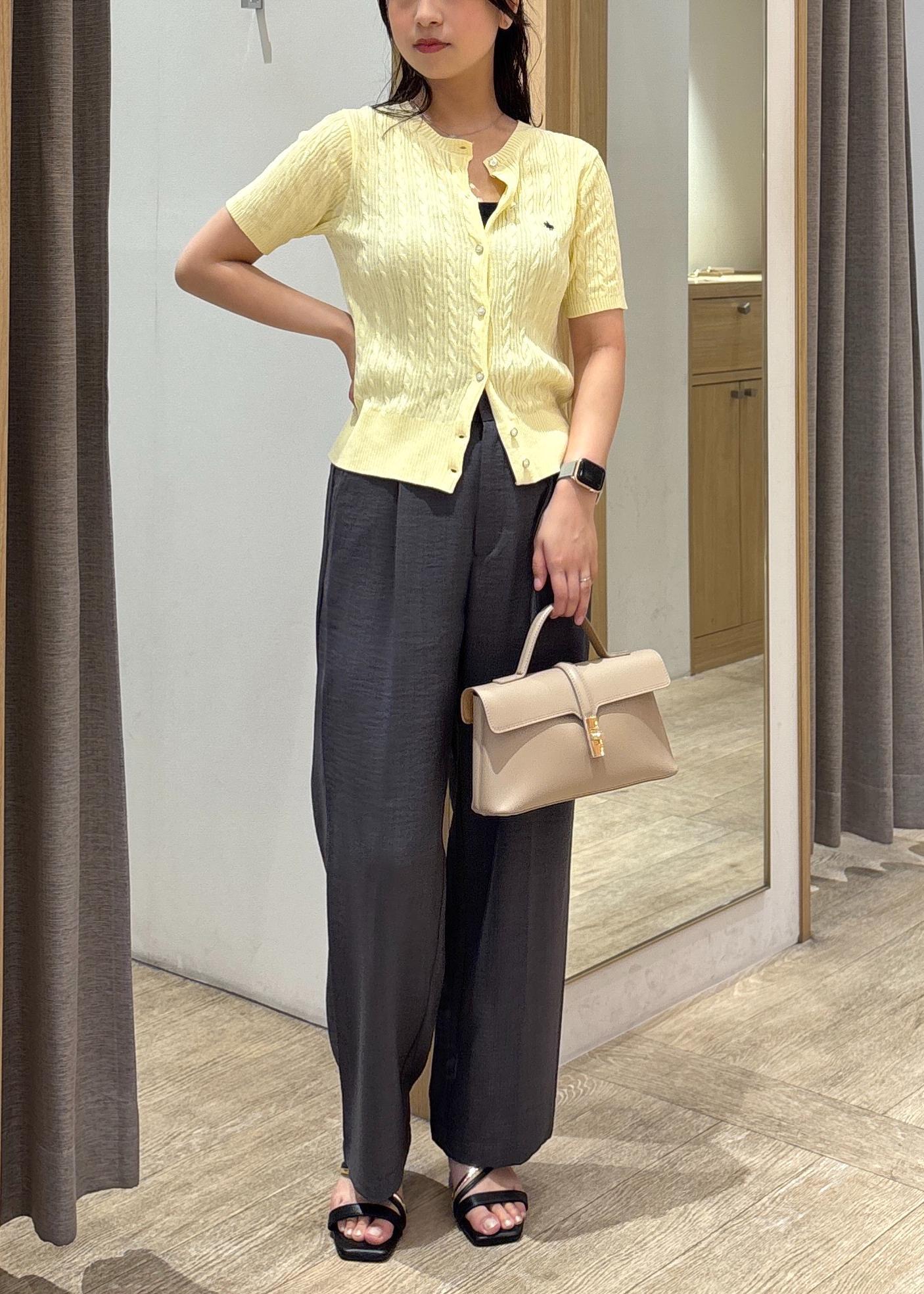 カーディガンのコンパクトなサイズ感と、広がりすぎないワイドパンツで低身長もスタイルアップ◎