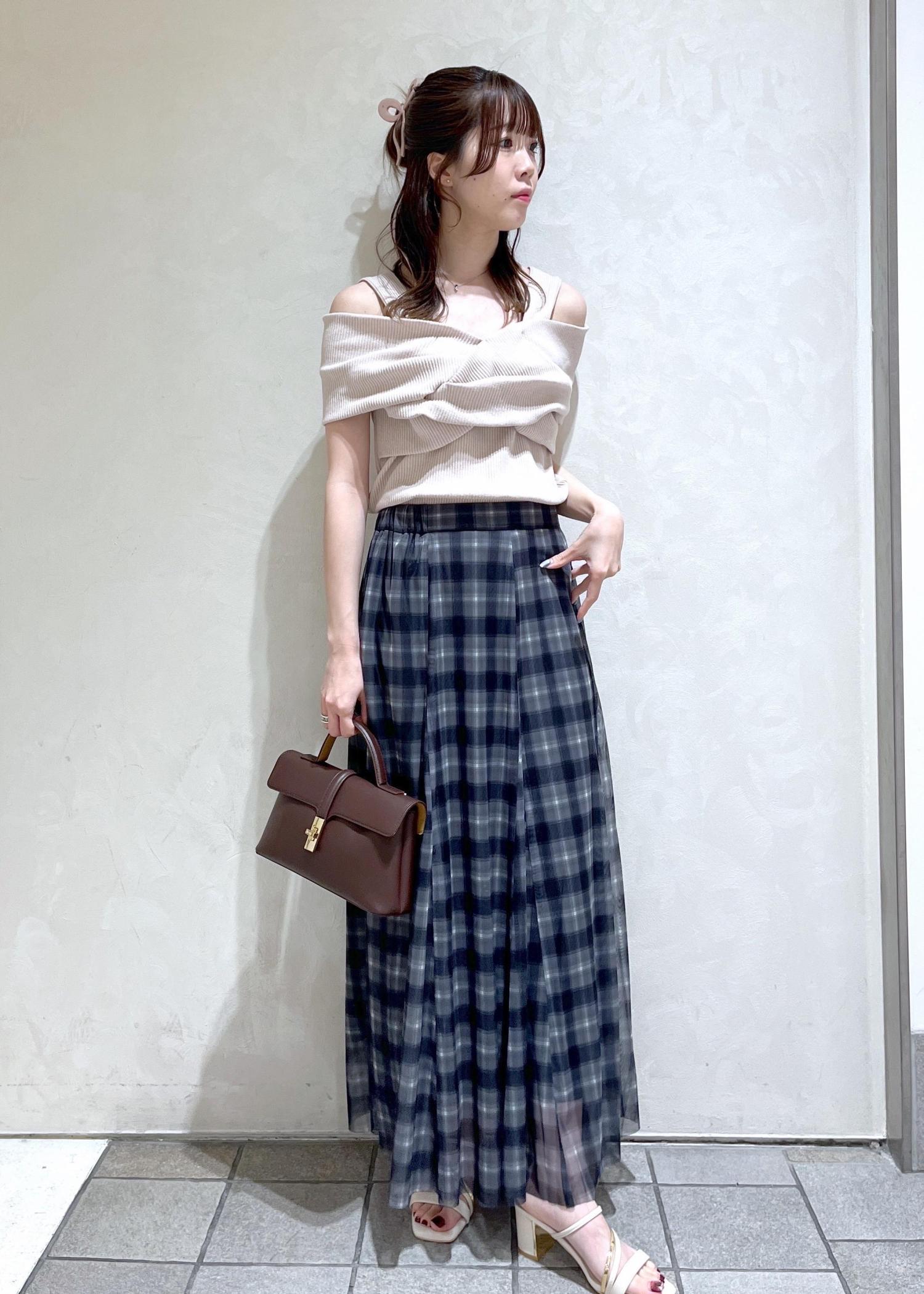 上品に可愛く着れるオフショルのピンクのトップスに、少し秋を感じさせるチェックのシアースカートを合わせてデートコーデを組んでみました!