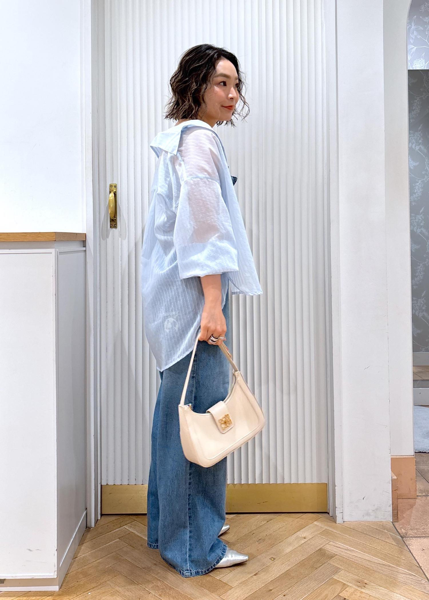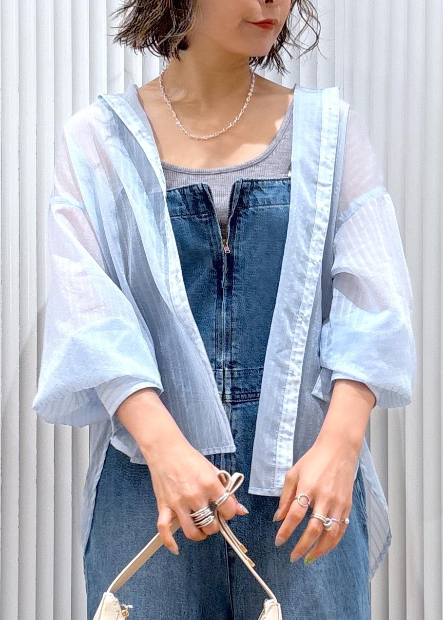 157cm着用だとお尻もすっぽりカバーしてくれる丈感で肌離れが良く、真夏シーズンも羽織りとして丁度良い素材。軽くてサラッとしており、透け感も程よいので大人っぽいコーディネートから綺麗目コーディネートまで幅広く活躍します。 -