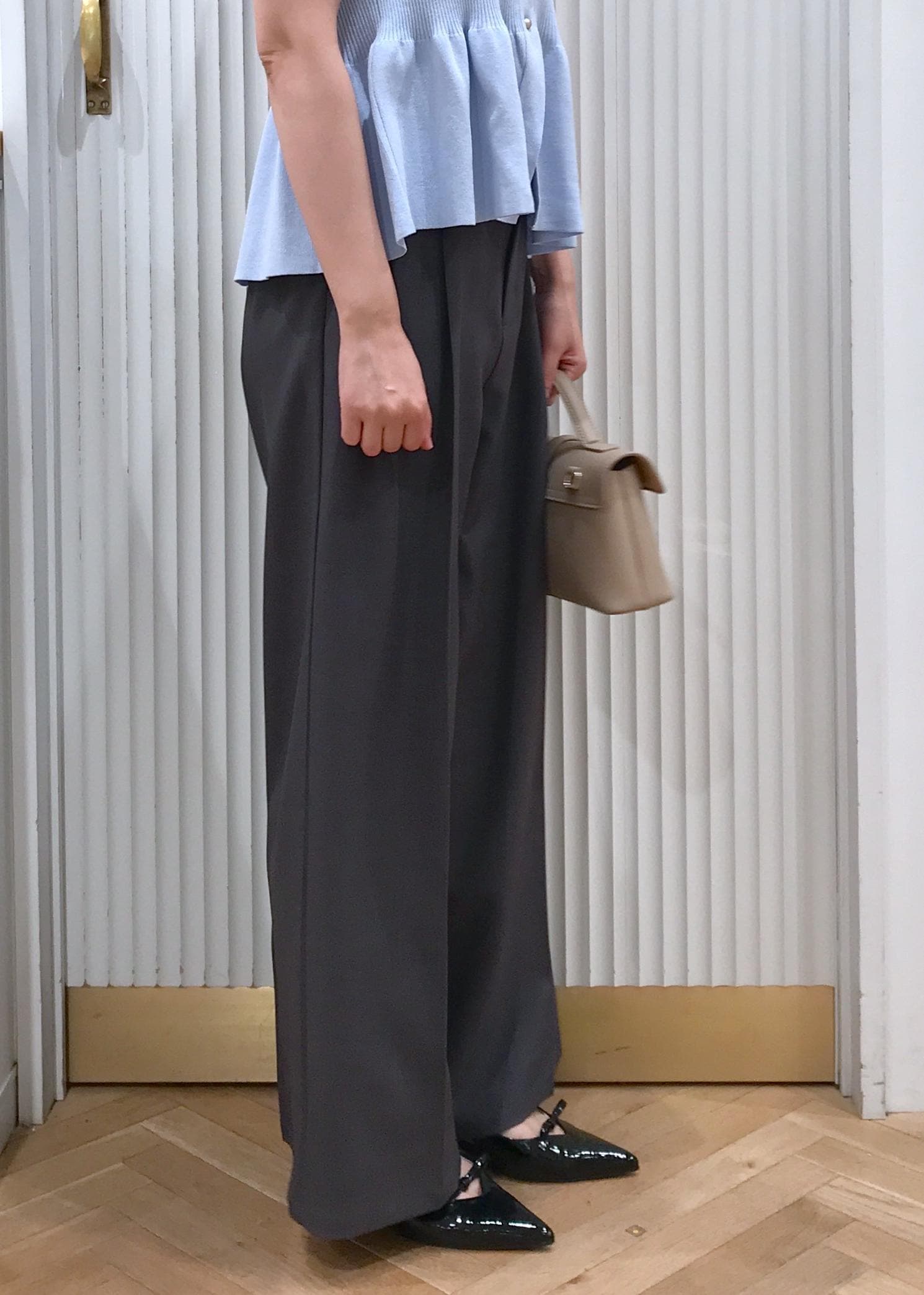 身幅はややタイト目ですが、腰上辺りにペプラムの切り替えがあるのでスッキリしたラインで着用出来ます。 -
