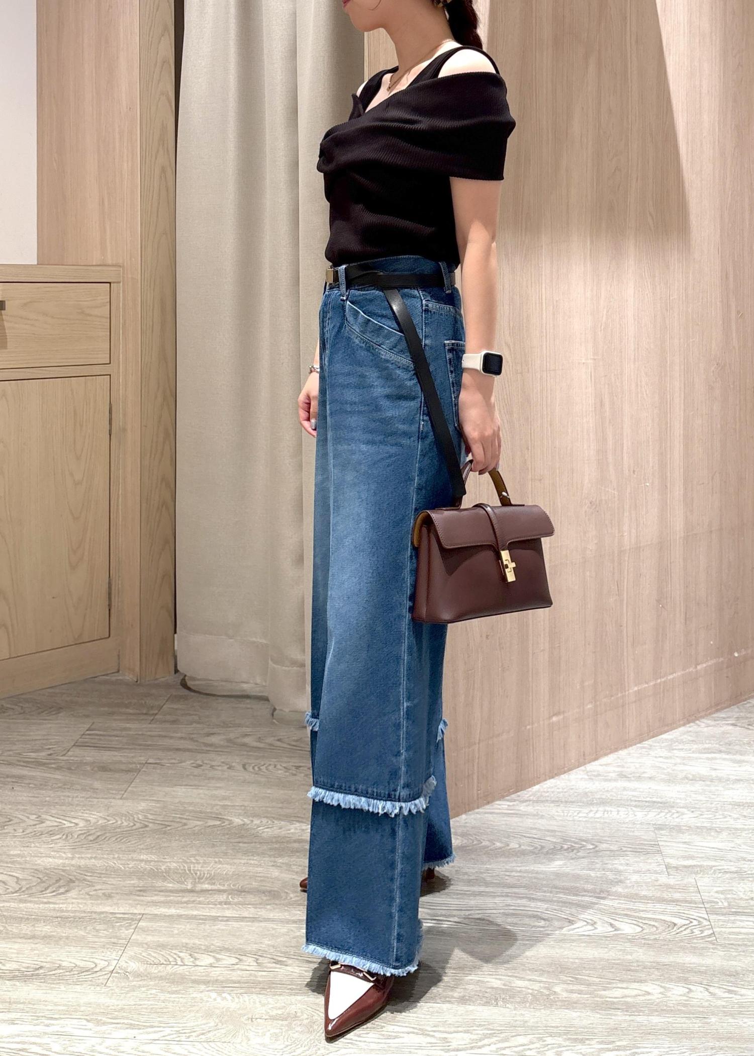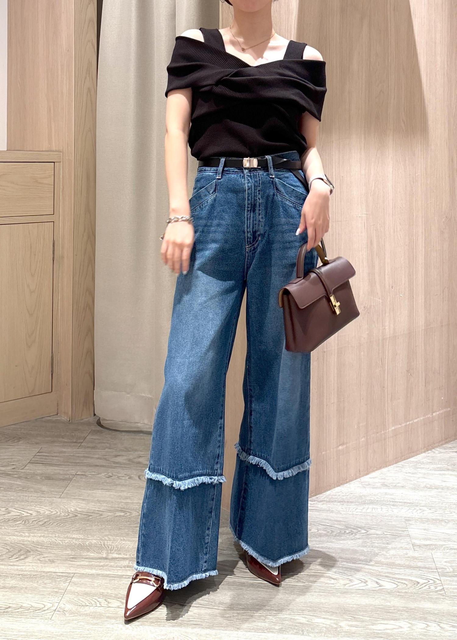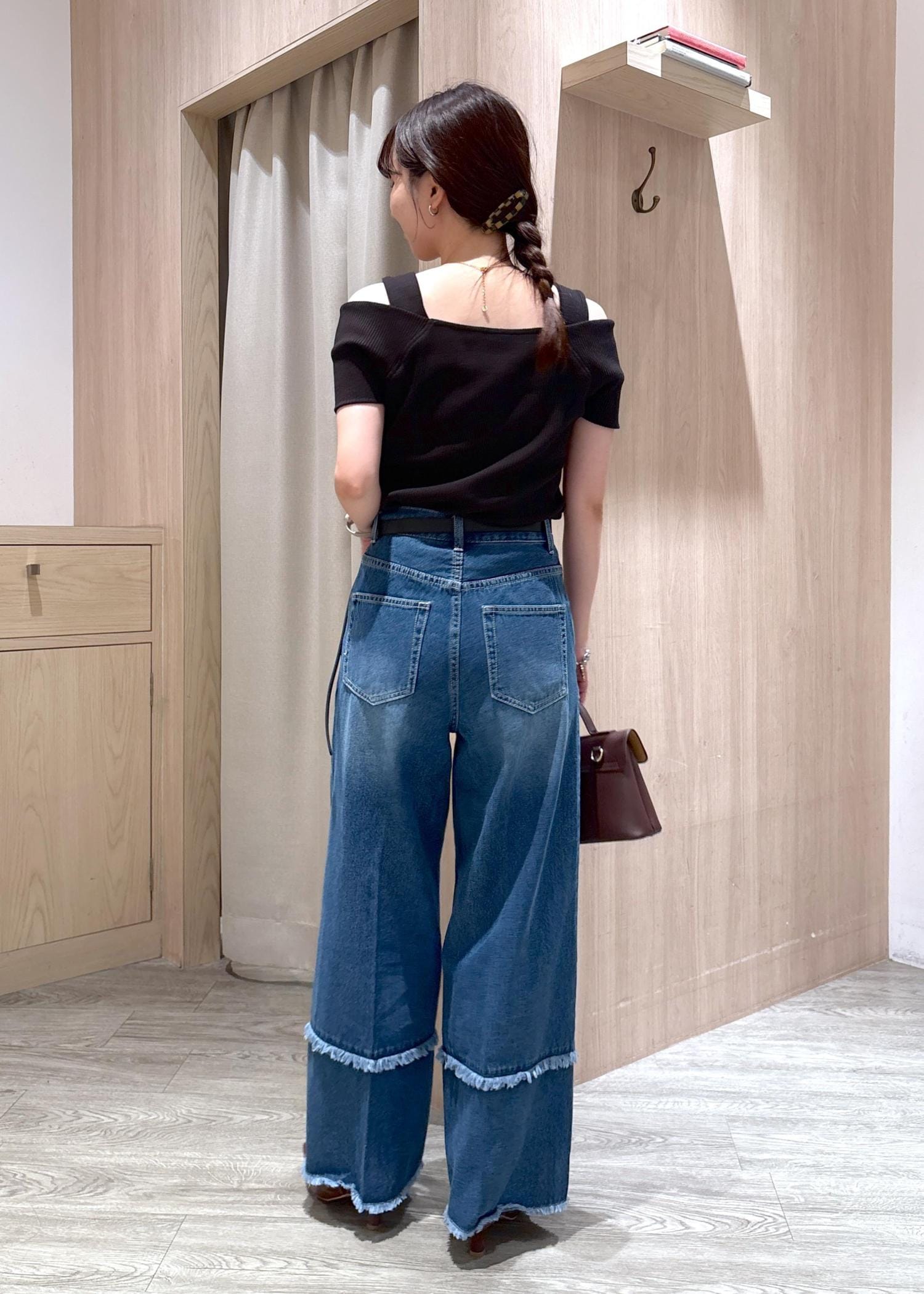 VISフリンジフレアデニムブルー系 / S¥4,395レビューSサイズで靴無しでも下にギリギリ付かない丈の長さです。綺麗なワイドタイプで、体のラインも拾わず、とてもスタイル良く見せてくれます◎