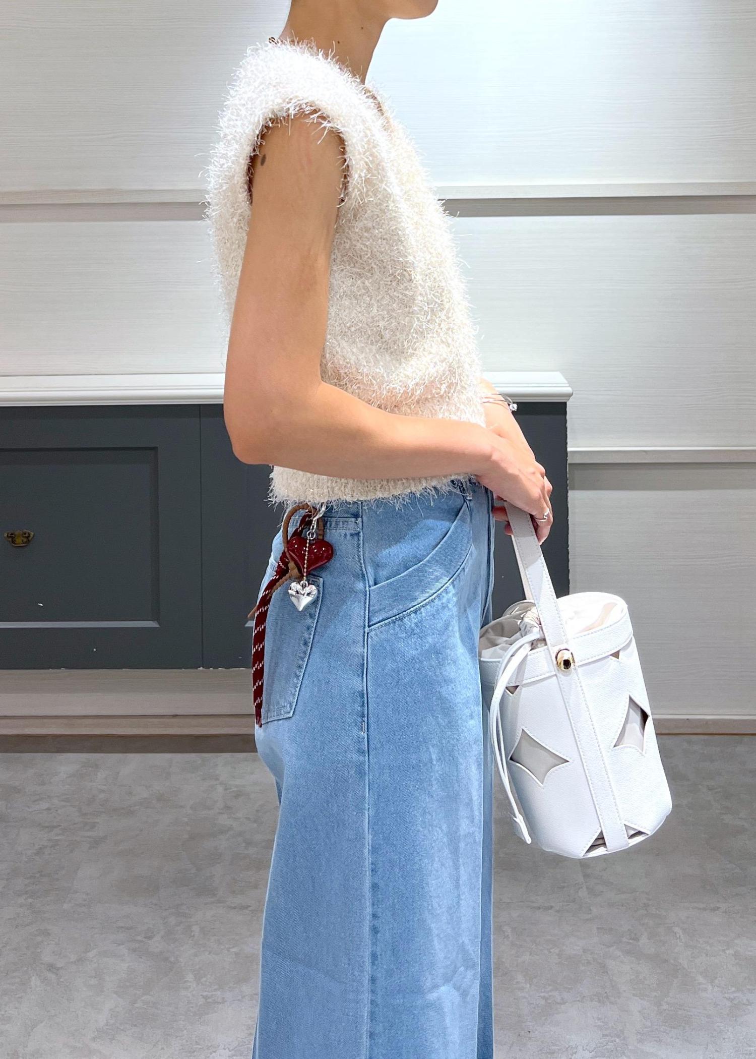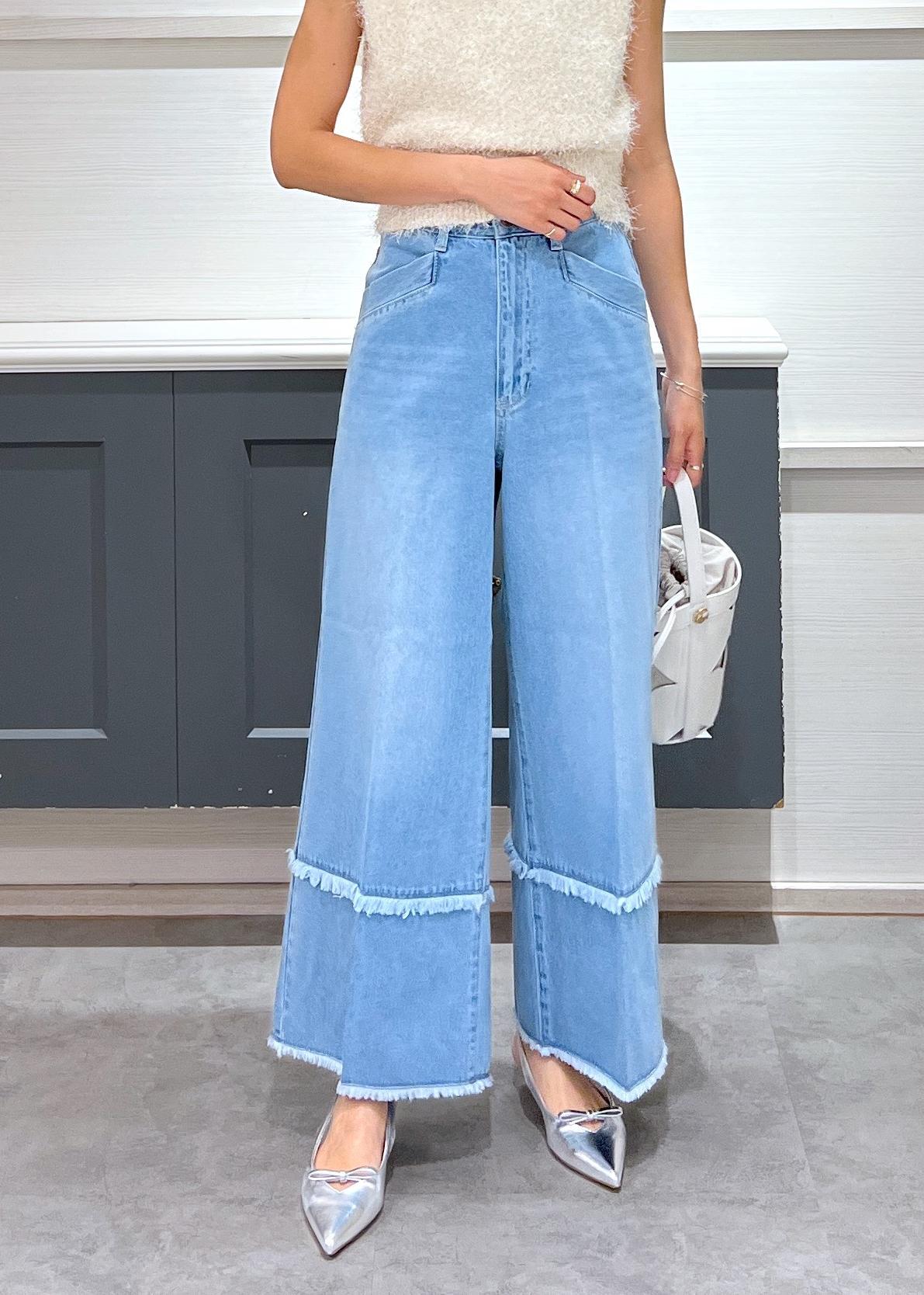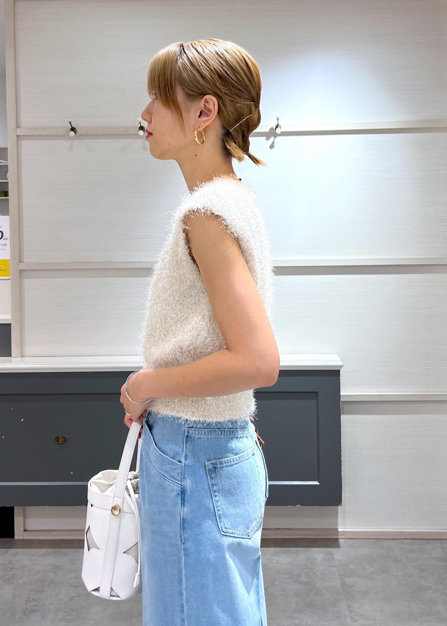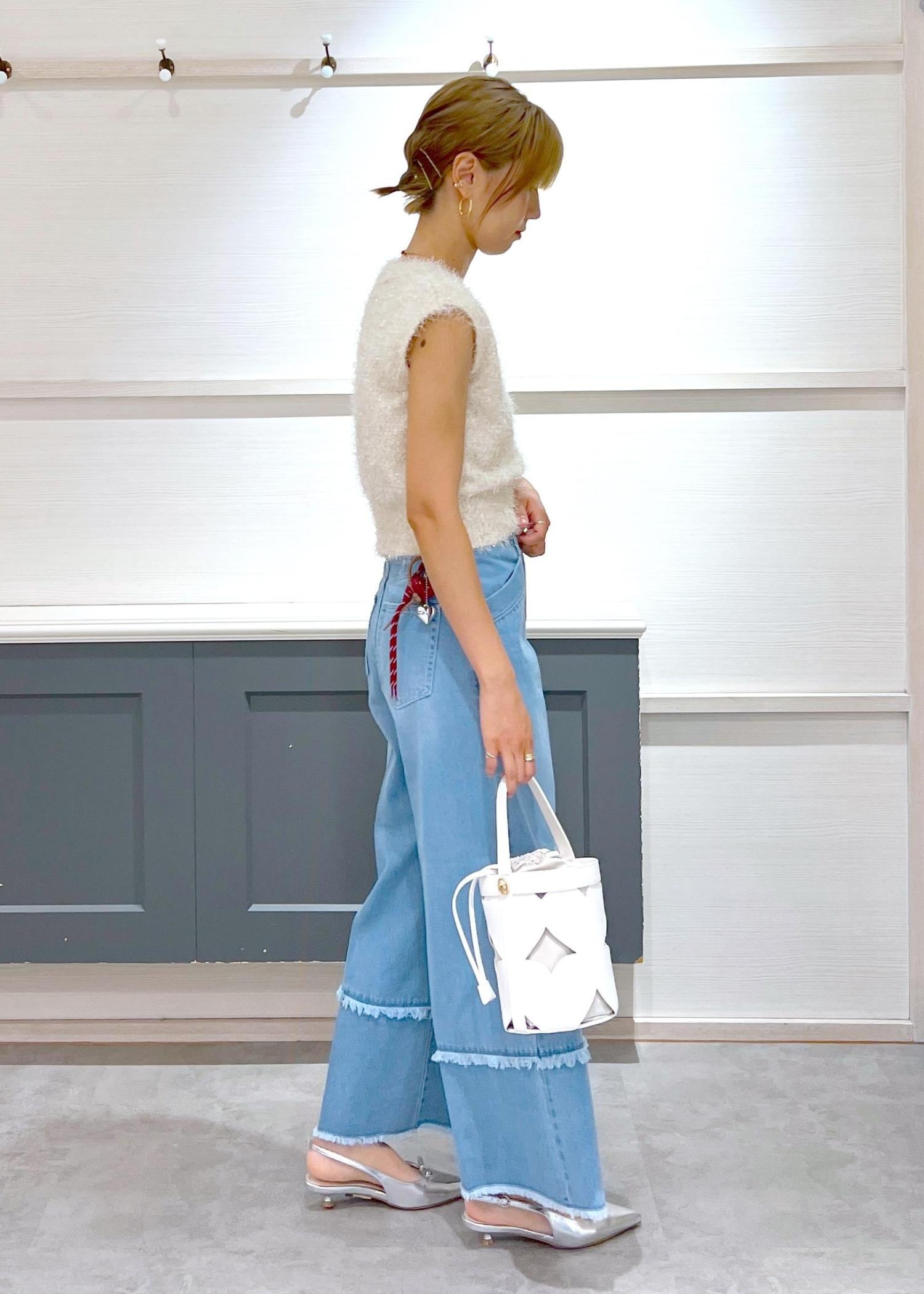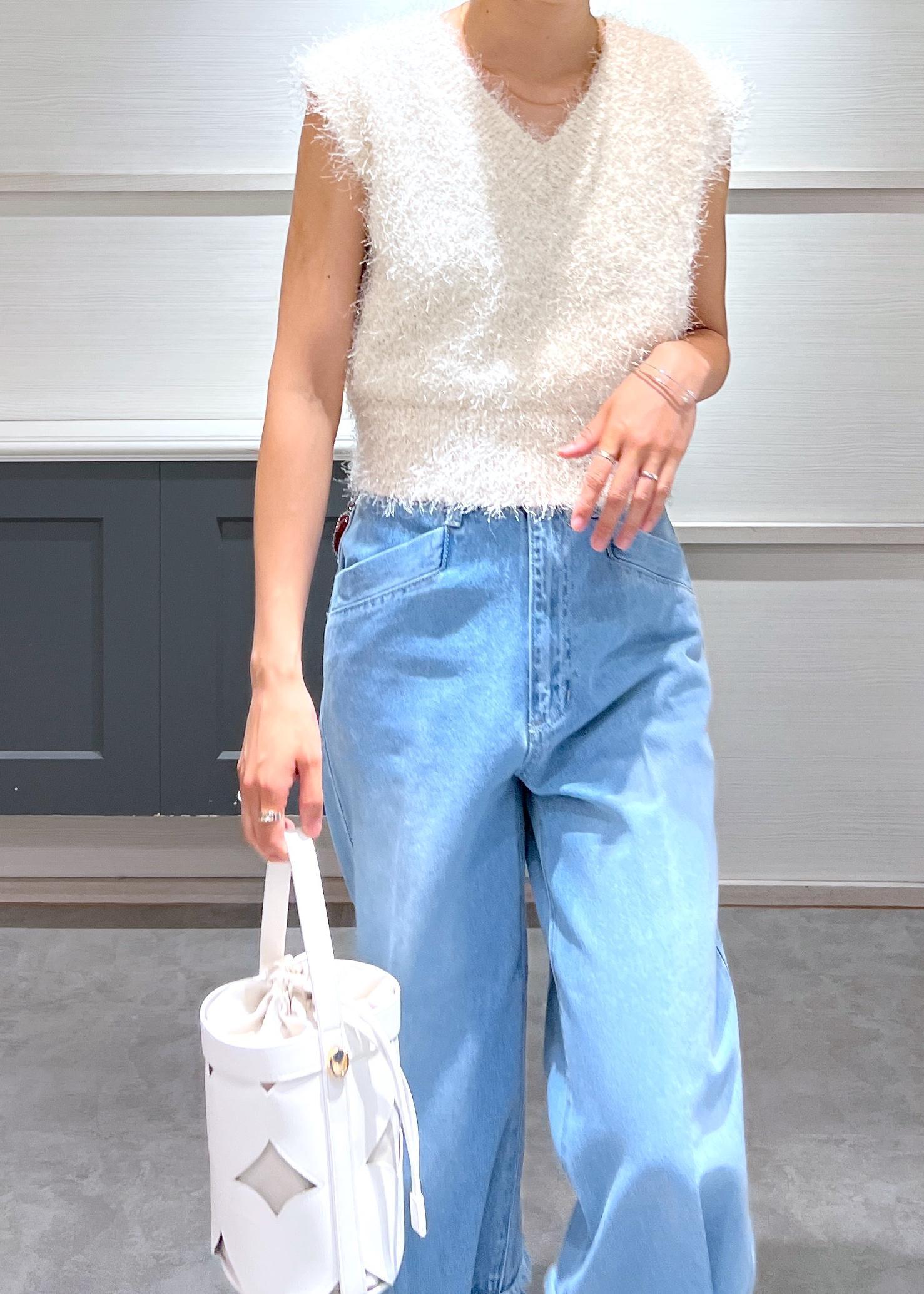 ふわっとしたフェザーヤーントップスに、フリンジデザインのワイドデニムを合わせた、リラックス感たっぷりのカジュアルコーデ。