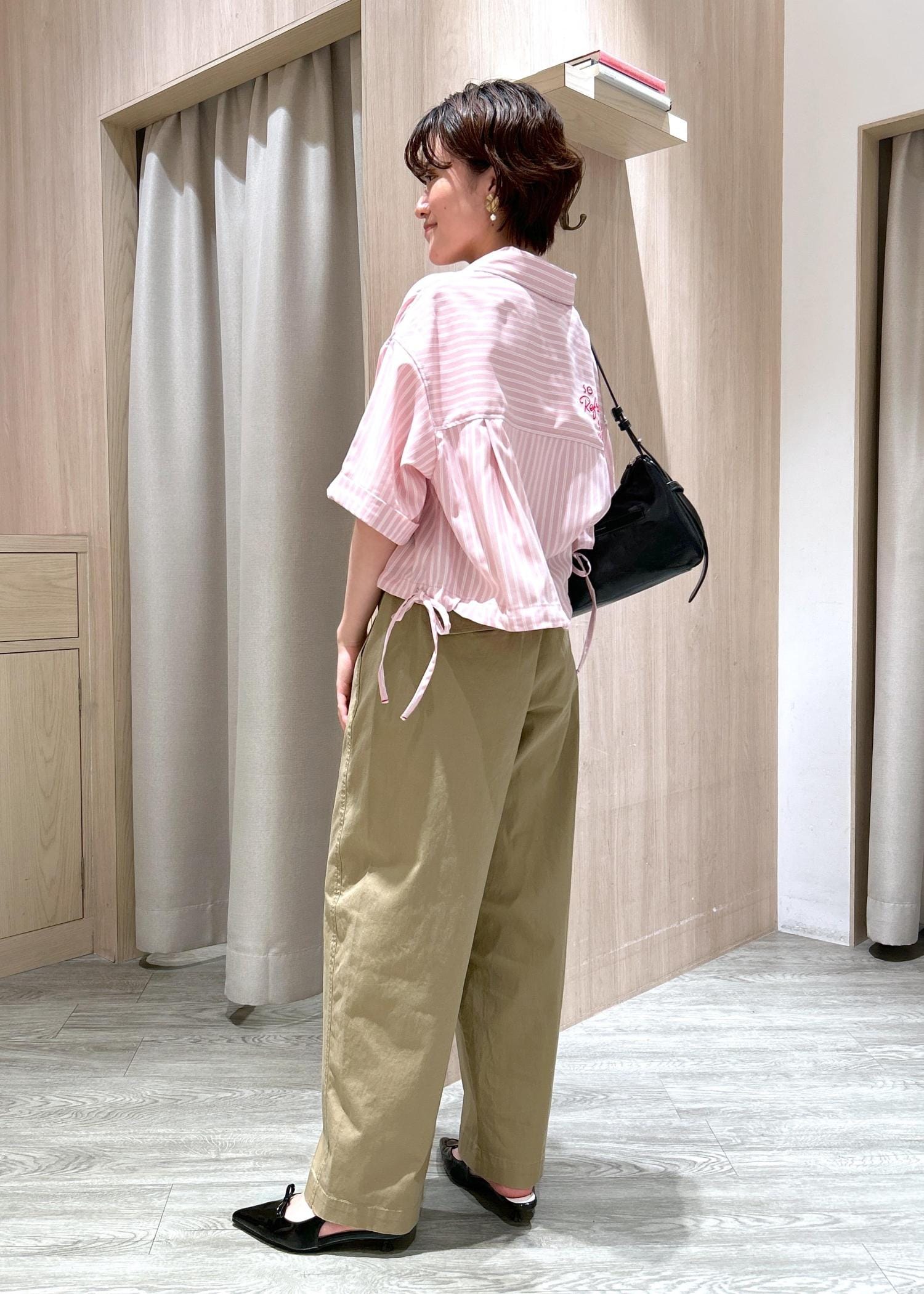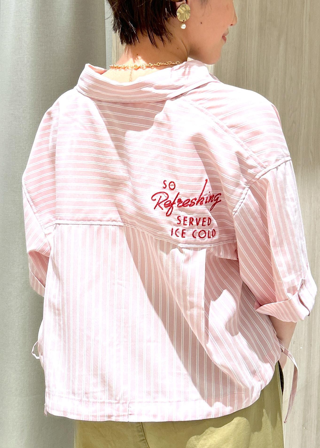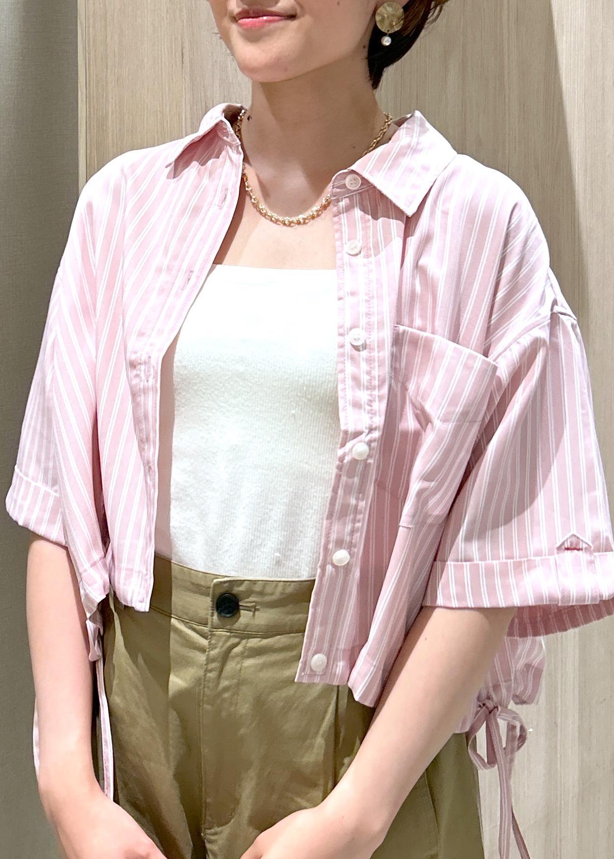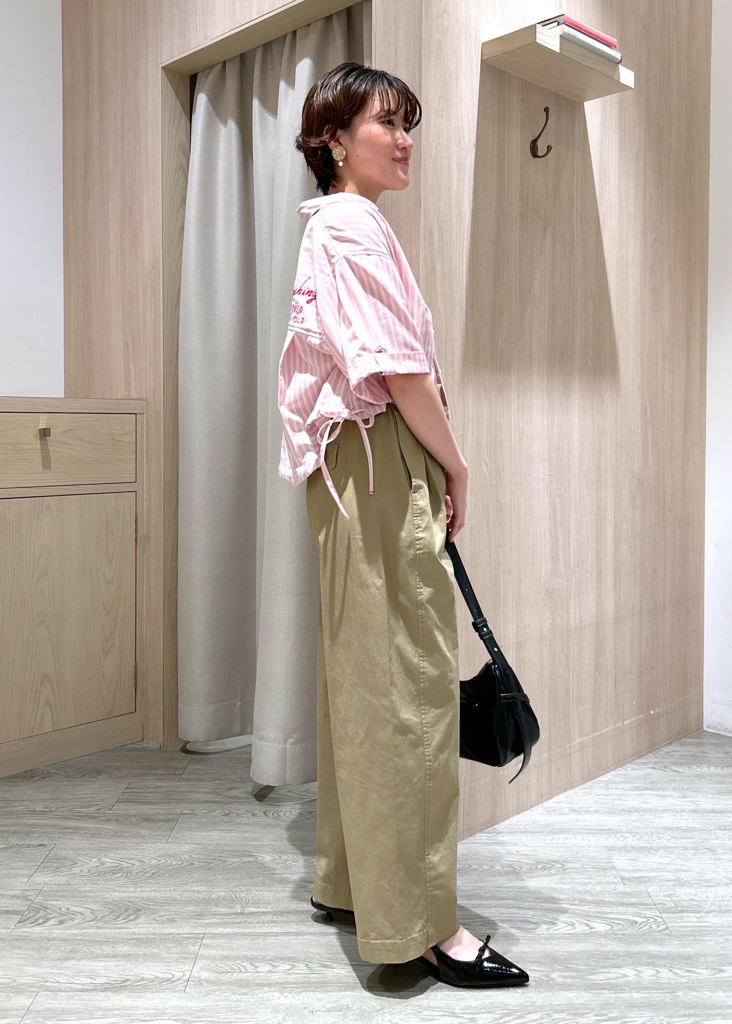 ピンクのストライプシャツ×ベージュのパンツを合わせ、柔らかい印象のコーデにしました!