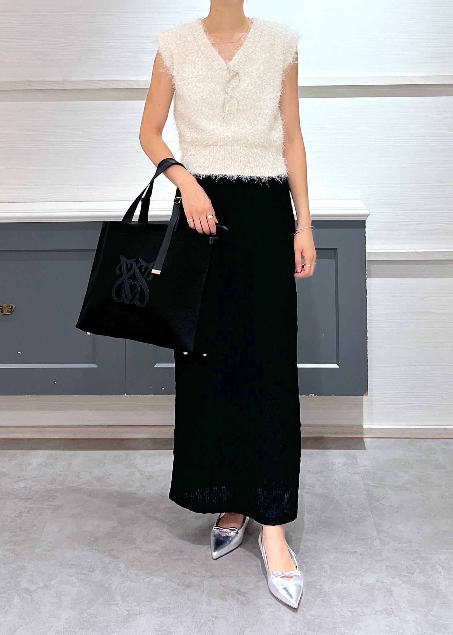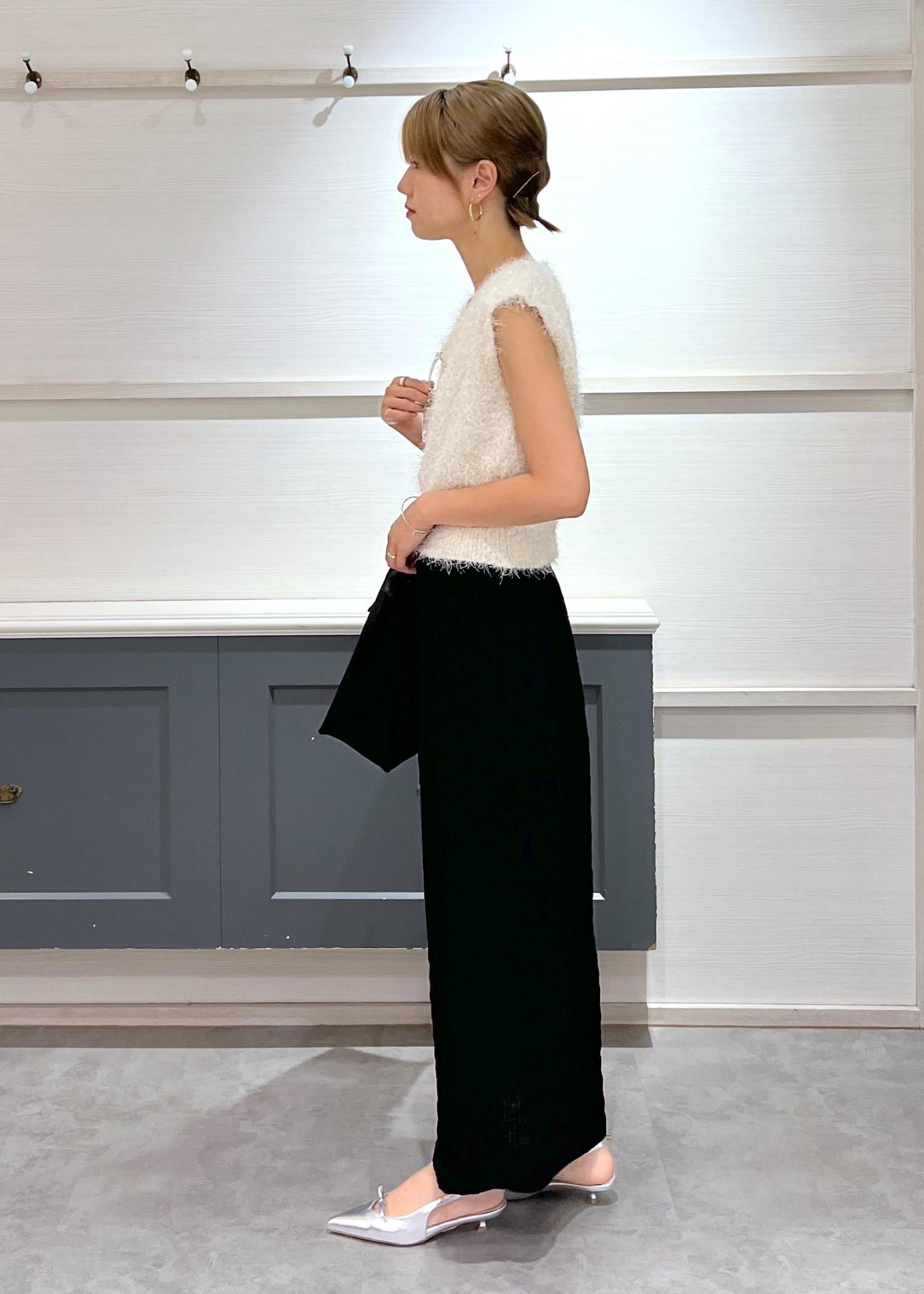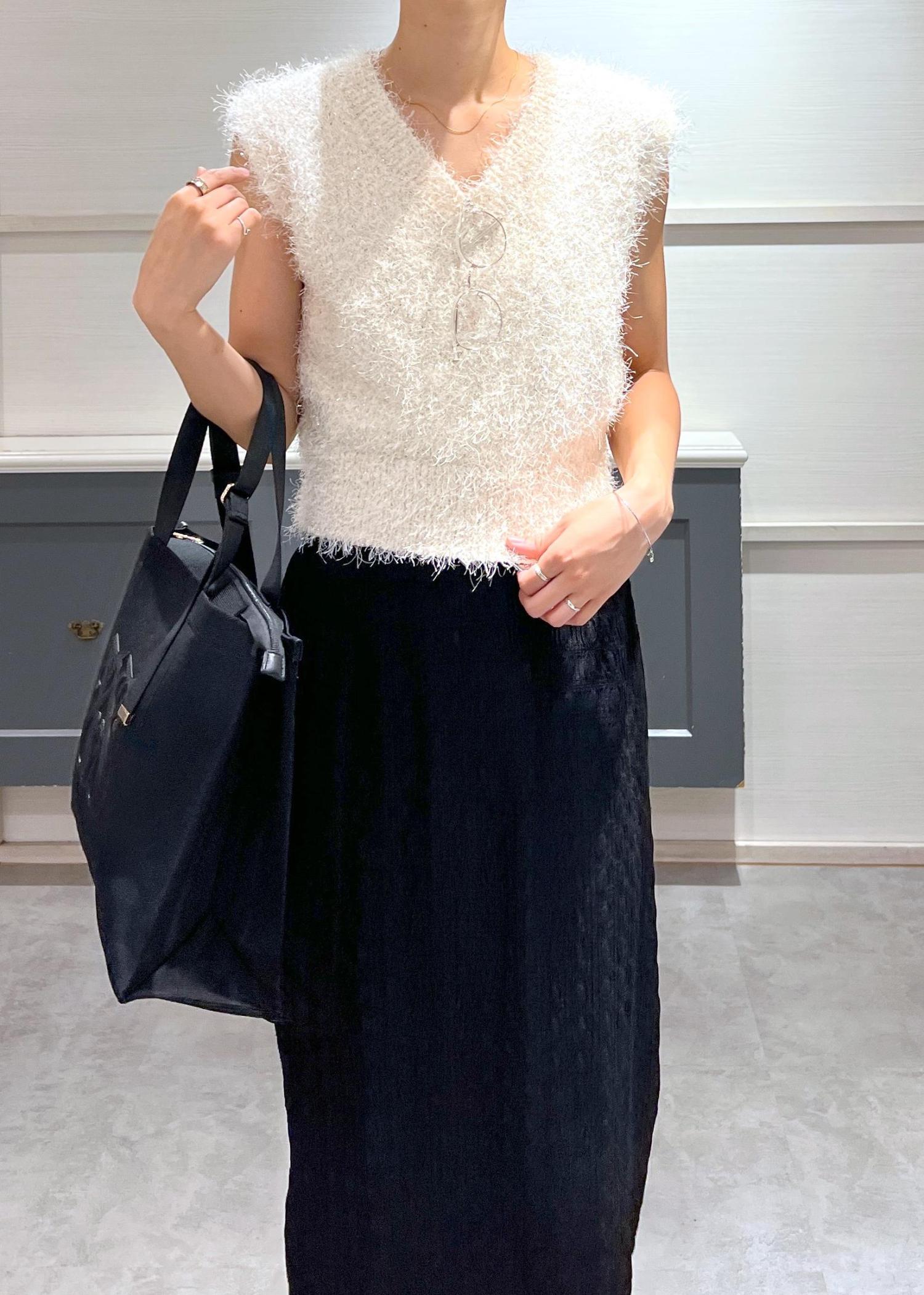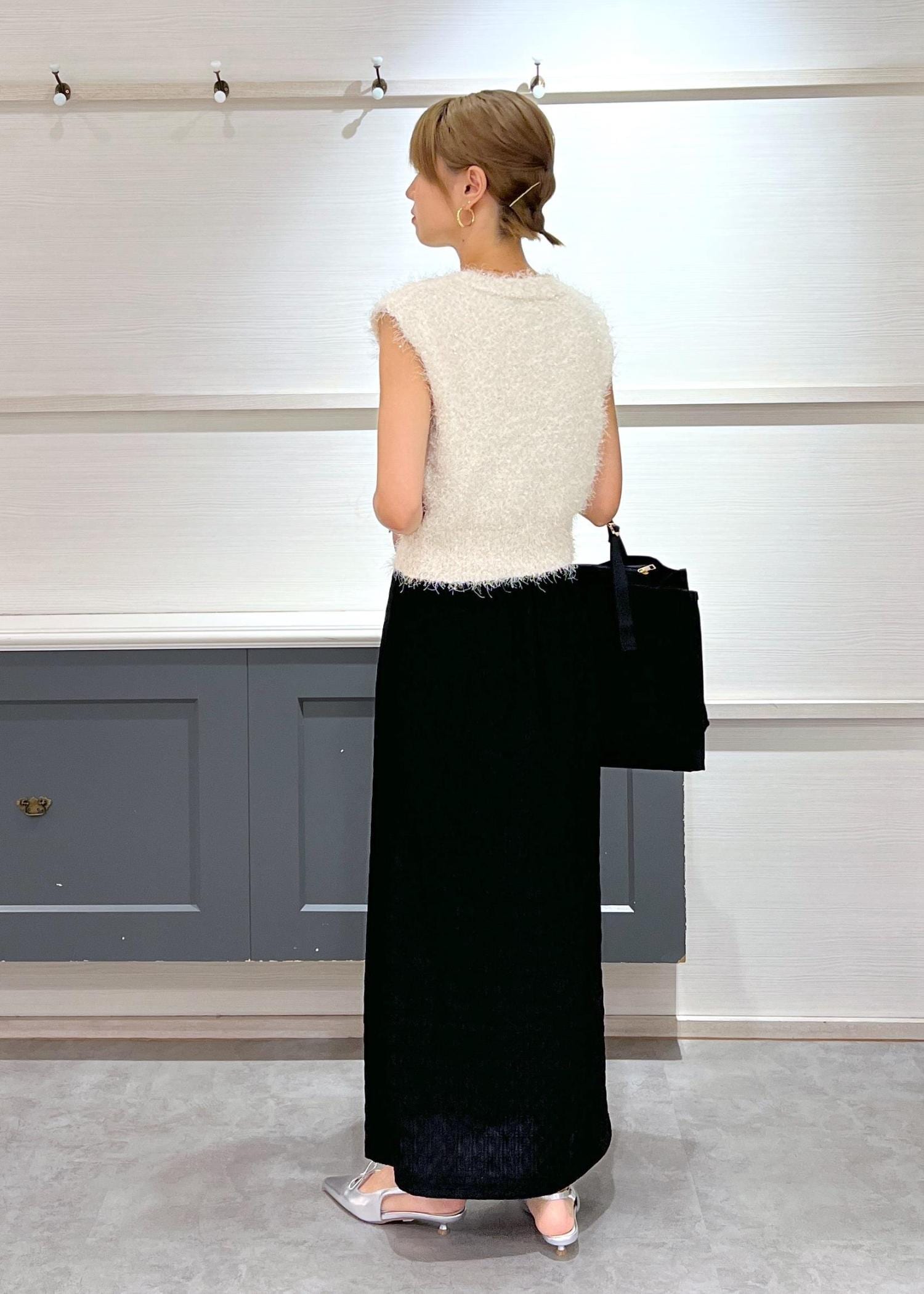 ふわっとしたフェザーニットベストと、こなれ感のあるブラックスカートの異素材コーデで、大人の余裕を感じるモノトーンスタイルに。