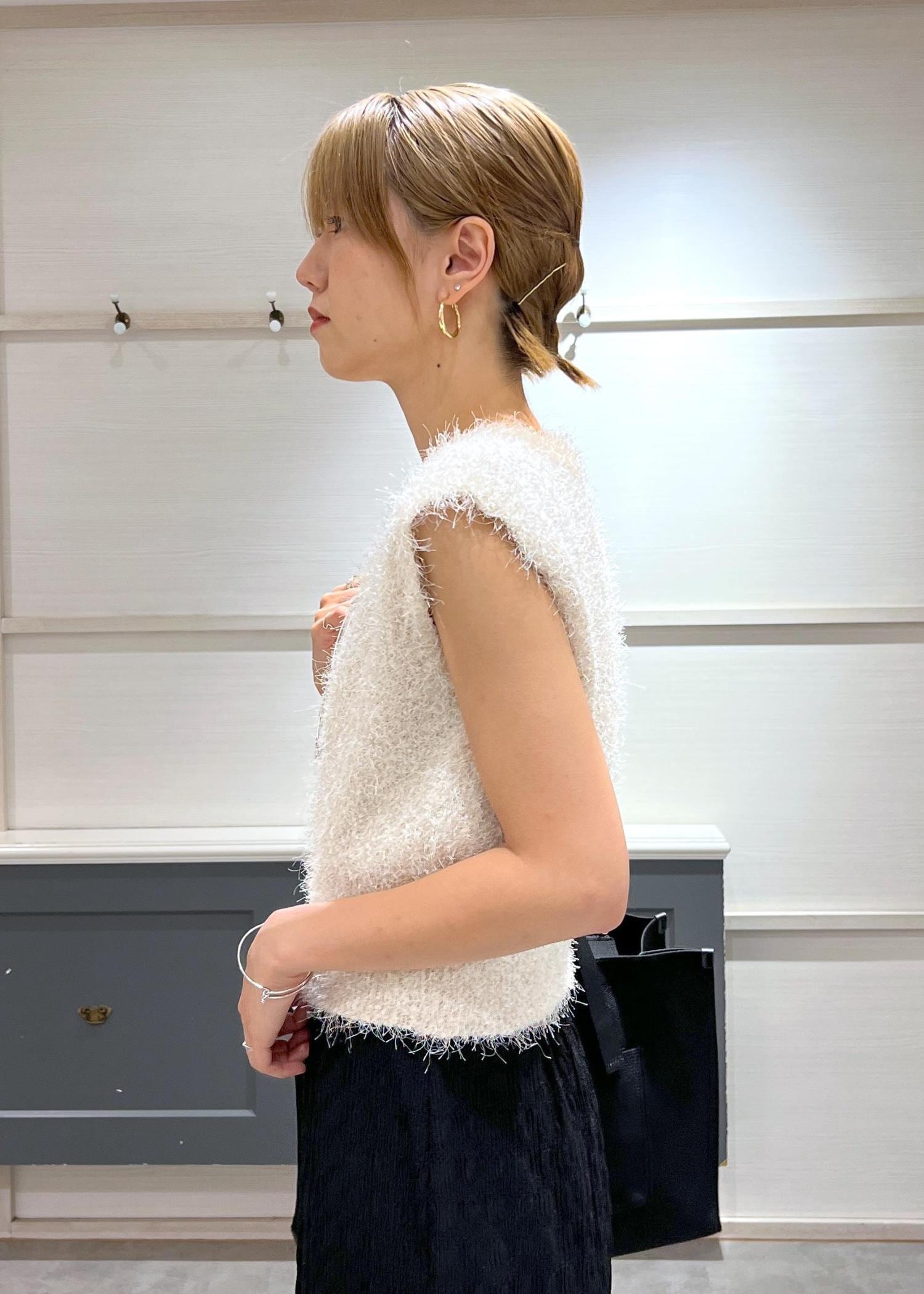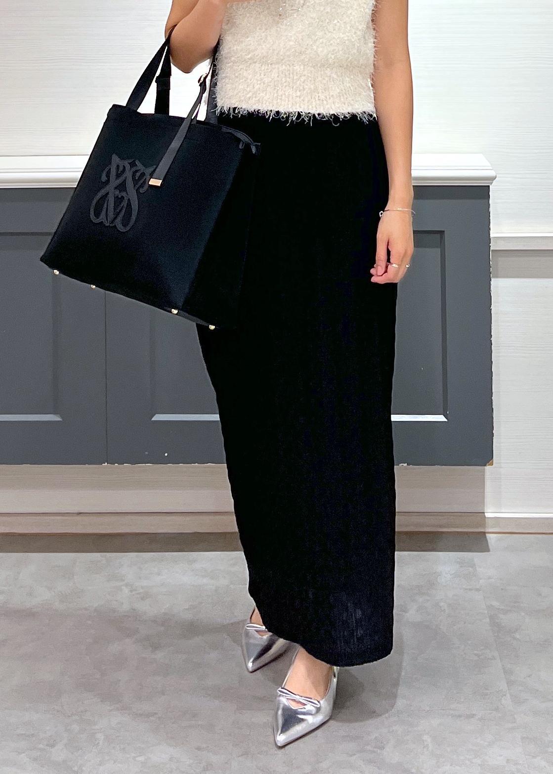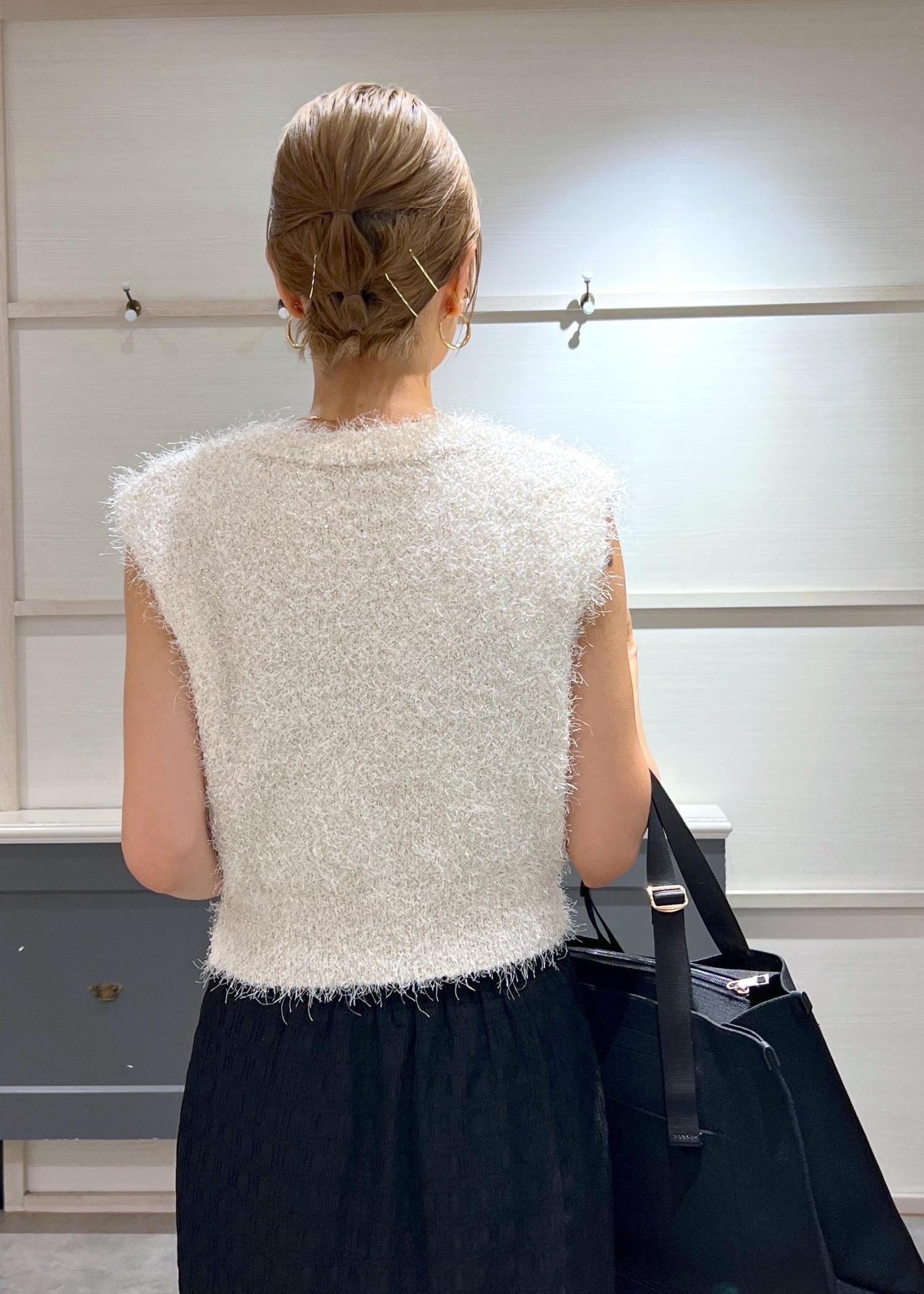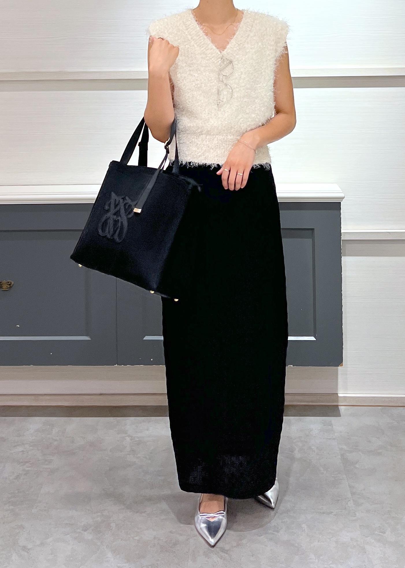 ふわっとしたフェザーニットベストと、こなれ感のあるブラックスカートの異素材コーデで、大人の余裕を感じるモノトーンスタイルに。