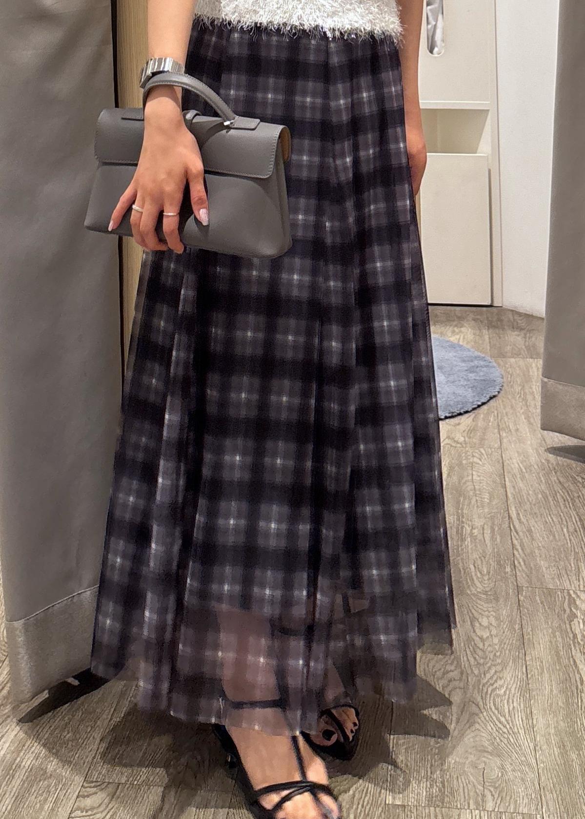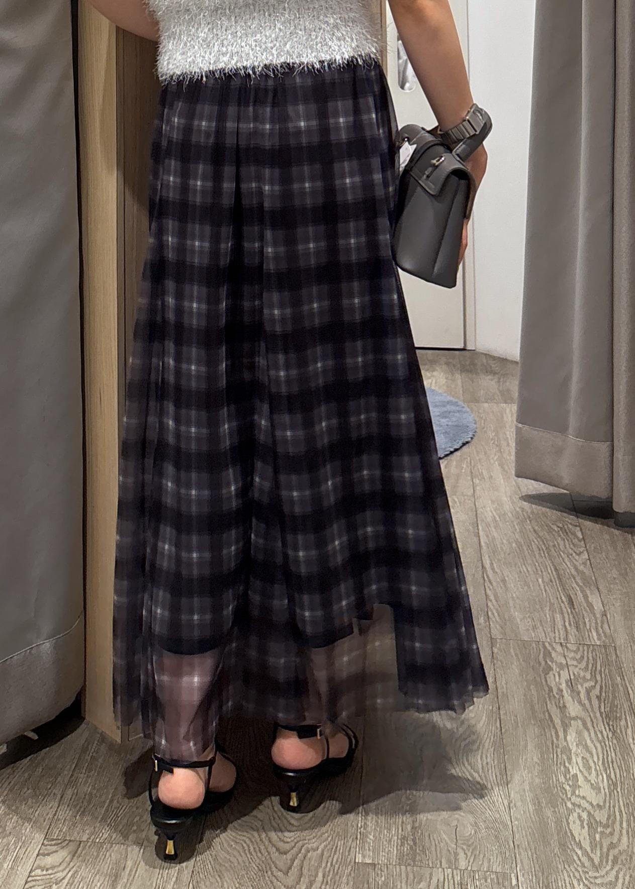 VIS【洗える】チュールプリントチェックスカートブラック系 / F¥3,953レビュートレンドのチェック柄スカート。