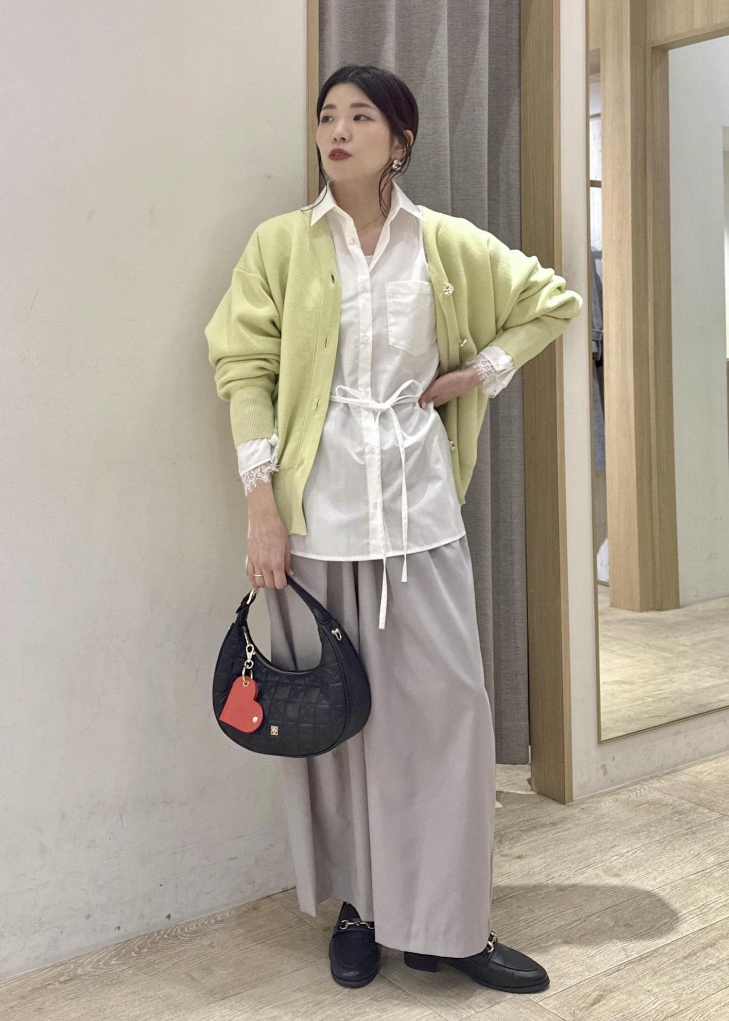 パンツは裾にボリュームがあるので、トップスはコンパクトなものと合わせると低身長もスタイルアップします。